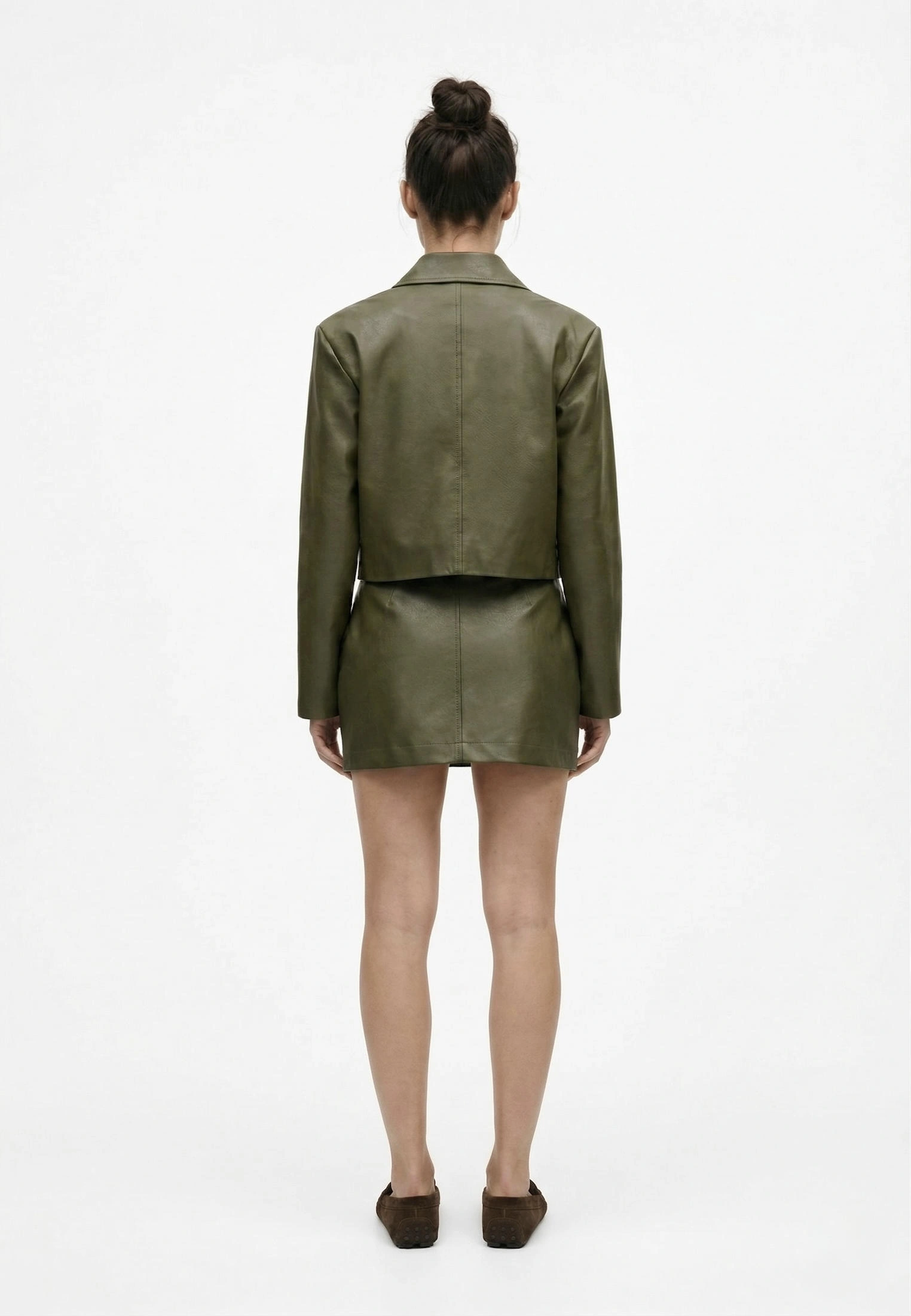 Куртка укороченная из экокожи с накладными карманами