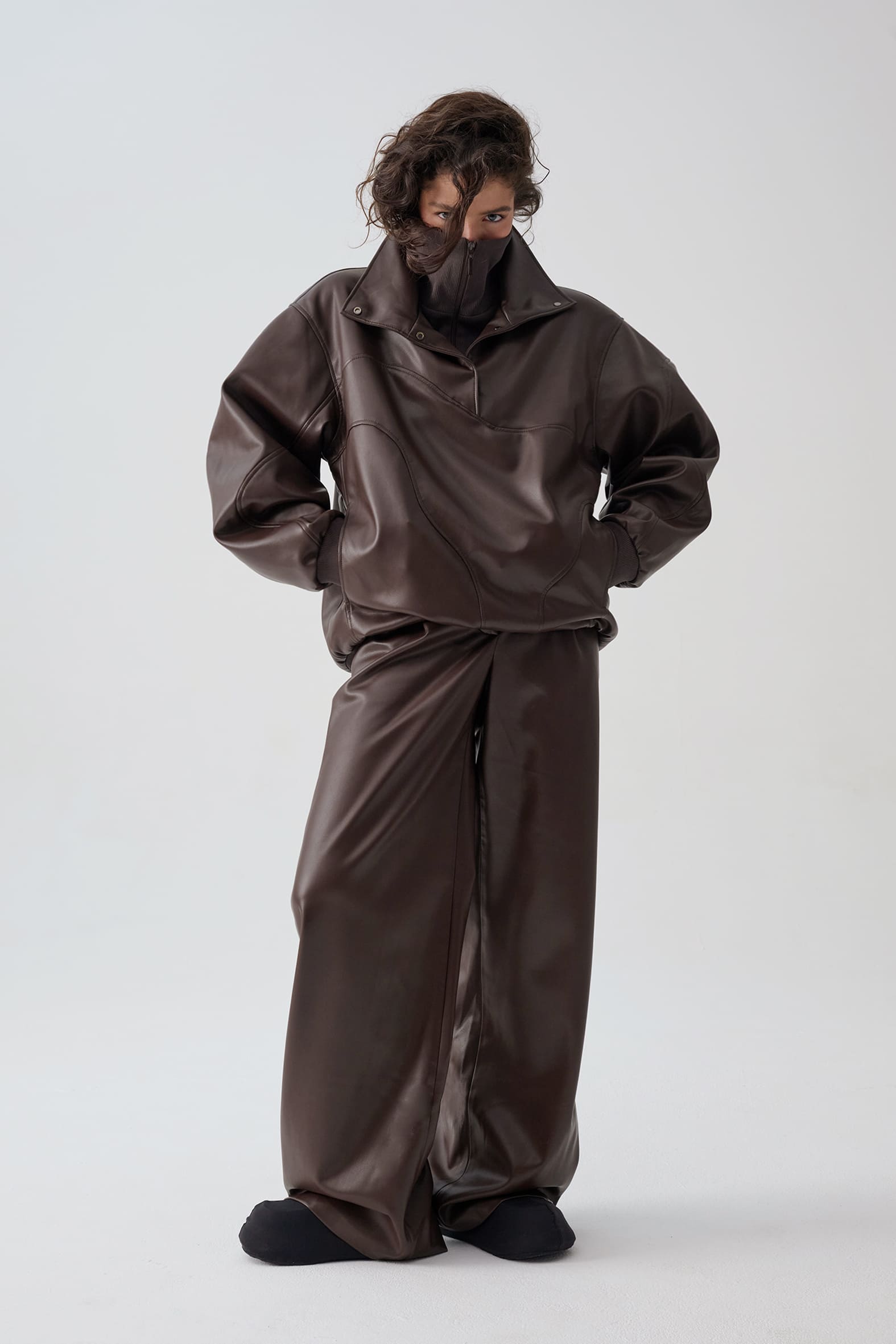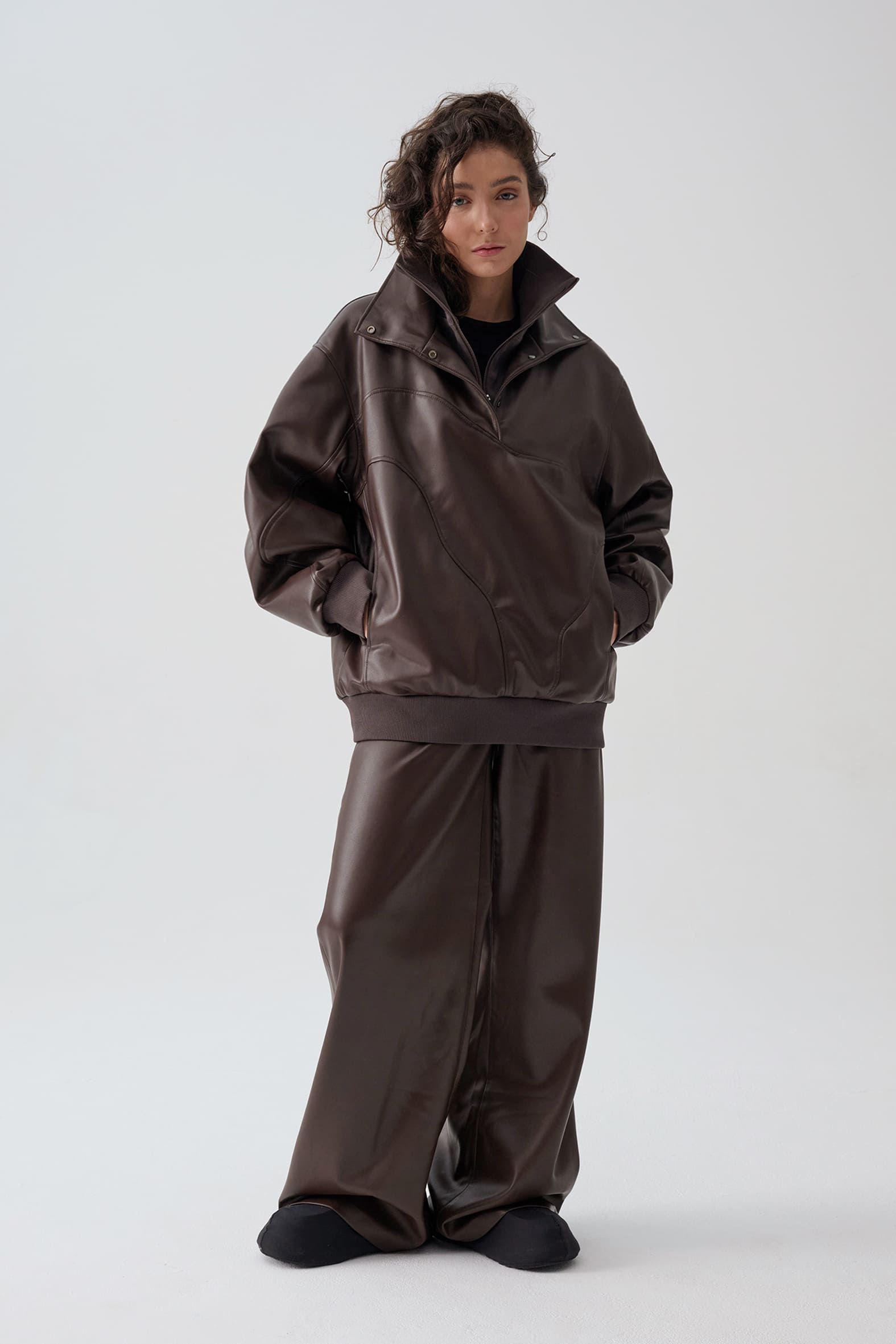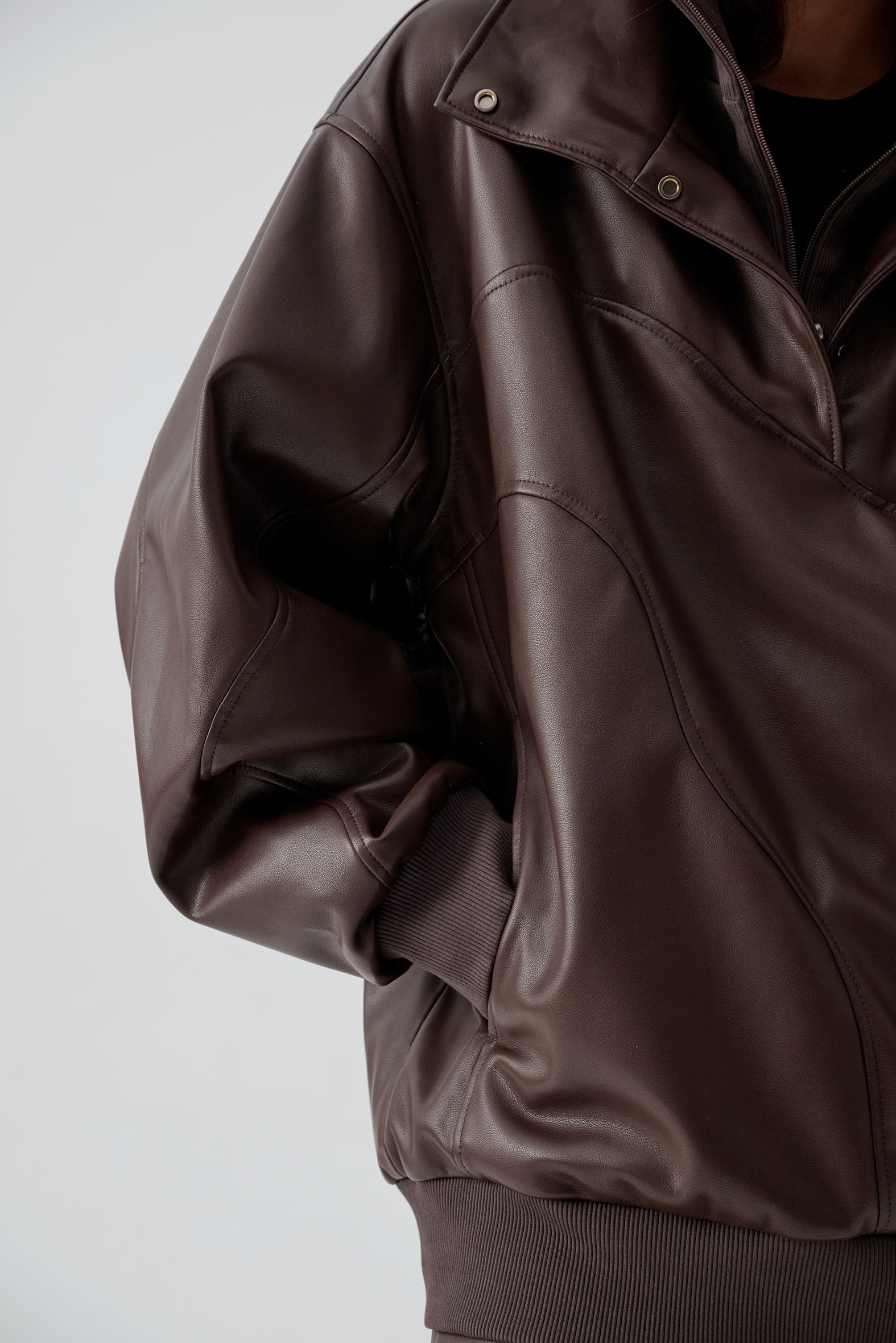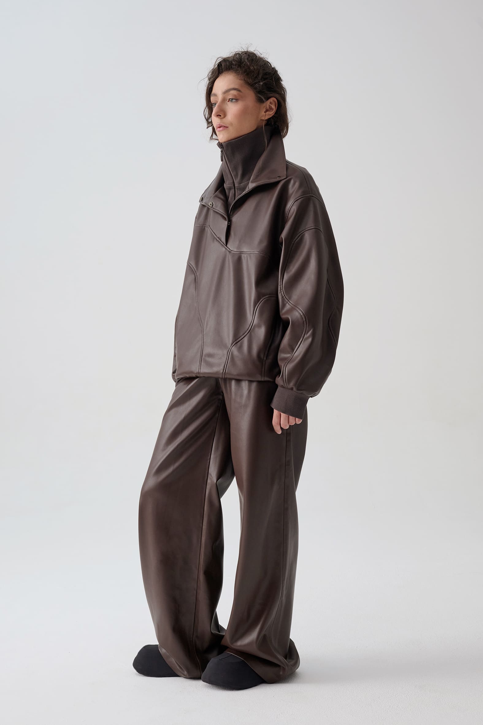 Куртка анорак из экокожи приятного оттенка горький шоколад. Свободный прямой крой, волнистые линии резов подчеркивают ощущение пластичности формы и создают «живописную» детализацию., функциональные детали - воротник стойка и манжеты из трикотажа в рубчик.