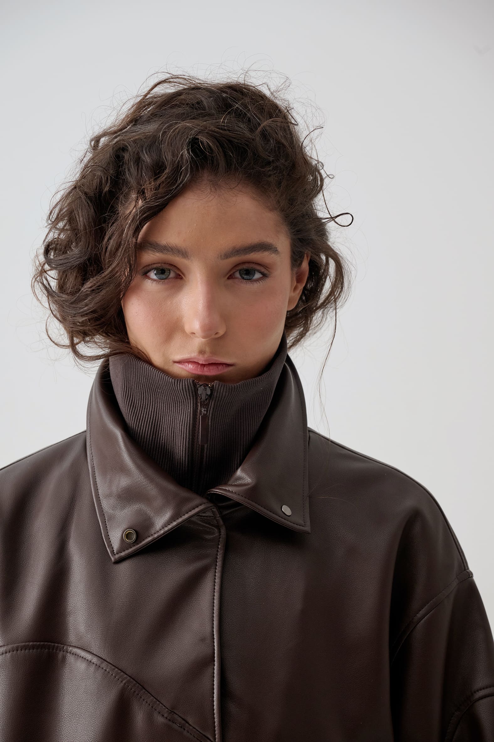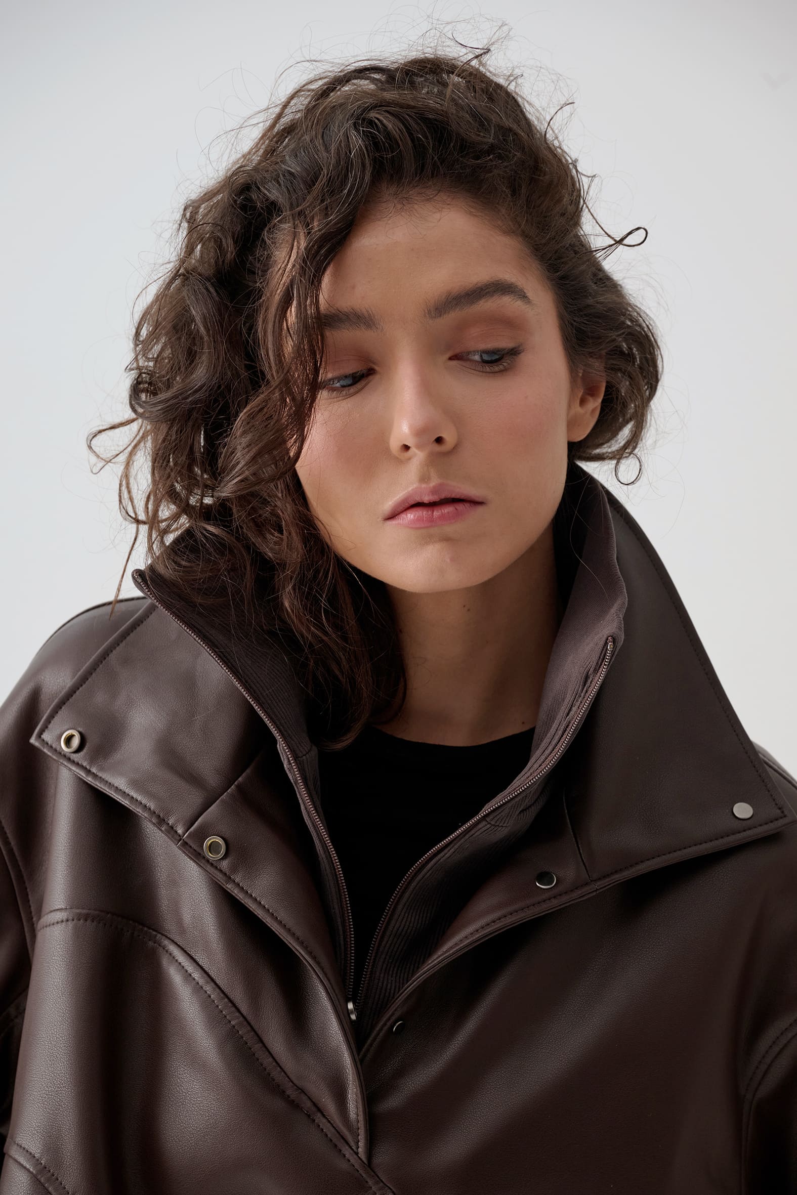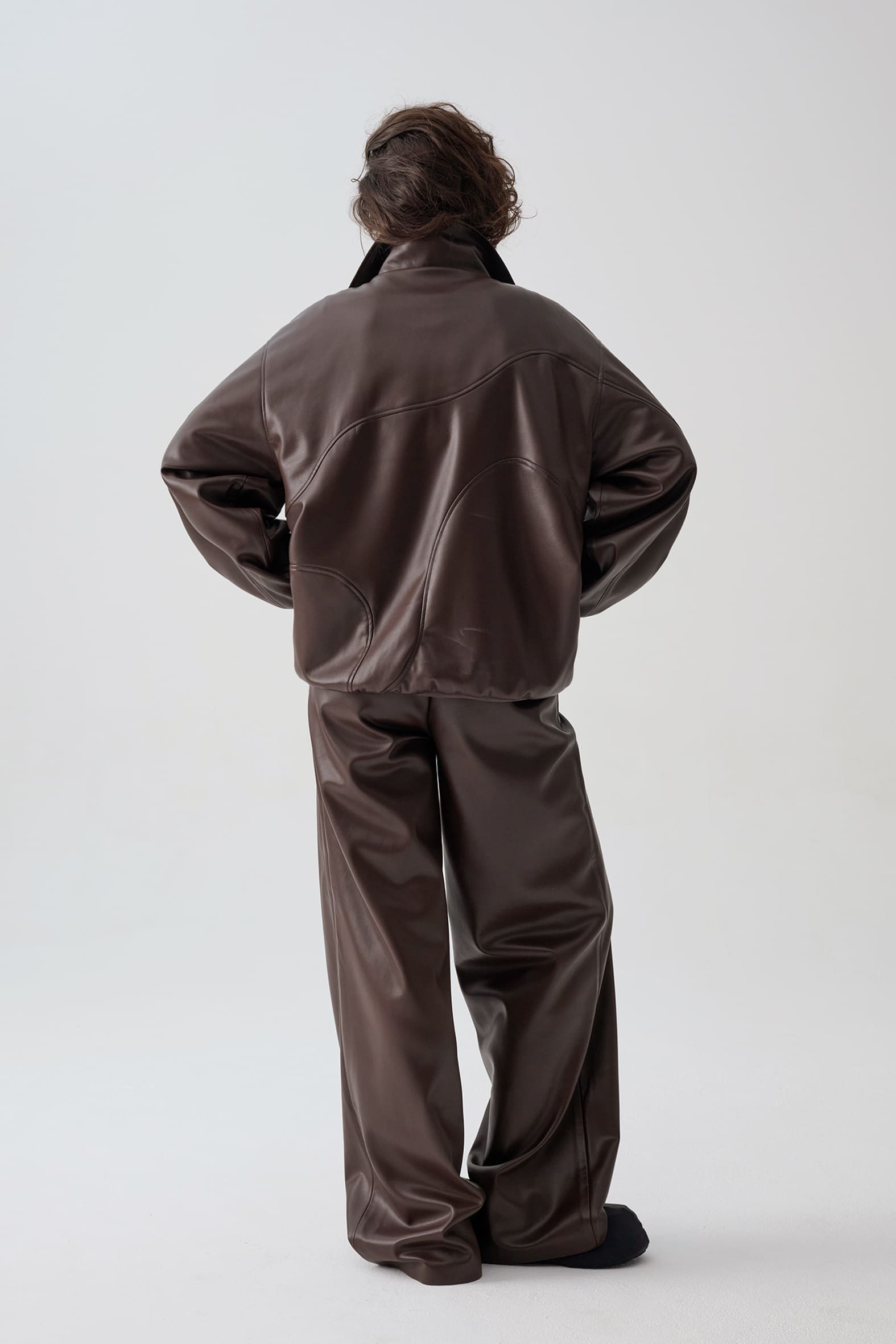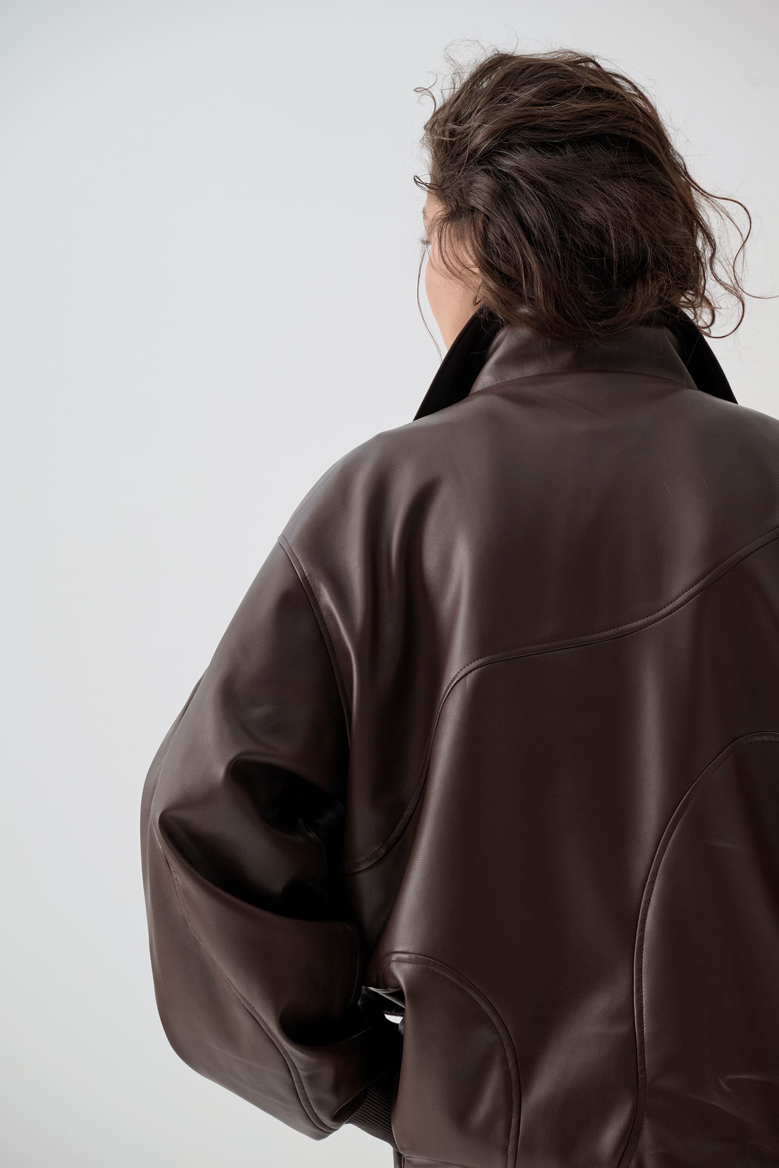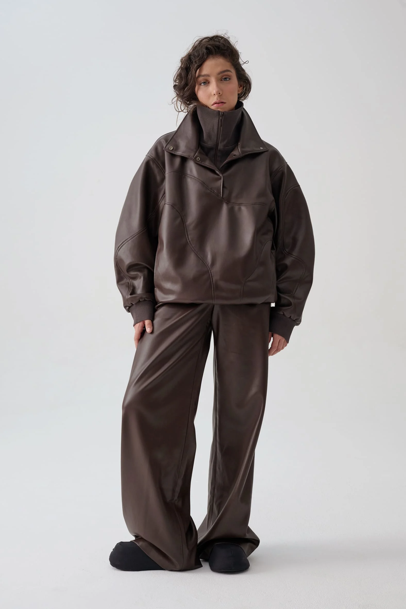 Куртка анорак из экокожи приятного оттенка горький шоколад. Свободный прямой крой, волнистые линии резов подчеркивают ощущение пластичности формы и создают «живописную» детализацию., функциональные детали - воротник стойка и манжеты из трикотажа в рубчик.