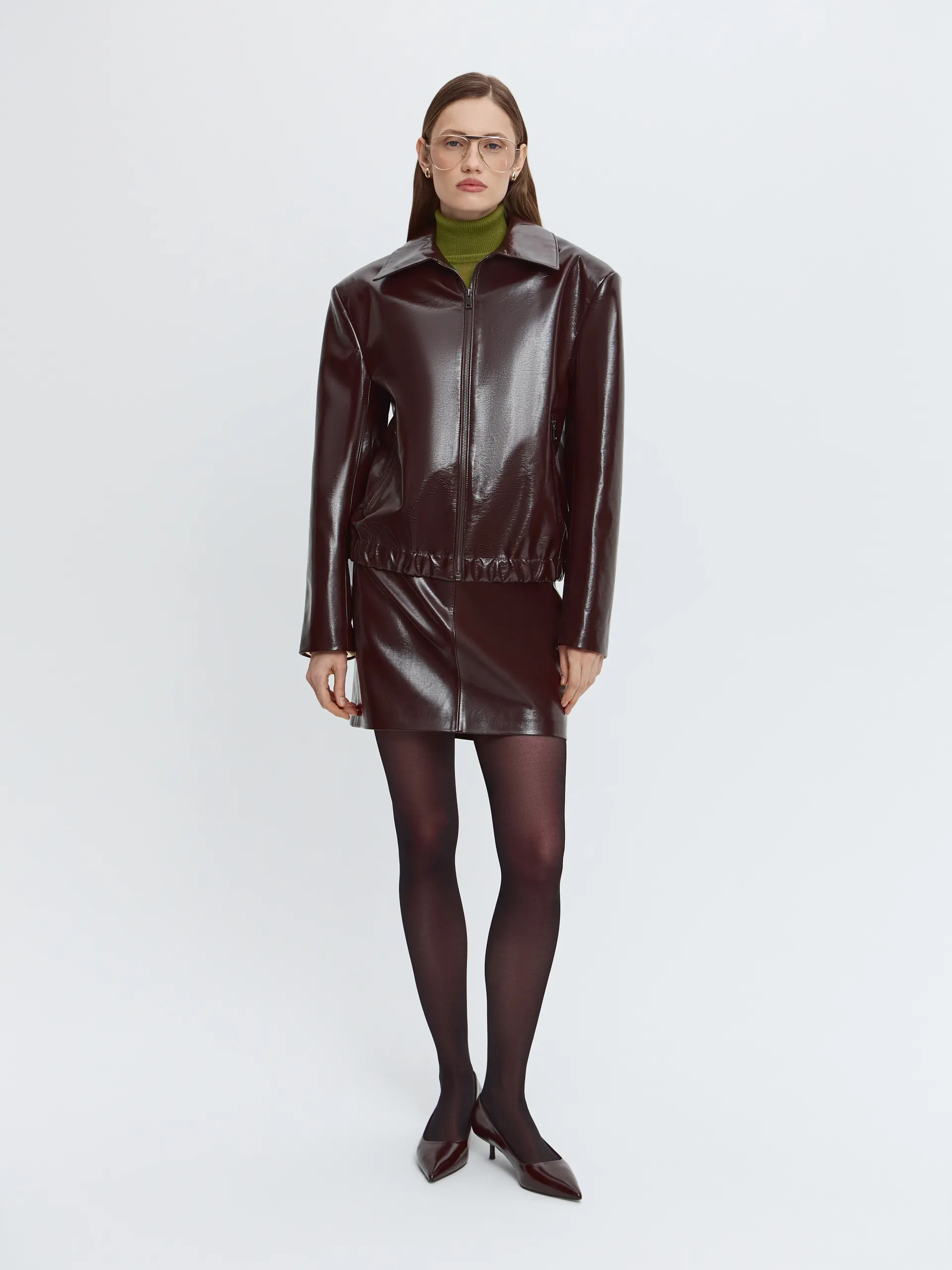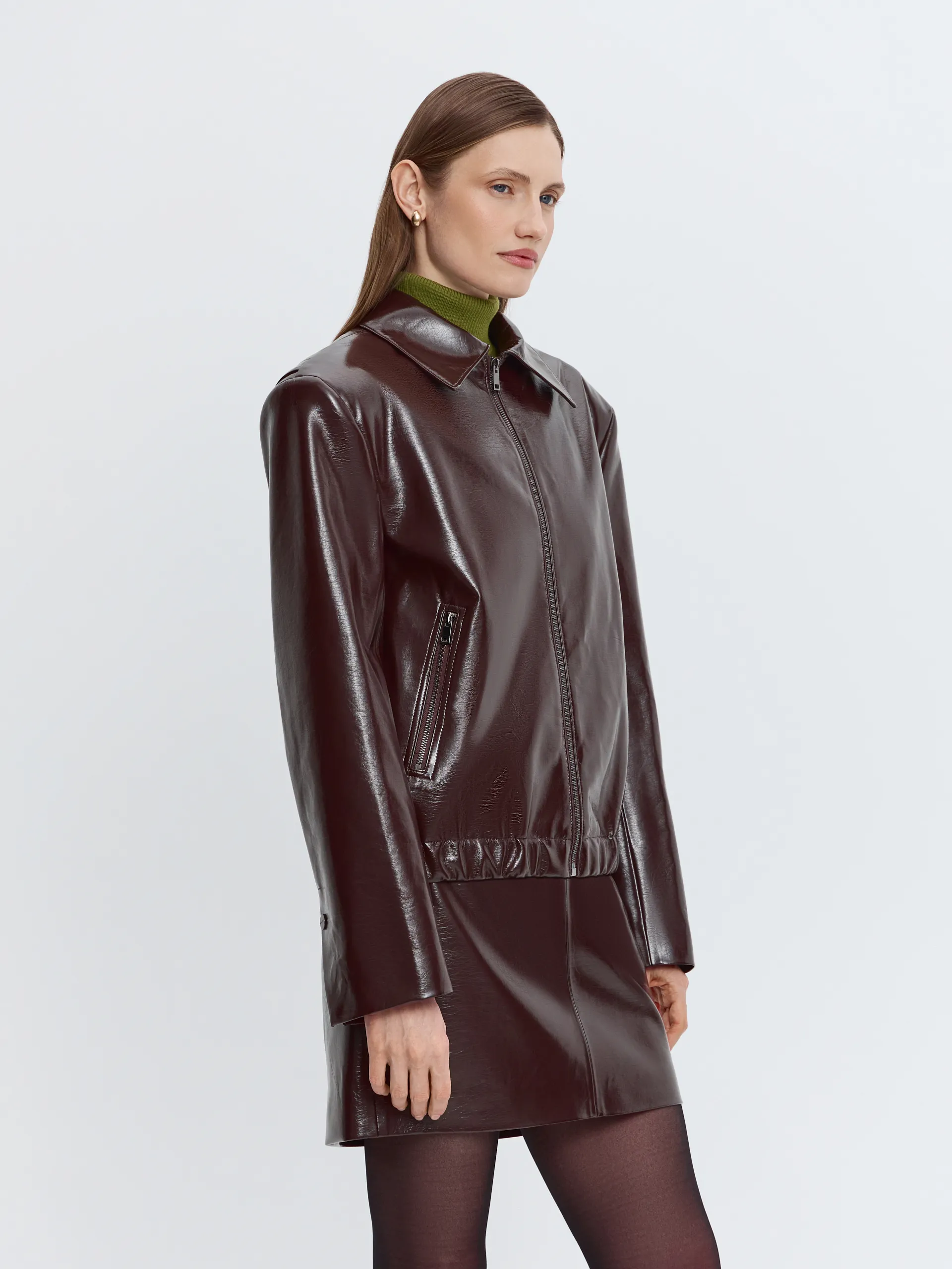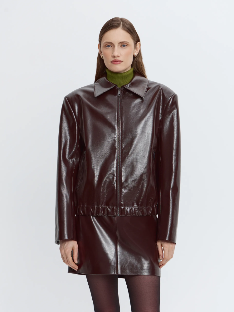 Бомбер выполнен из премиальной лакированной экокожи, ее деликатный блеск подчеркивает фактуру, близкую к натуральной. Увеличенная линия плеча и декоративная складка на спине — не просто элементы стиля, они улучшают амплитуду движения. Предлагаем носить с юбкой из аналогичной ткани для создания комплекта или стилизовать темными брюками и классическим денимом из нашей коллекции для casual образа.