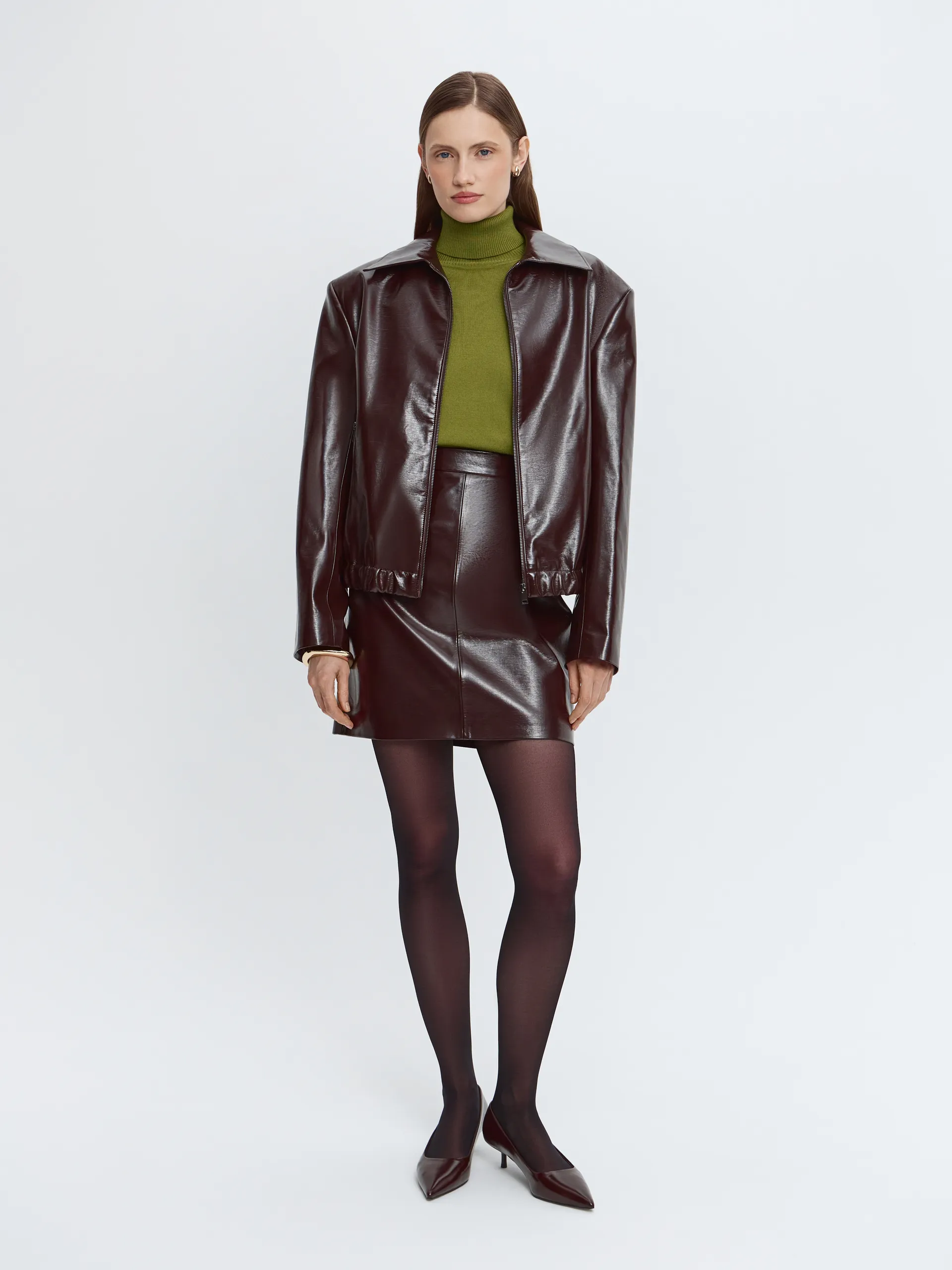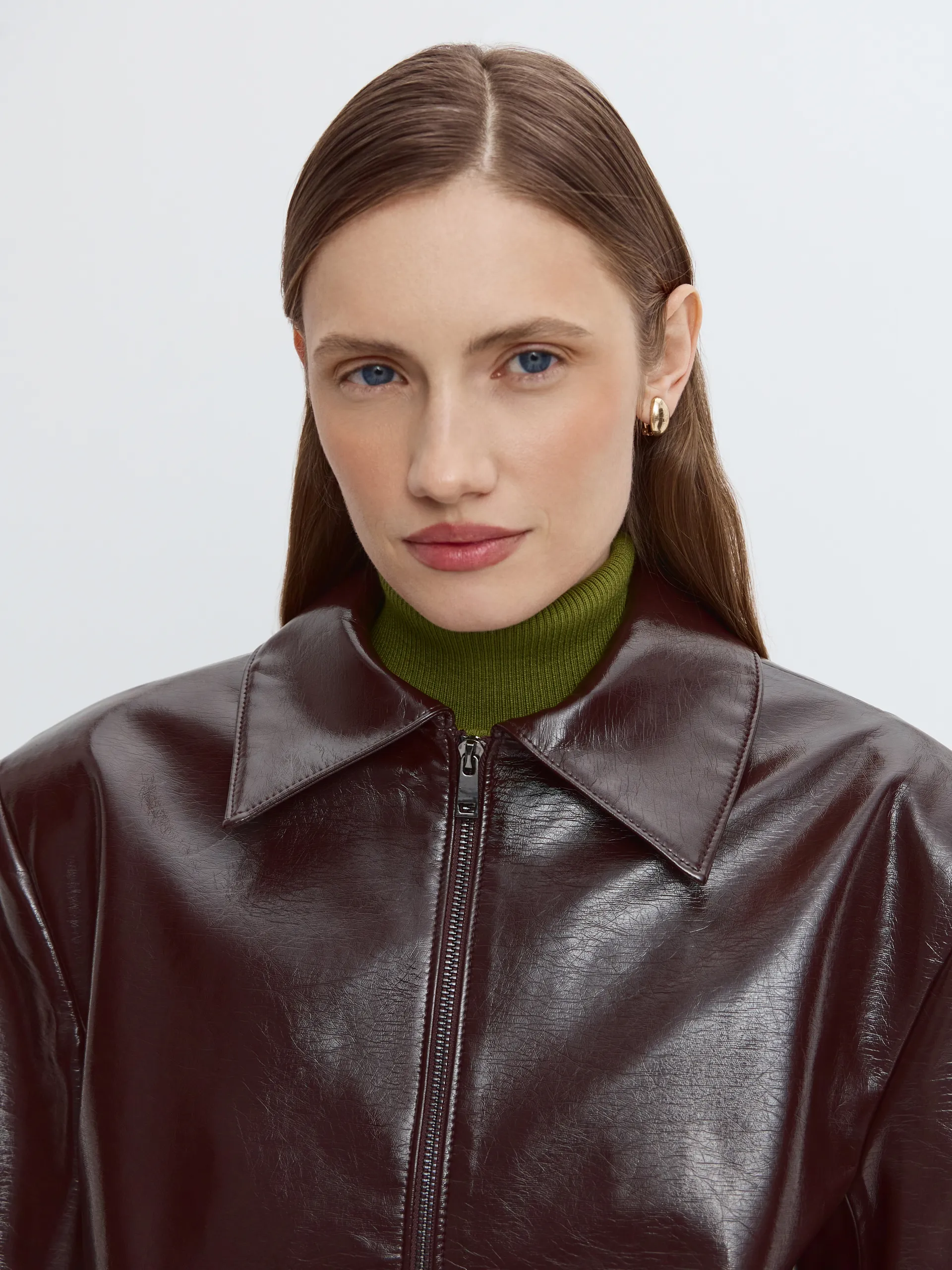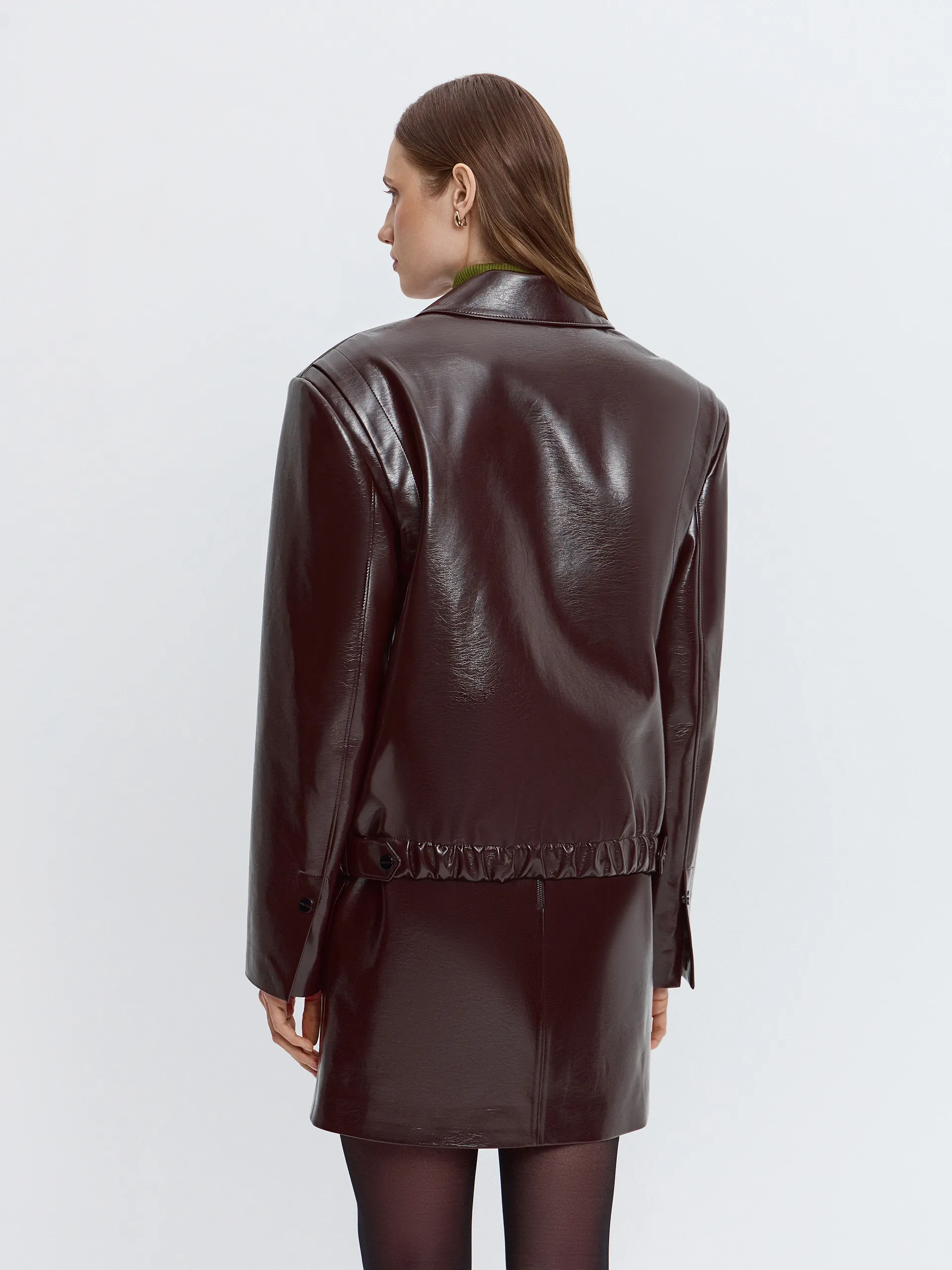 Бомбер выполнен из премиальной лакированной экокожи, ее деликатный блеск подчеркивает фактуру, близкую к натуральной. Увеличенная линия плеча и декоративная складка на спине — не просто элементы стиля, они улучшают амплитуду движения. Предлагаем носить с юбкой из аналогичной ткани для создания комплекта или стилизовать темными брюками и классическим денимом из нашей коллекции для casual образа.