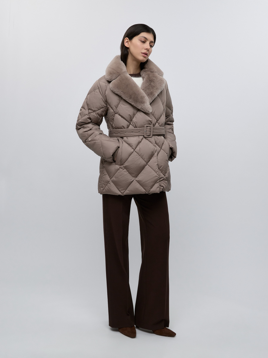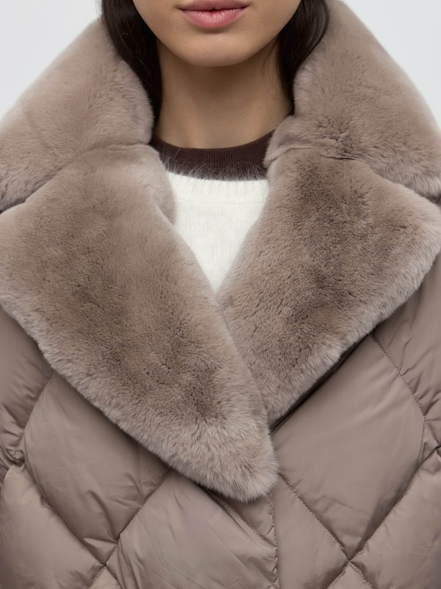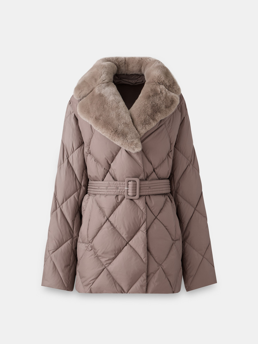 Классическая пуховая куртка с ромбовидной стежкой и широким английским воротником, декорированным несъемным мехом кролика рекс. За счет втачного плеча, полуприлегающего силуэта и тканевого пояса на шлевках подчеркивает фигуру даже в зимние холода. Манжеты в виде эластичной резинки, двойная застежка на металлическую молнию и ряд кнопок — для дополнительной защиты от холода.
