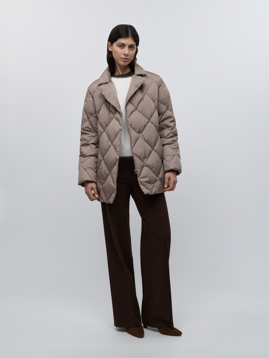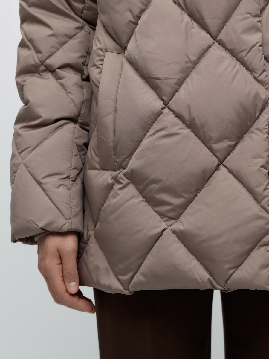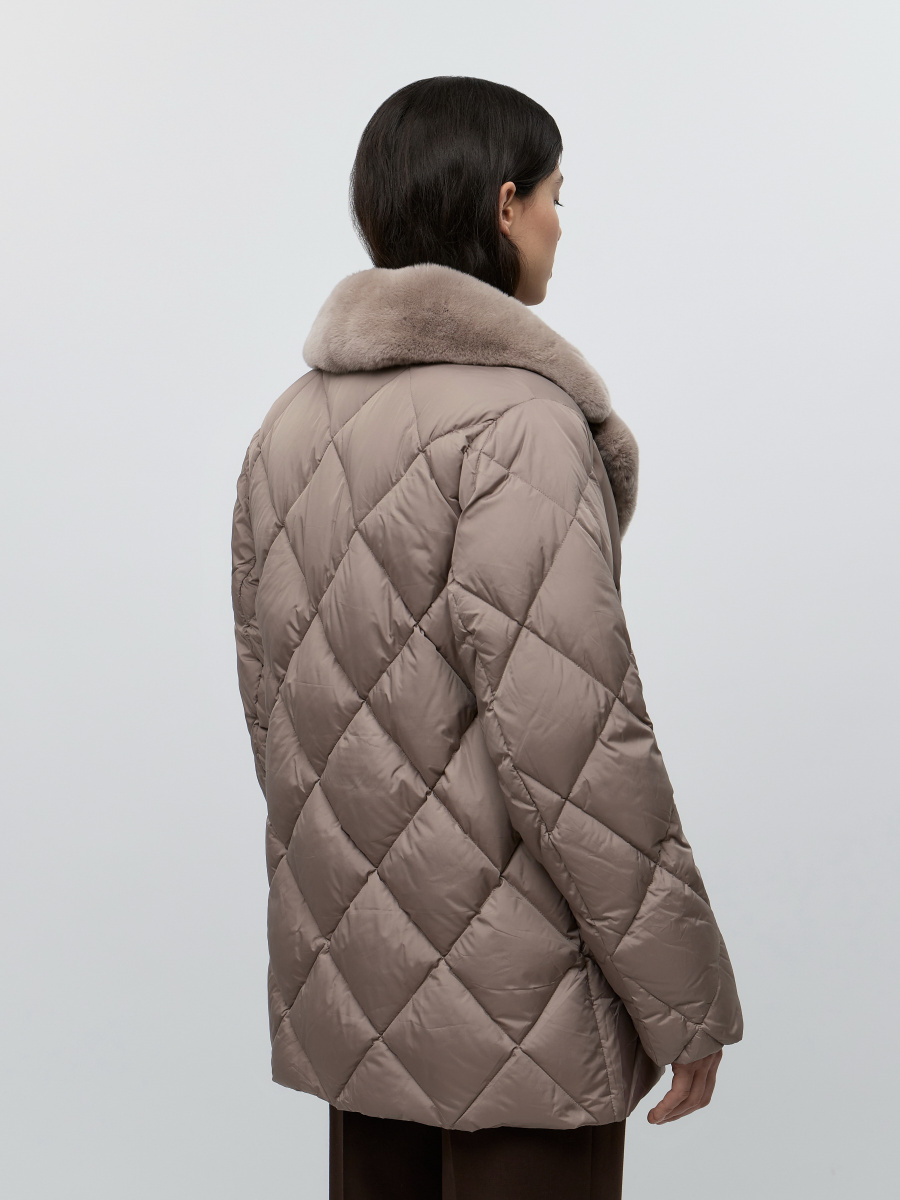 Классическая пуховая куртка с ромбовидной стежкой и широким английским воротником, декорированным несъемным мехом кролика рекс. За счет втачного плеча, полуприлегающего силуэта и тканевого пояса на шлевках подчеркивает фигуру даже в зимние холода. Манжеты в виде эластичной резинки, двойная застежка на металлическую молнию и ряд кнопок — для дополнительной защиты от холода.