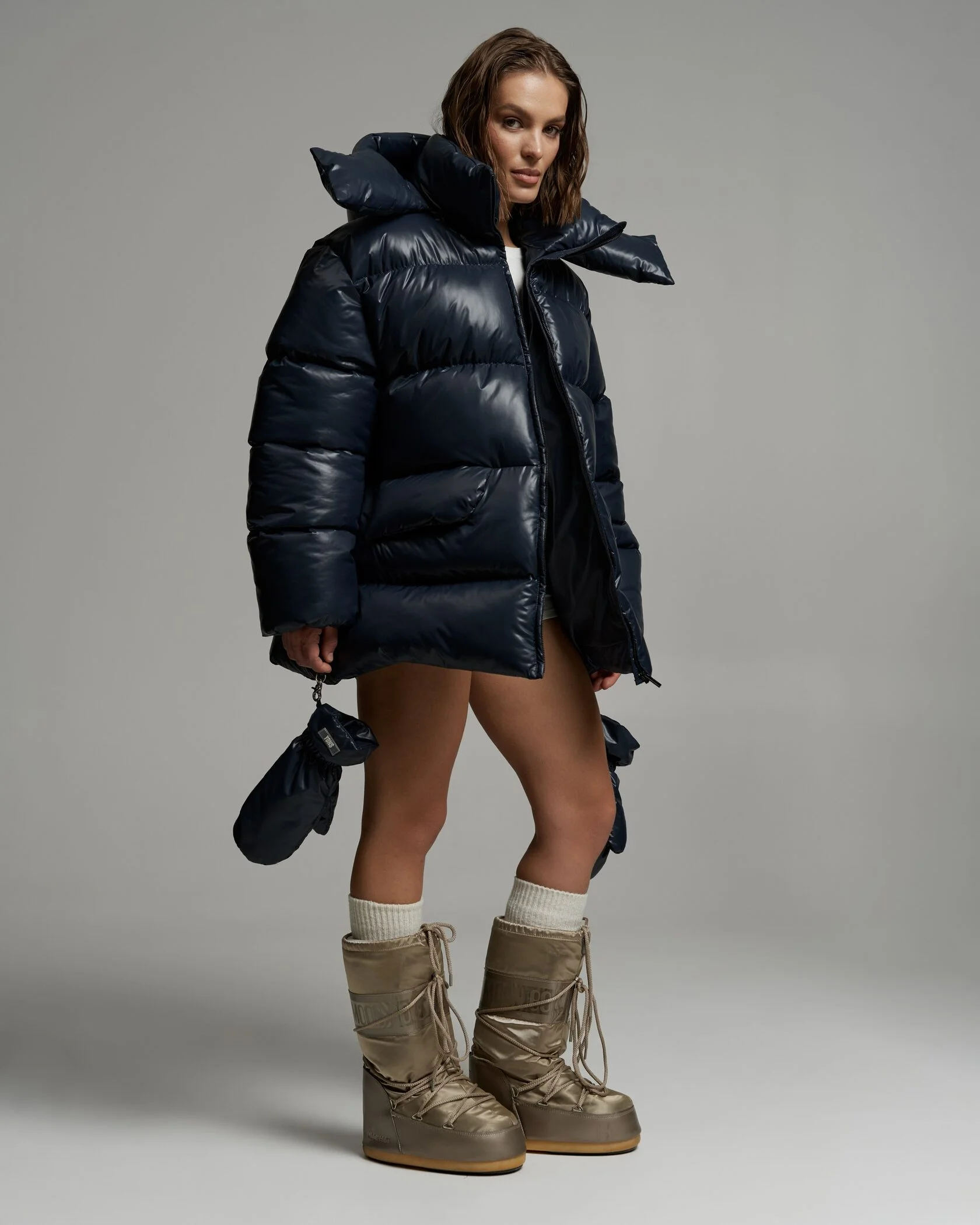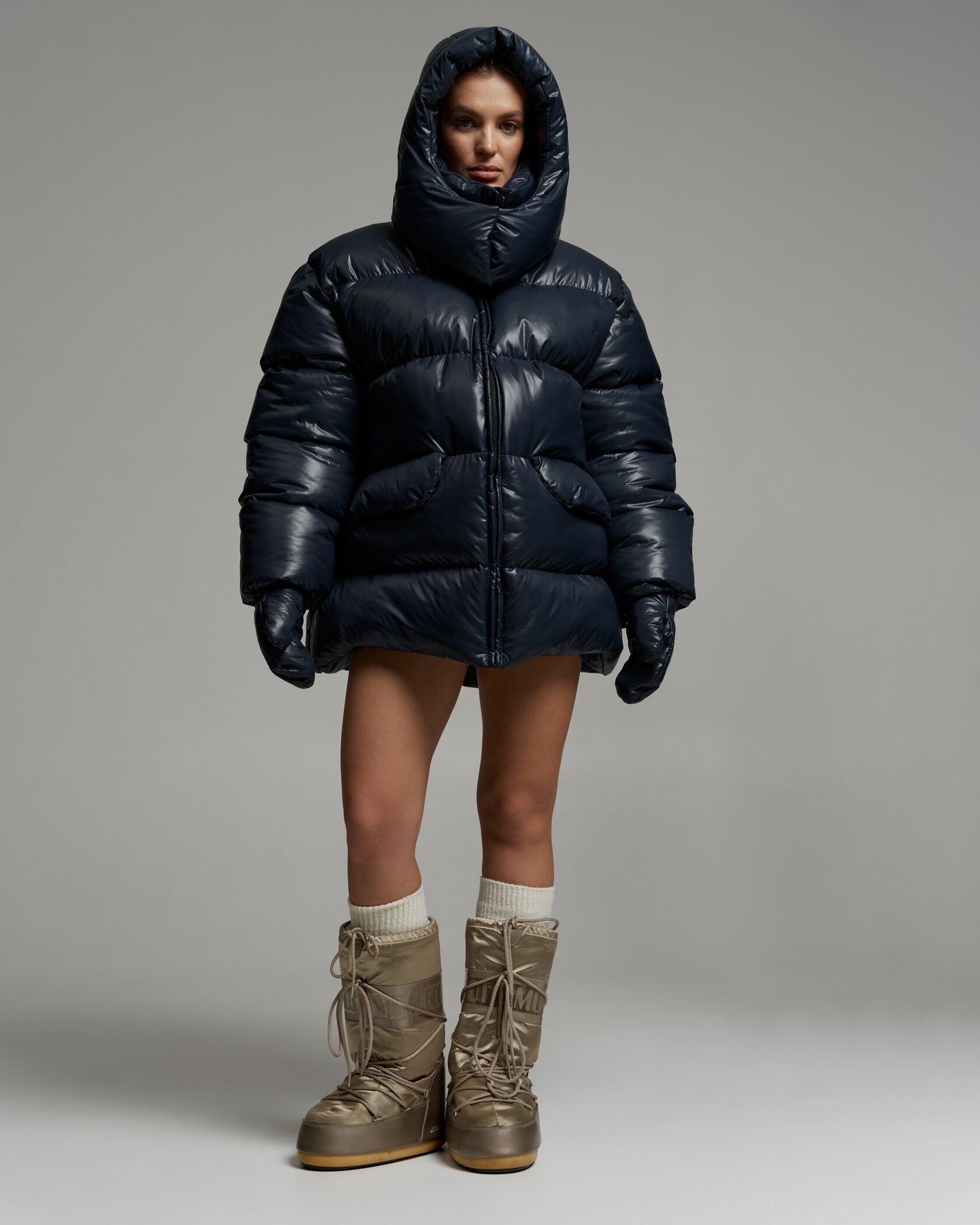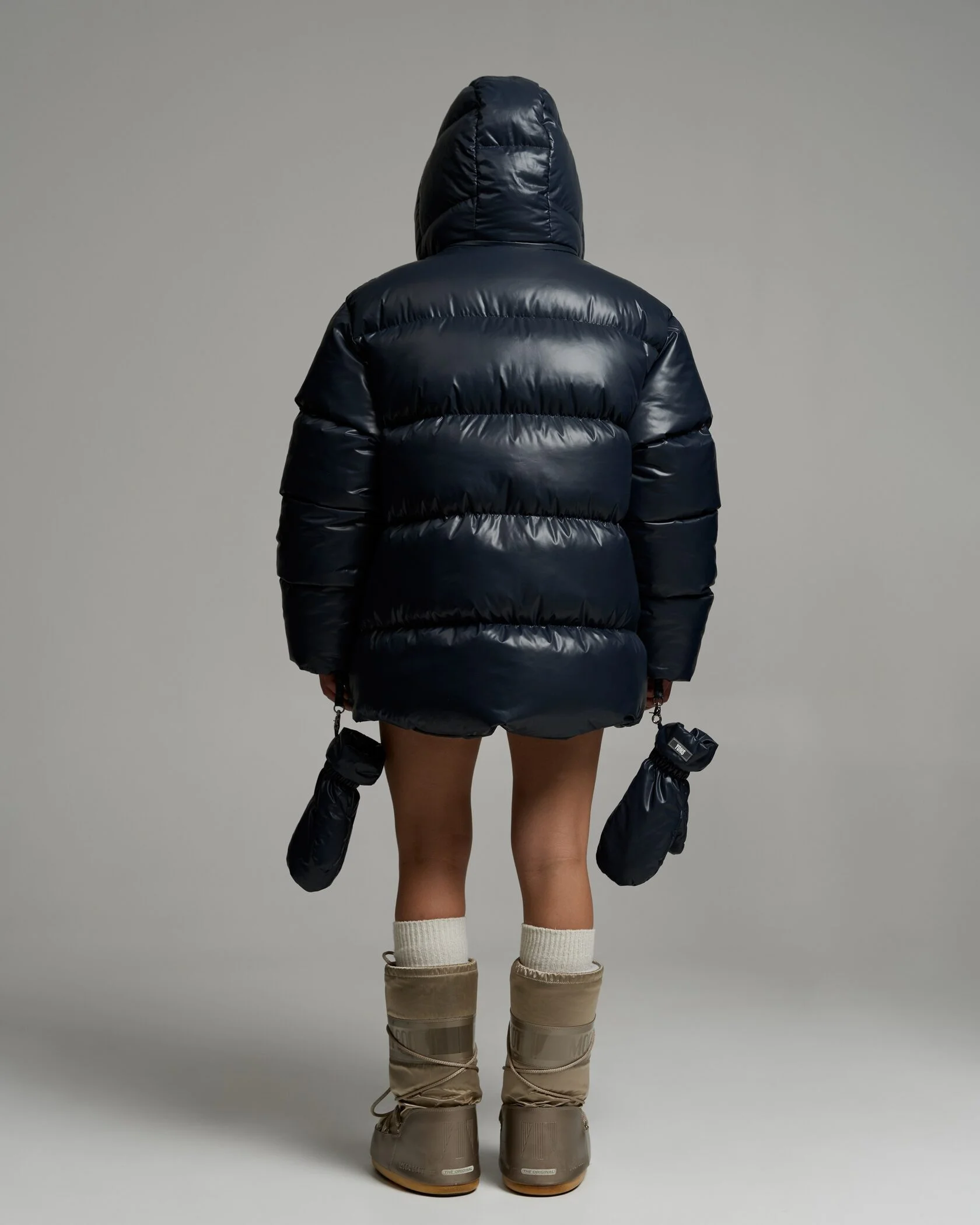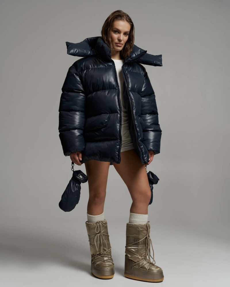 Объёмный пуховик с капюшоном в синем оттенке. Модель дополнена варежками на завязках, встроенными в рукава, что обеспечивает дополнительную защиту от холода (до -30°C). Утеплённая конструкция рассчитана на низкие температуры, подойдёт для городской зимы и активного отдыха.