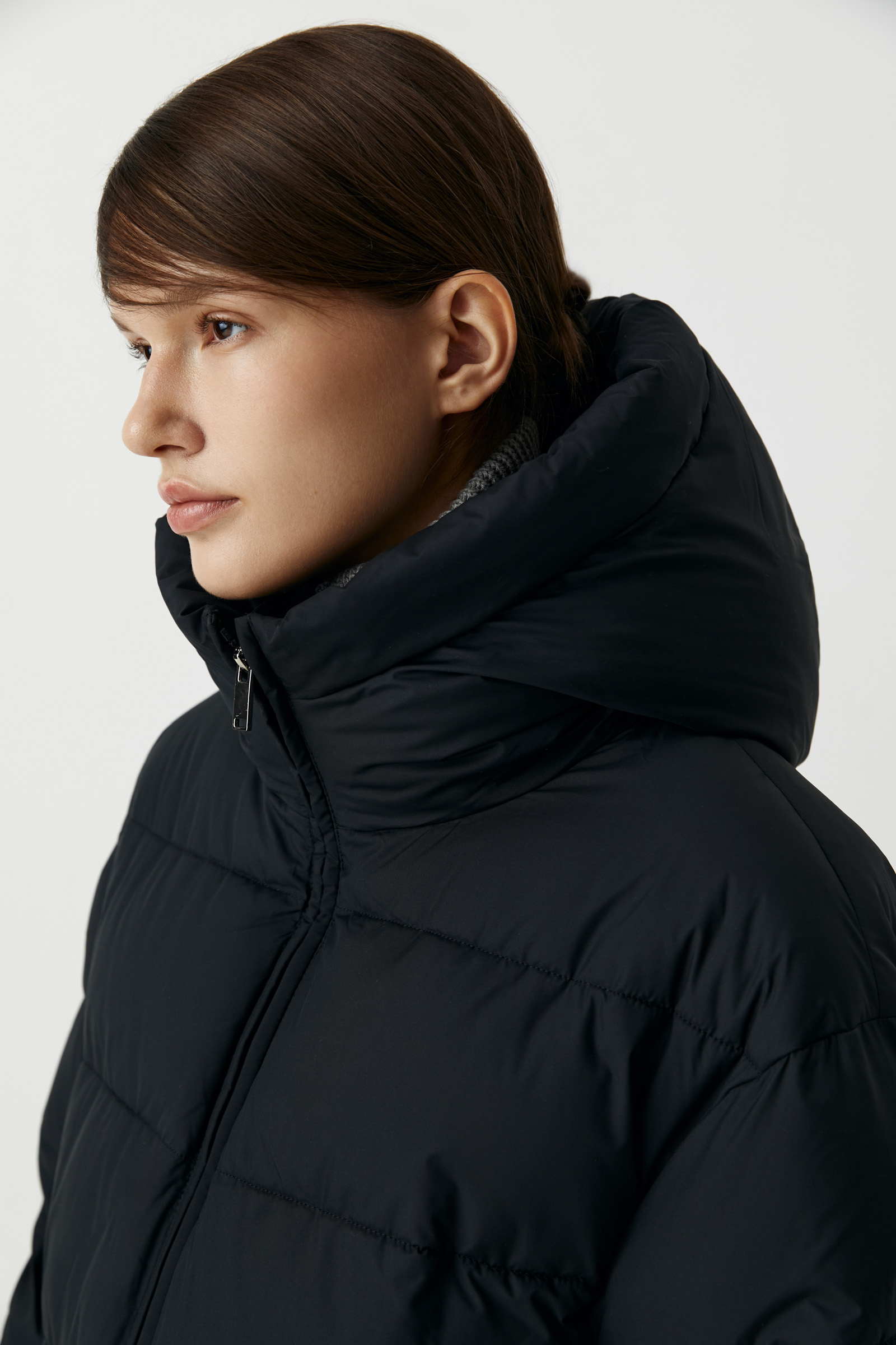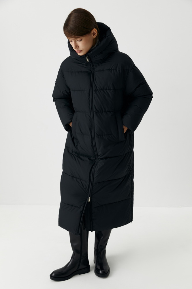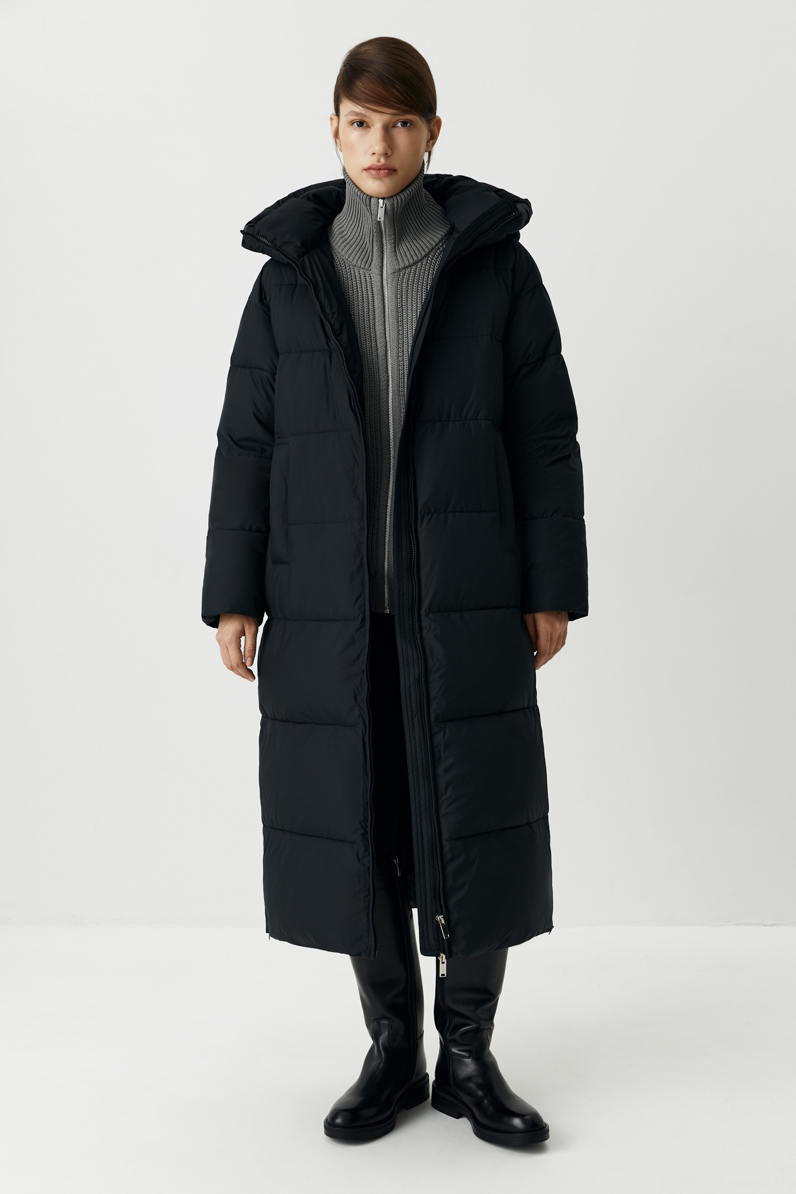 Объемный длинный пуховик из матовой ветрозащитной ткани рассчитан на зимние морозы. Модель выполнена с вязаными манжетами и несъемным капюшоном и надежно защищает от ветра.