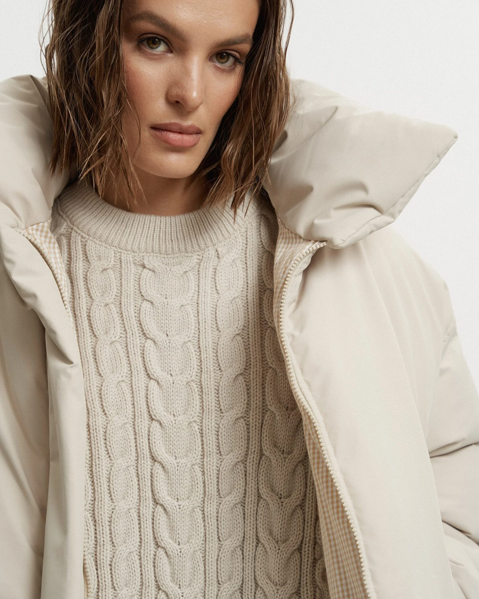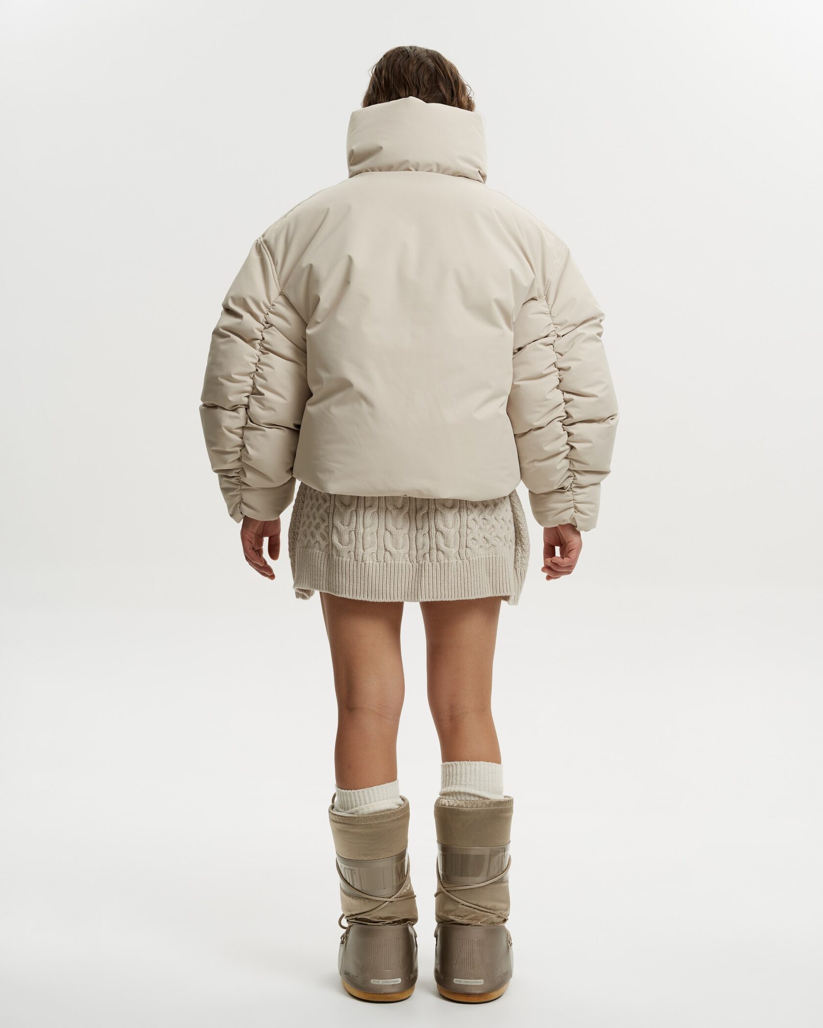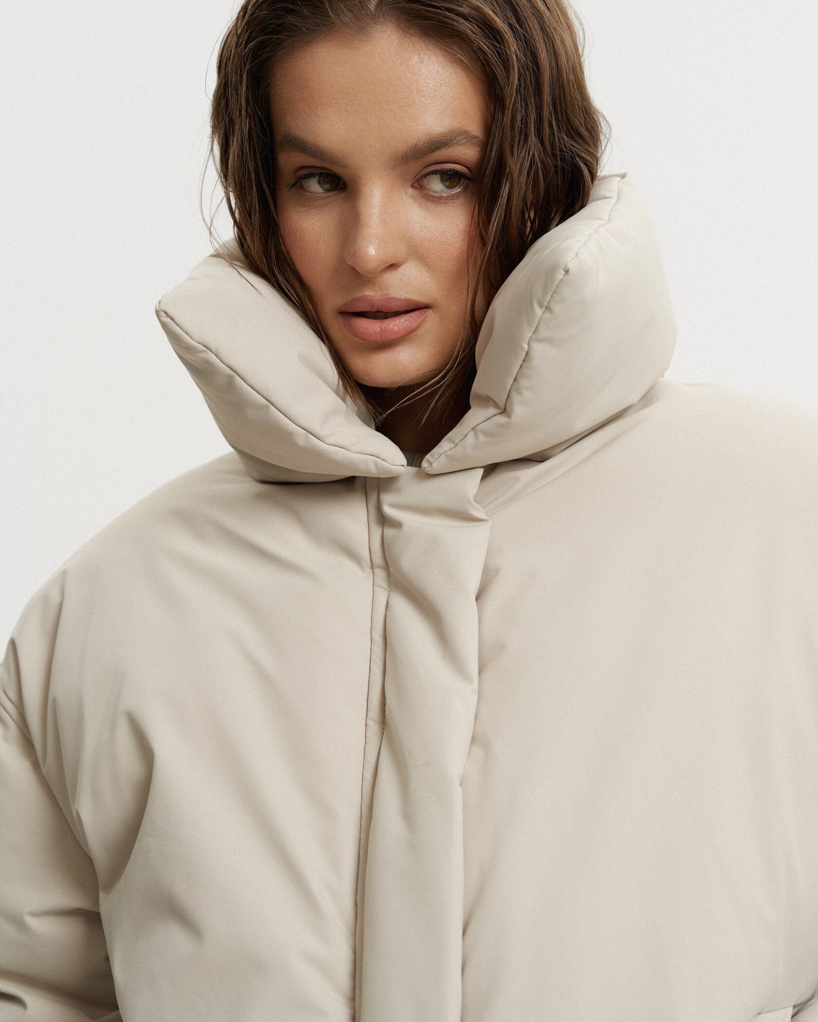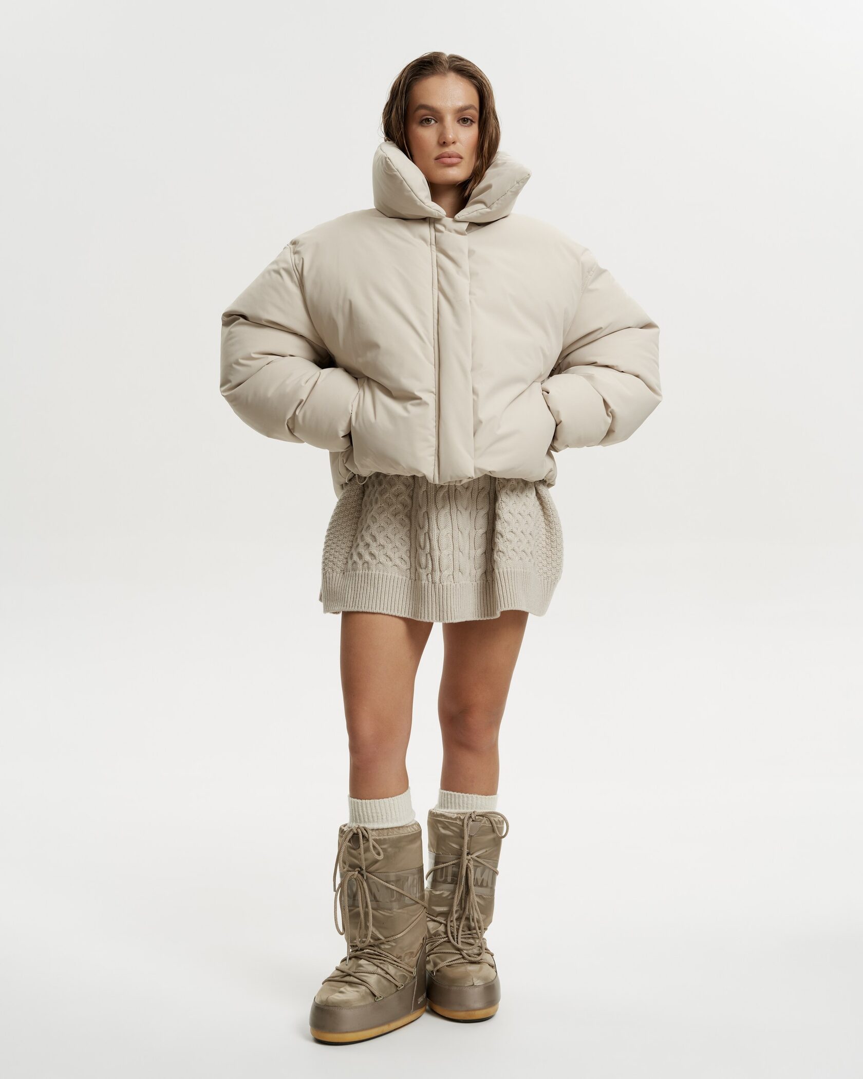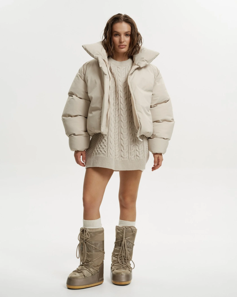 Объемная куртка-пуховик с современным укороченным кроем и высоким воротником-стойкой. Модель выполнена из плотного материала с мягким матовым блеском.