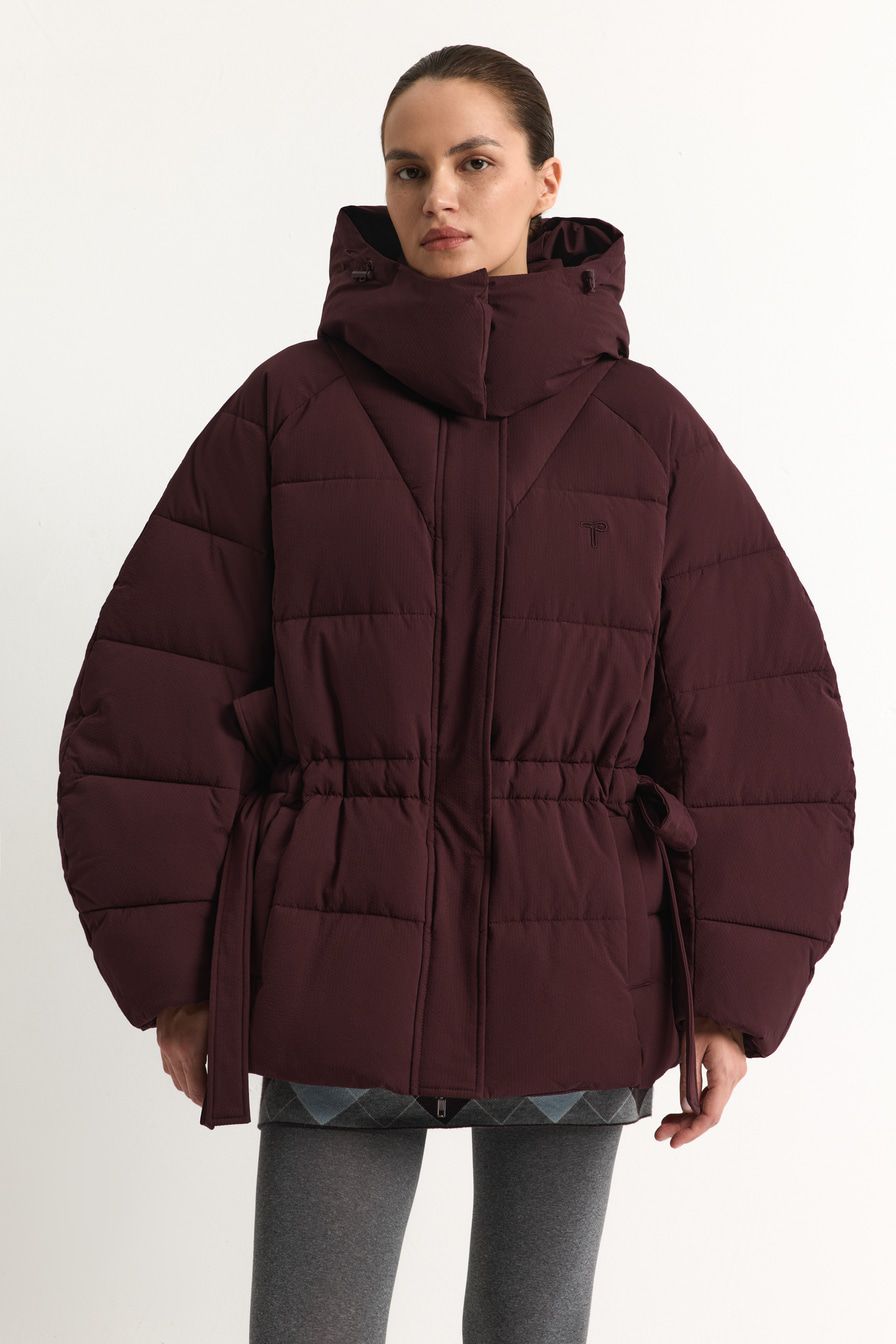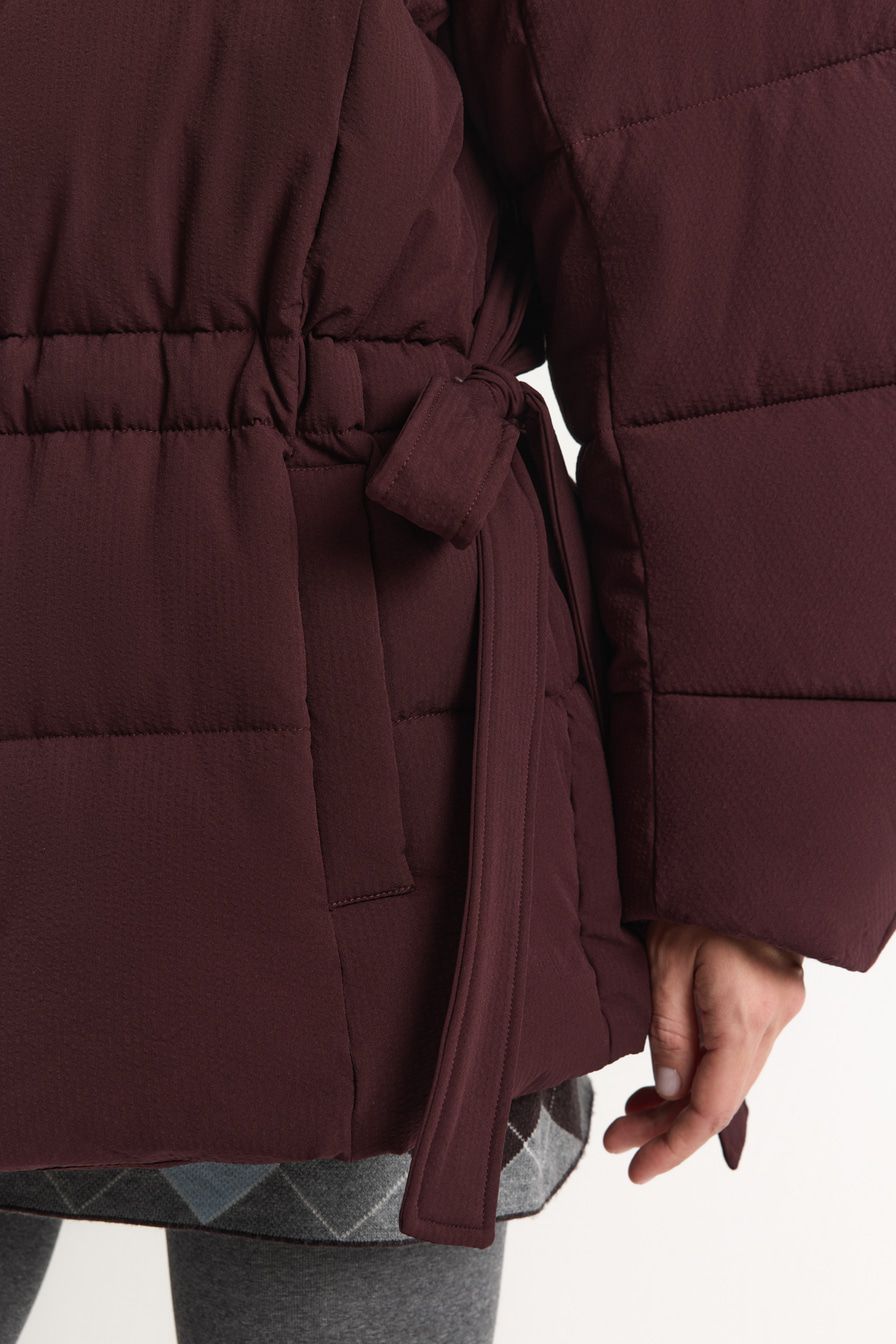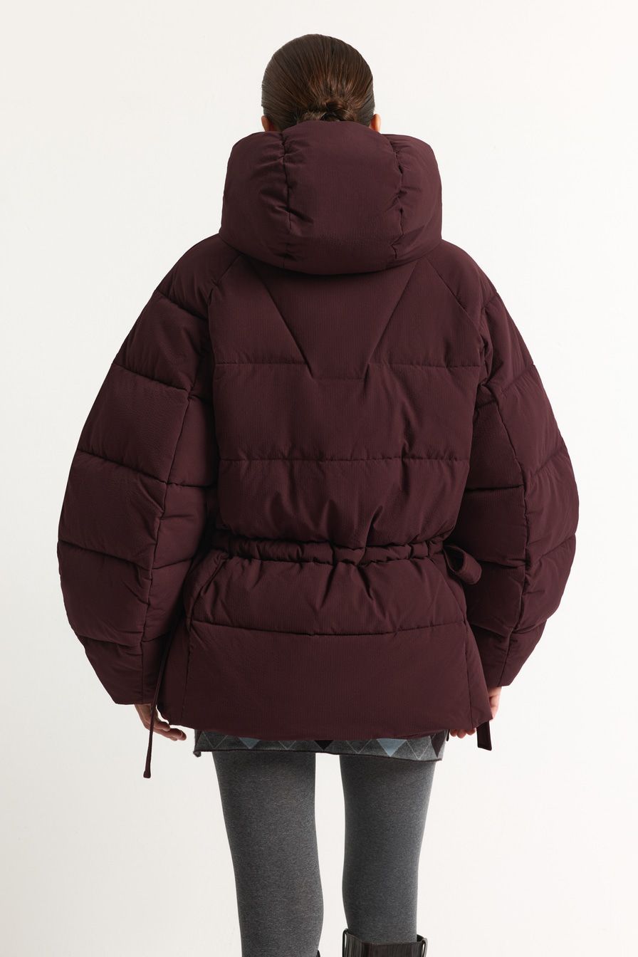 Объемный пуховик с наполнителем из синтепона – модель бордового цвета. Пуховик дополнен капюшоном и кулиской на поясе.