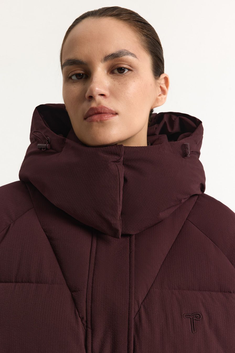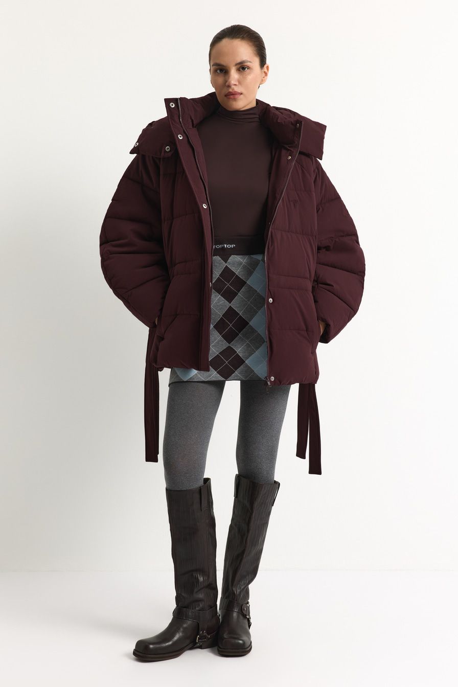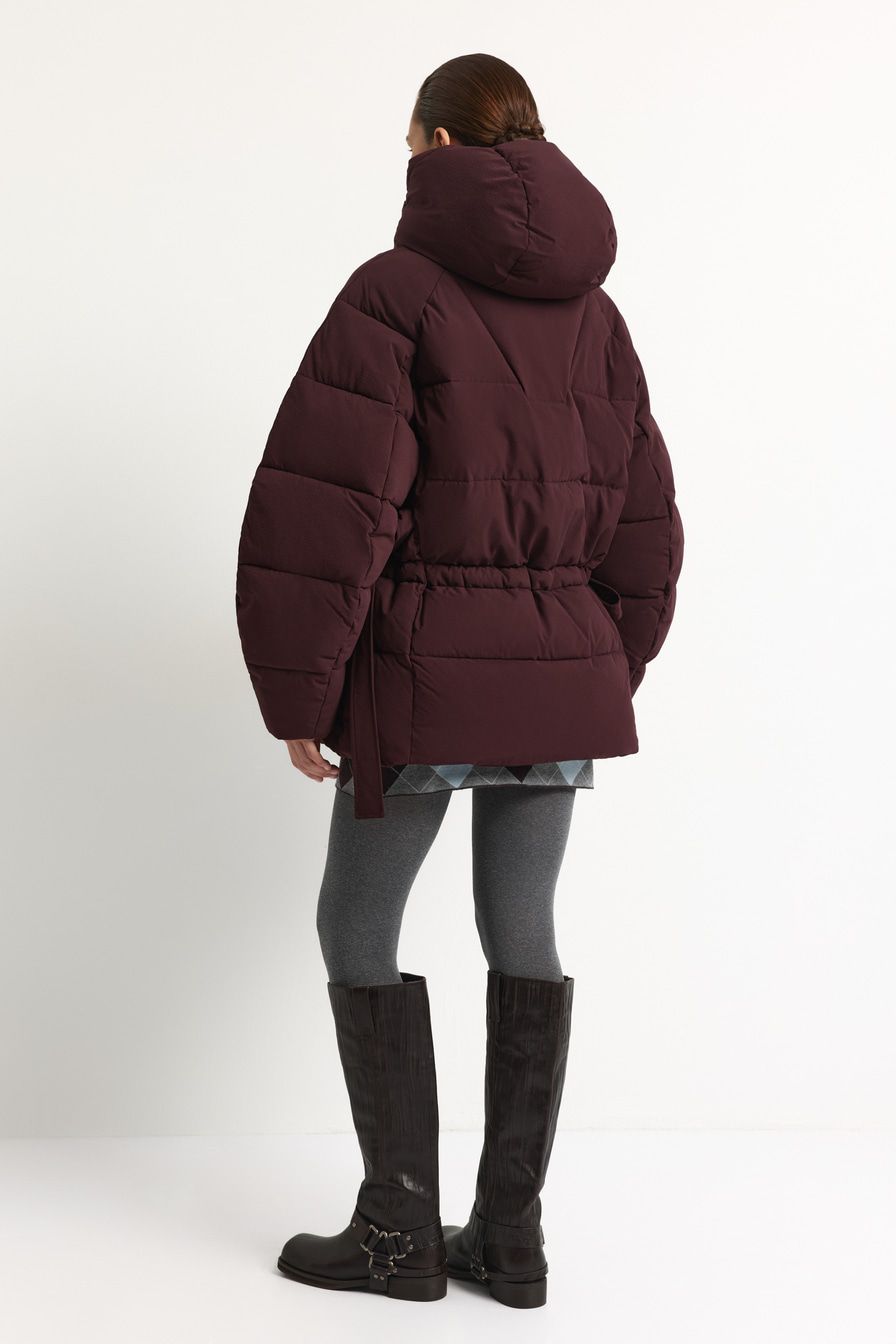 Объемный пуховик с наполнителем из синтепона – модель бордового цвета. Пуховик дополнен капюшоном и кулиской на поясе.