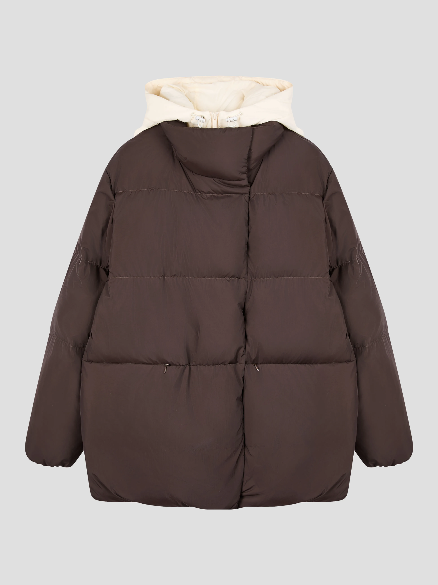 Пуховик Ruth. Коричневый пуховик со съёмной манишкой — тёплая, лёгкая и практичная модель на каждый день. Наполнитель 90% пух, 10% перо обеспечивает высокий уровень теплоизоляции, сохраняя комфорт даже при низких температурах. Потайные карманы на молнии не только поддерживают минималистичный вид, но и защищают от снега и влаги, что делает модель ещё более функциональной. Съёмная манишка позволяет адаптировать пуховик под погоду и настроение: носить полностью закрытым для максимального тепла или более лаконично — без неё. Пуховик легко сочетать с джинсами, трикотажем и шерстяными аксессуарами, создавая уютные и современные зимние образы.