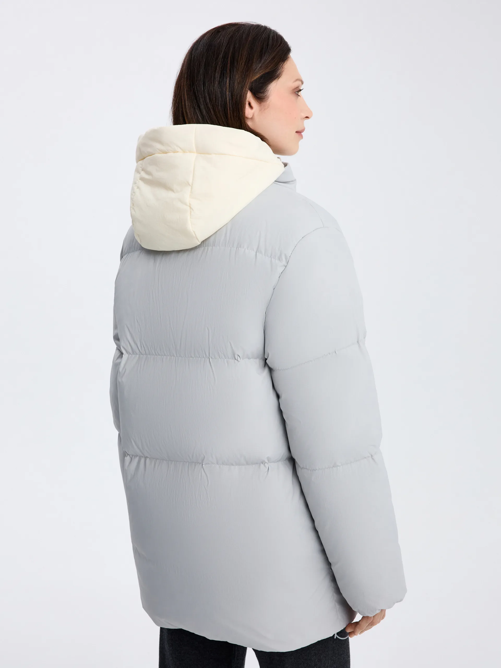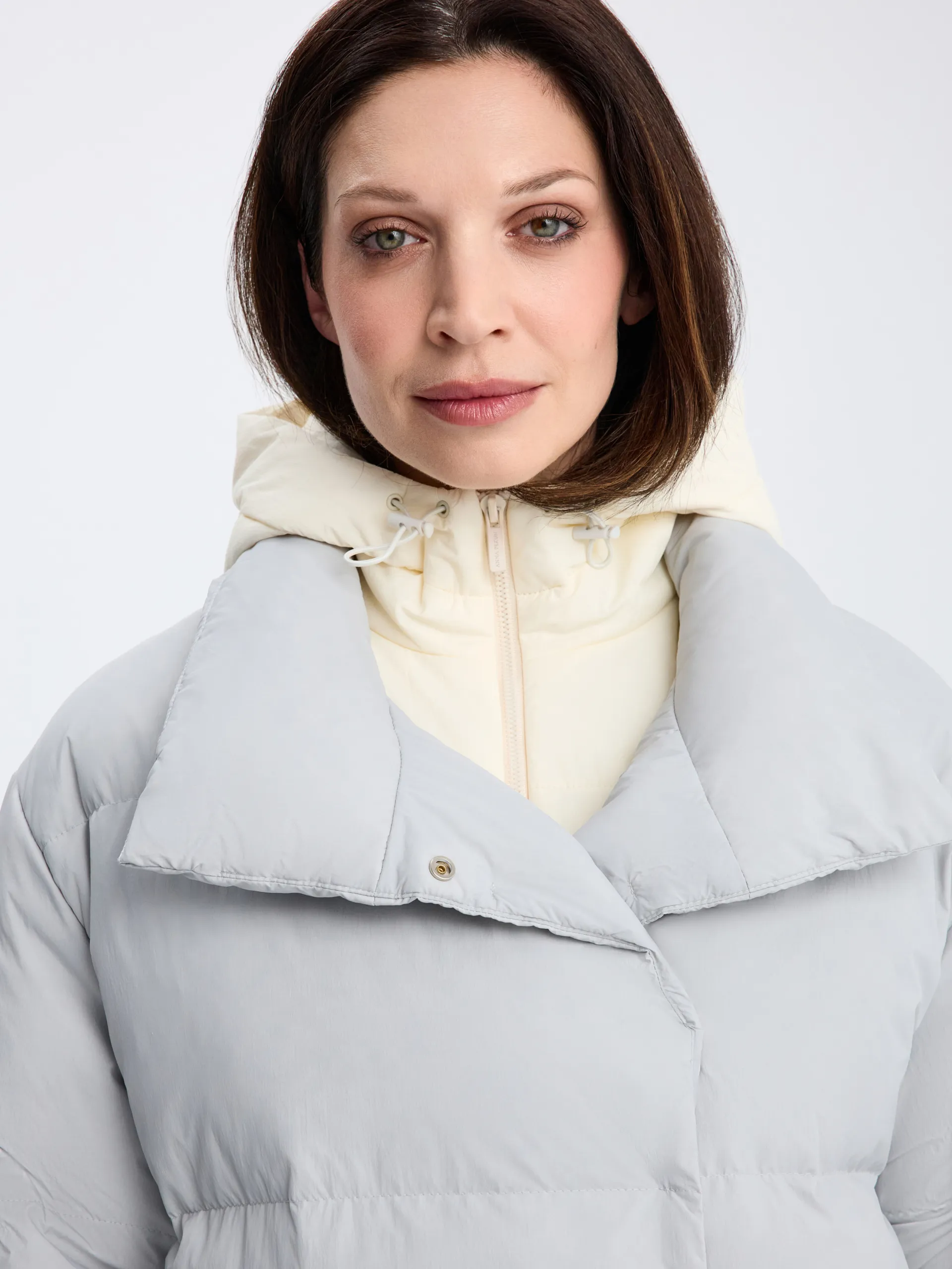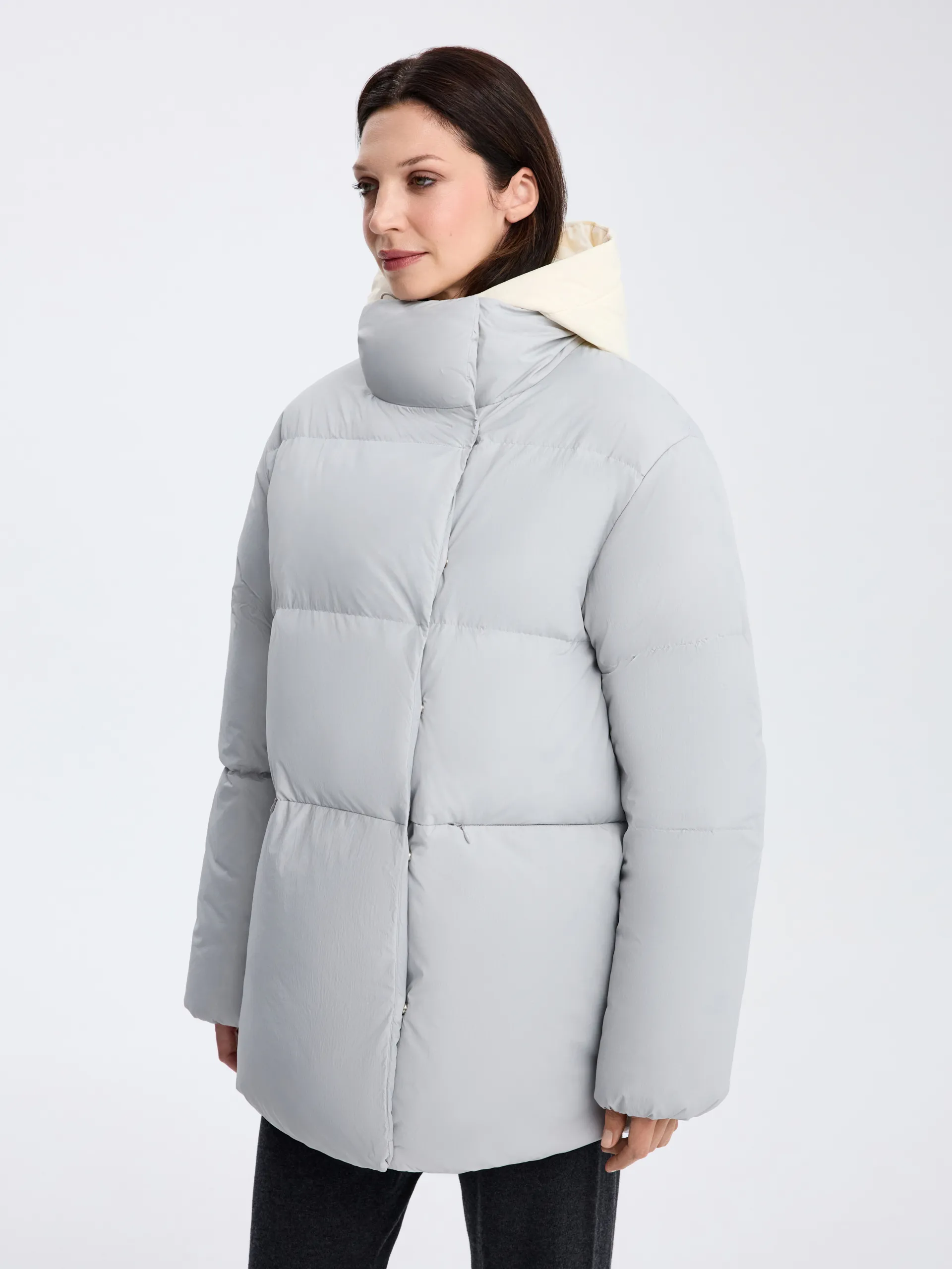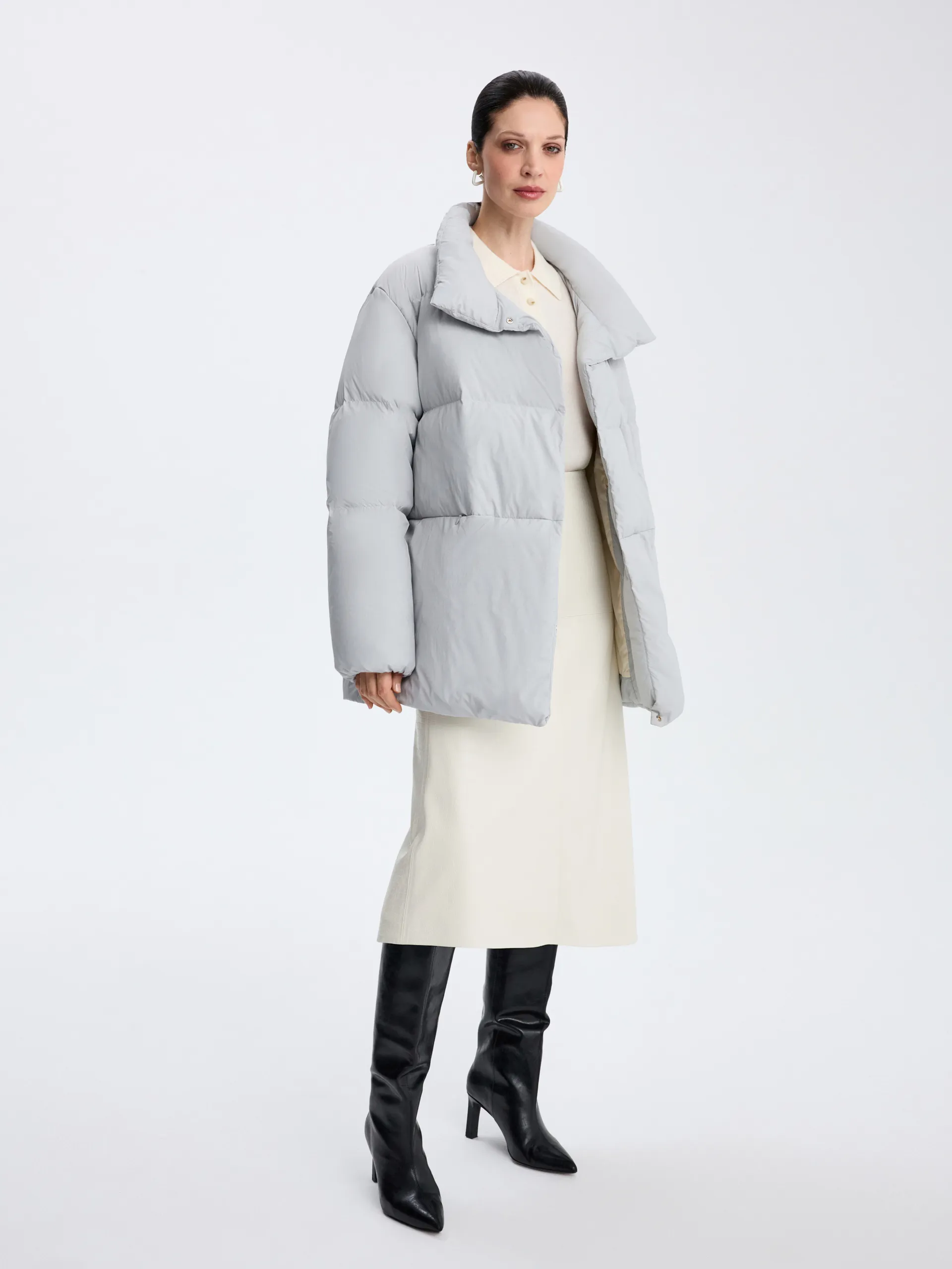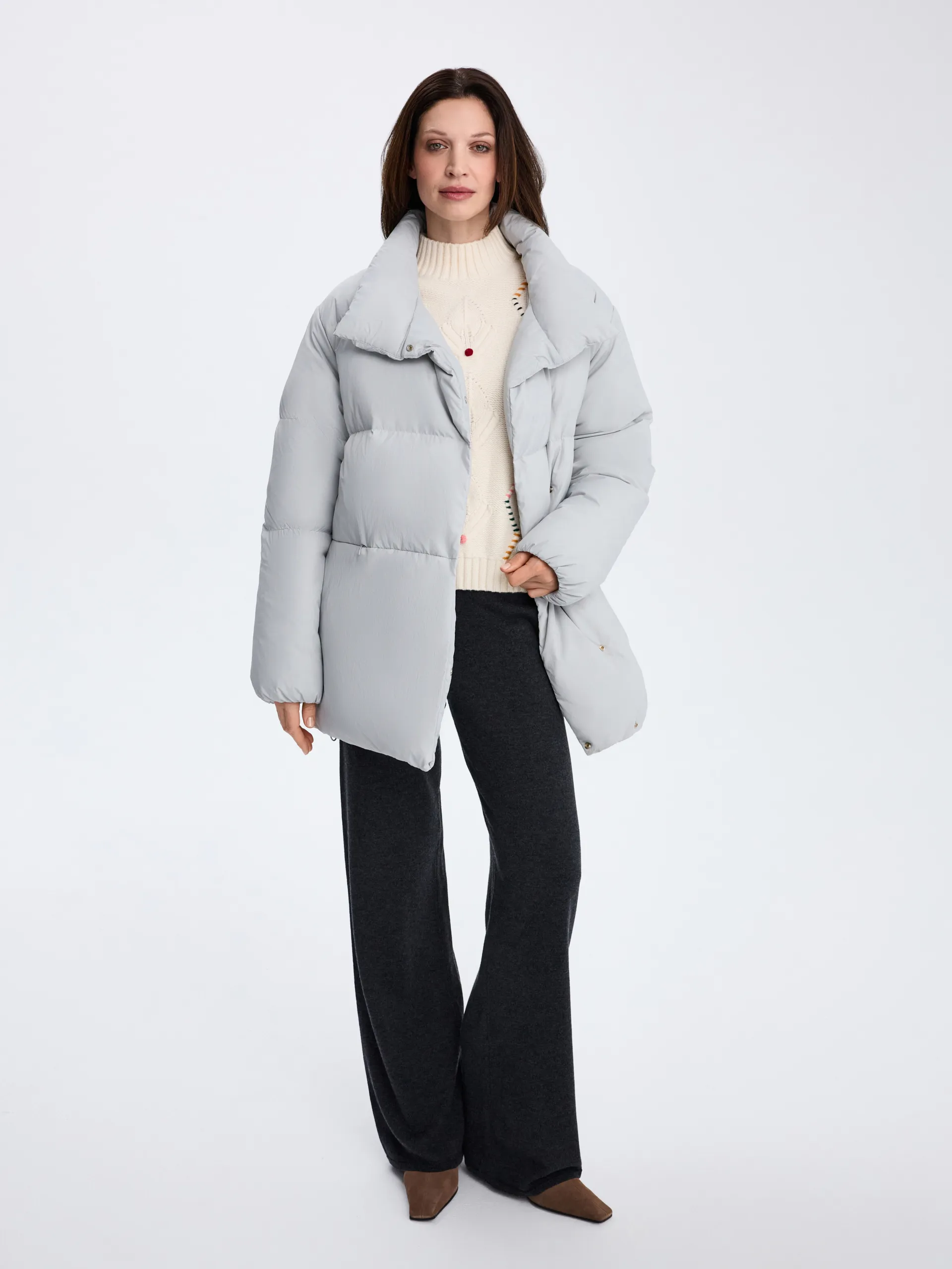 Пуховик Ruth. Серый пуховик со съёмной манишкой — тёплая, лёгкая и практичная модель на каждый день. Наполнитель 90% пух, 10% перо обеспечивает высокий уровень теплоизоляции, сохраняя комфорт даже при низких температурах. Потайные карманы на молнии не только поддерживают минималистичный вид, но и защищают от снега и влаги, что делает модель ещё более функциональной. Съёмная манишка позволяет адаптировать пуховик под погоду и настроение: носить полностью закрытым для максимального тепла или более лаконично — без неё. Пуховик легко сочетать с джинсами, трикотажем и шерстяными аксессуарами, создавая уютные и современные зимние образы.