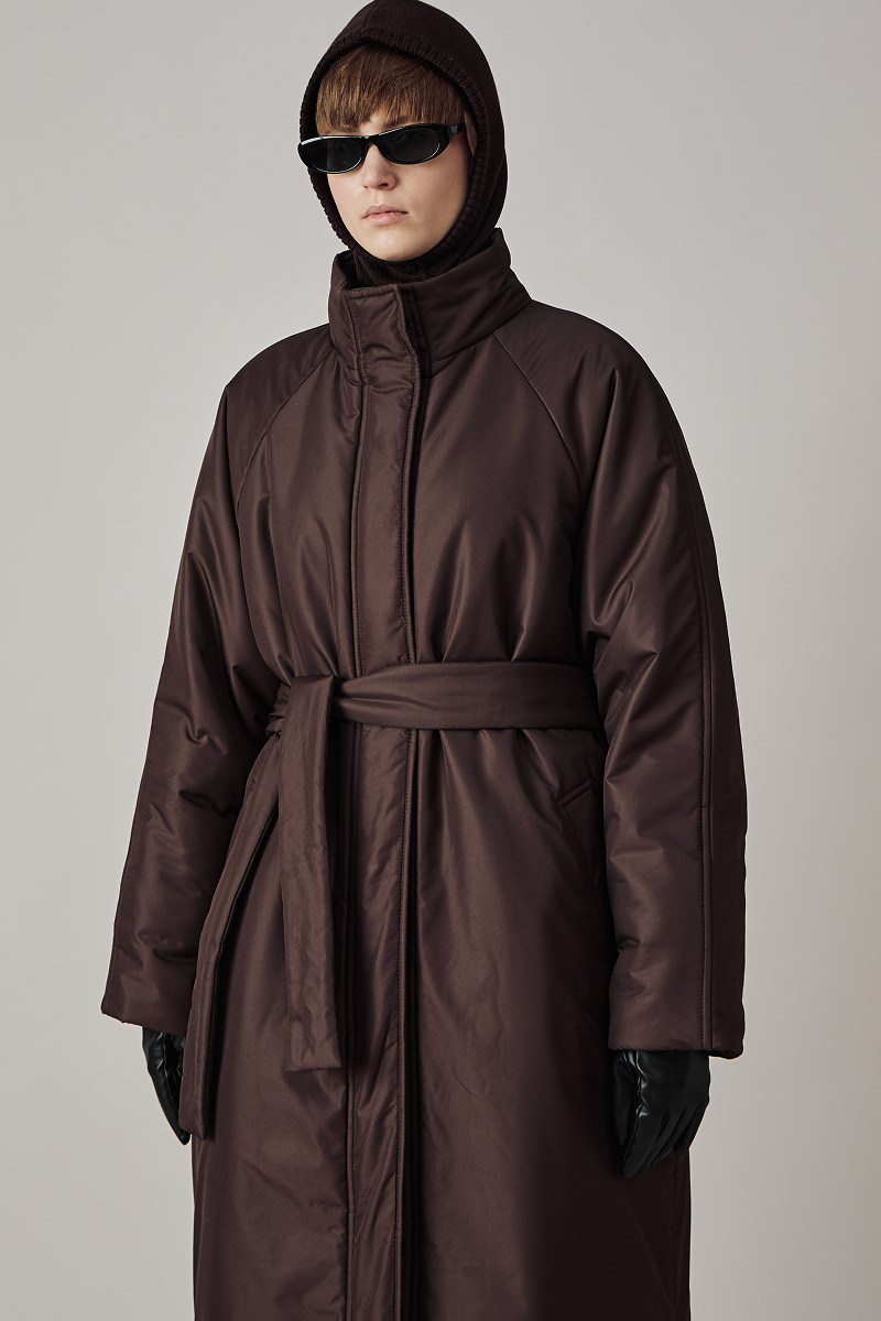 Пуховик шоколадного цвета с поясом — идеальный выбор для холодной погоды. Обеспечивает тепло и комфорт, подчёркивает стиль. Удобный пояс позволяет регулировать силуэт.