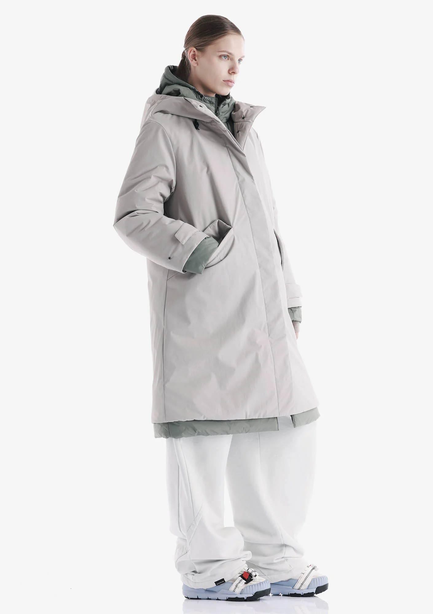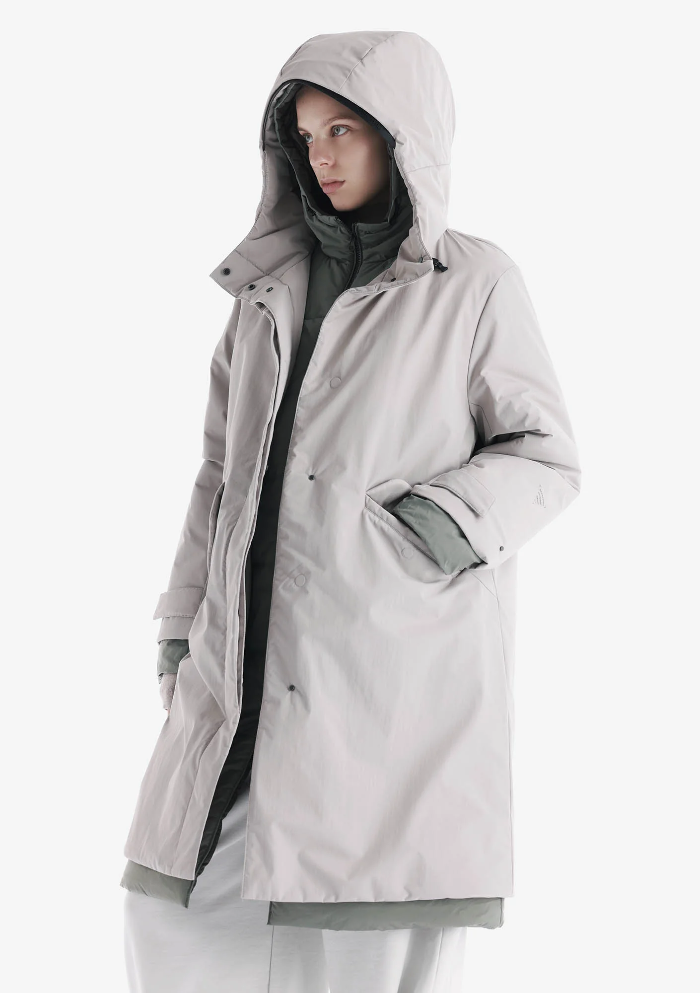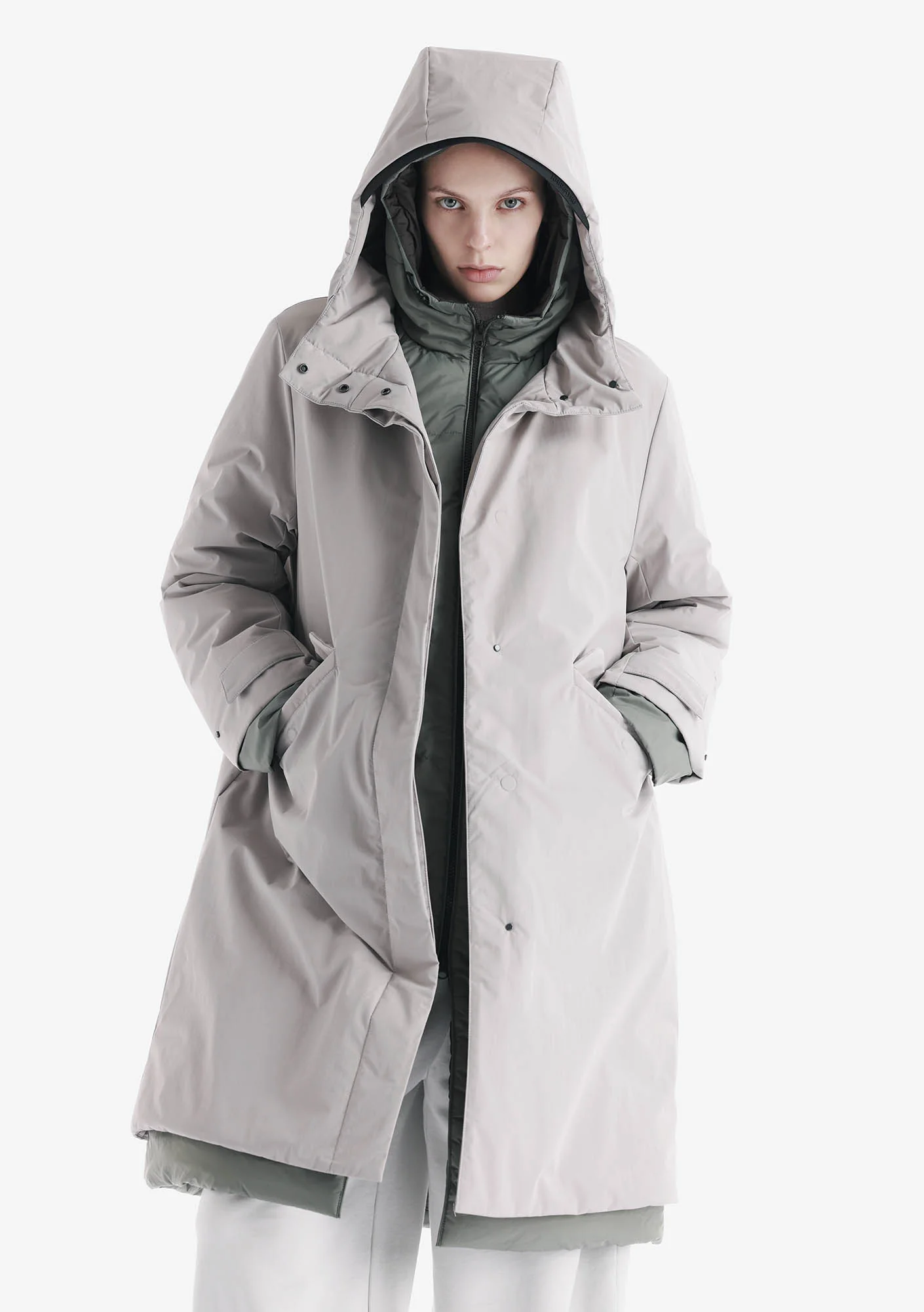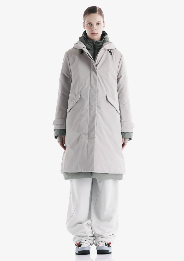Удлинённая парка VELA с визуальным эффектом многослойности сделана из функциональной водостойкой ткани. Внешний капюшон с жёстким козырьком и внутренний утеплённый капюшон — двойная защита от непогоды. Две застёжки: внешняя — на магнитах и кнопках, внутренняя — на молнии с вентиляцией. Карманы с мягкой подкладкой и скрытые функциональные элементы усиливают комфорт и удобство в динамике.