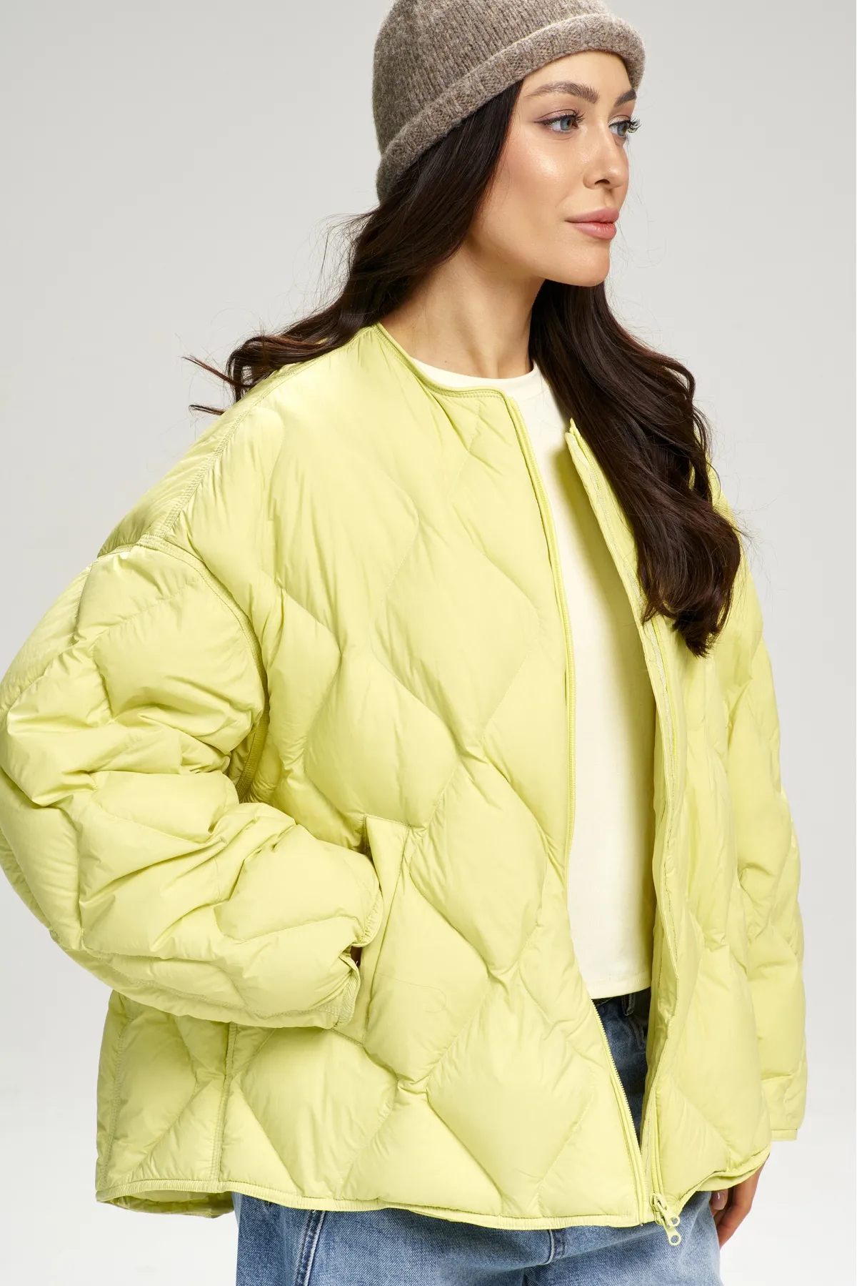 Стеганная куртка с натуральным наполнителем — объёмная и при этом лёгкая благодаря утиному пуху, который отлично сохраняет тепло. Модель без воротника и со слегка удлинённой спинкой защищает от ветра и выглядит современно и минималистично. Застёжка на молнии и кулиса по низу дают два варианта носки: затяните, чтобы носить как бомбер или оставьте свободной для объёма. Такая куртка легко впишется в городской гардероб