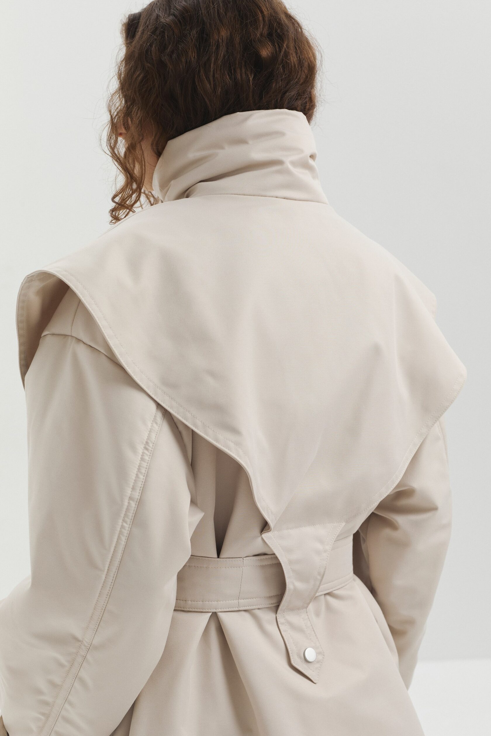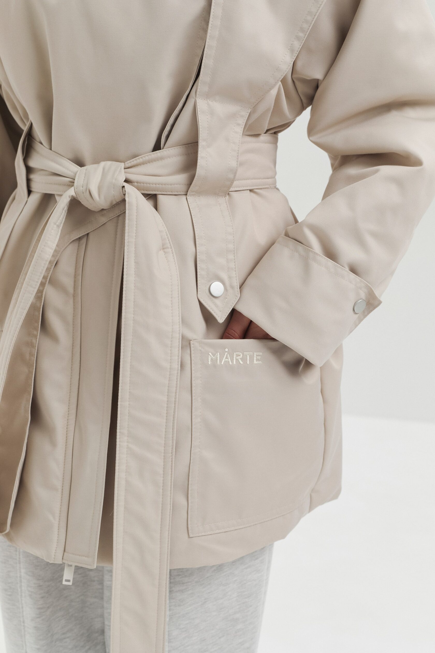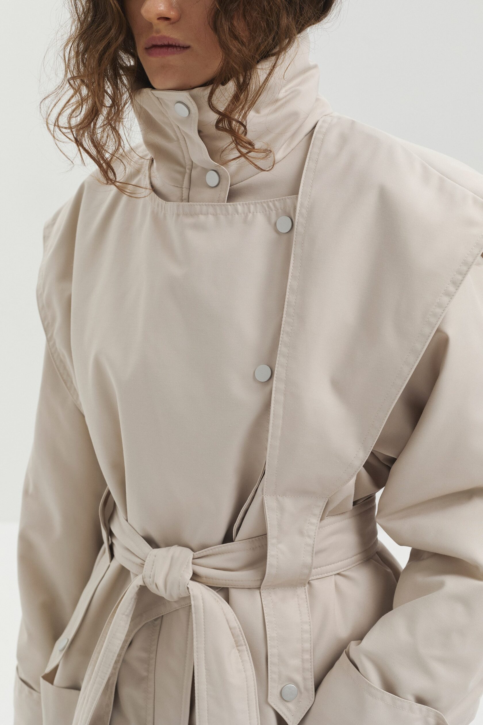 Куртка SHARE выполнена из мембранной ткани с водоотталкивающей пропиткой. Высокий воротник защищает от ветра и служит выразительной акцентной деталью. Конструктивные элементы придают изделию утончённый силуэт, а с помощью пояса прямой крой легко превращается в приталенный.