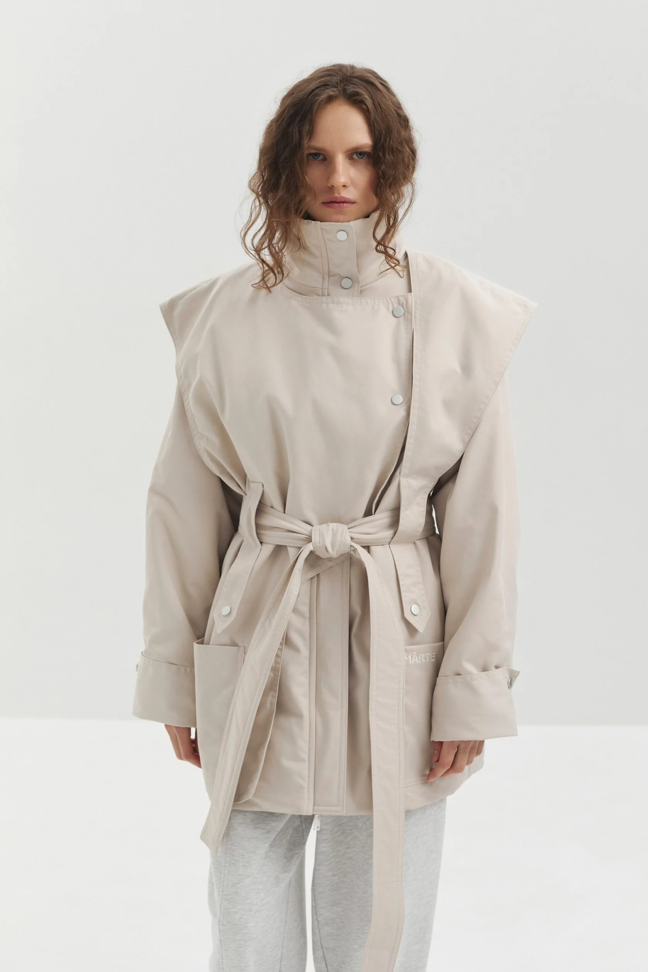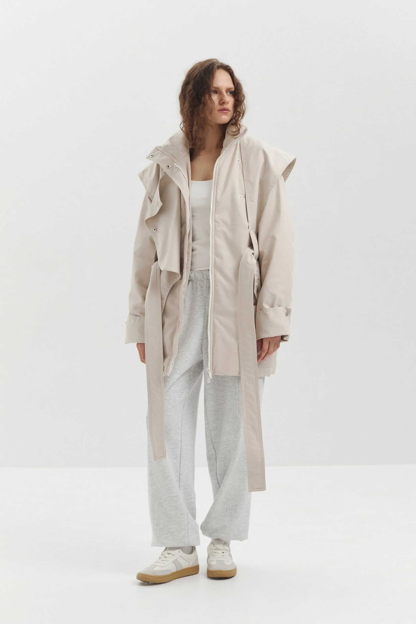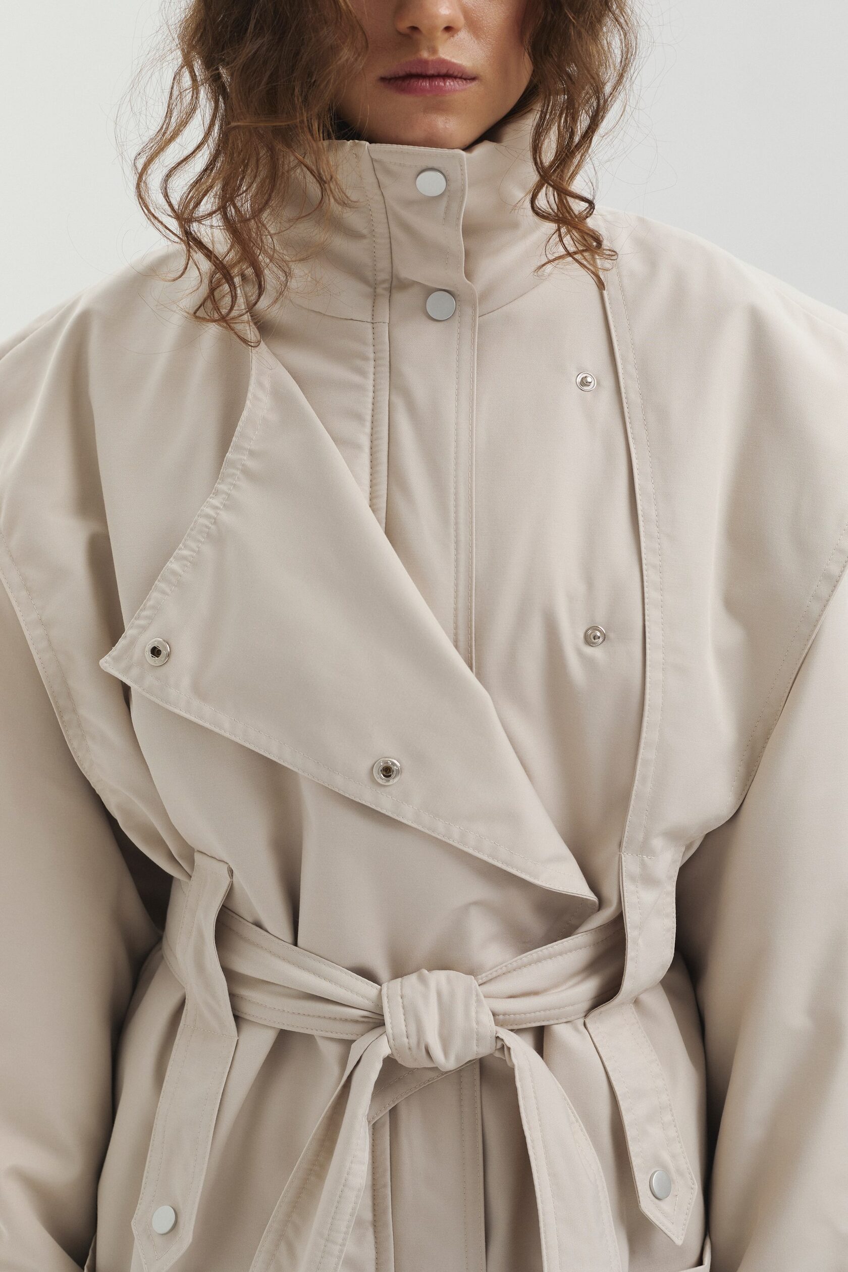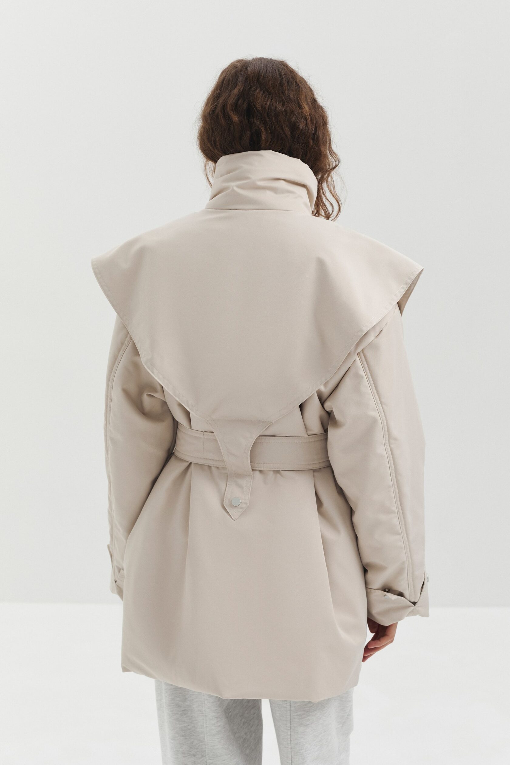 Куртка SHARE выполнена из мембранной ткани с водоотталкивающей пропиткой. Высокий воротник защищает от ветра и служит выразительной акцентной деталью. Конструктивные элементы придают изделию утончённый силуэт, а с помощью пояса прямой крой легко превращается в приталенный.
