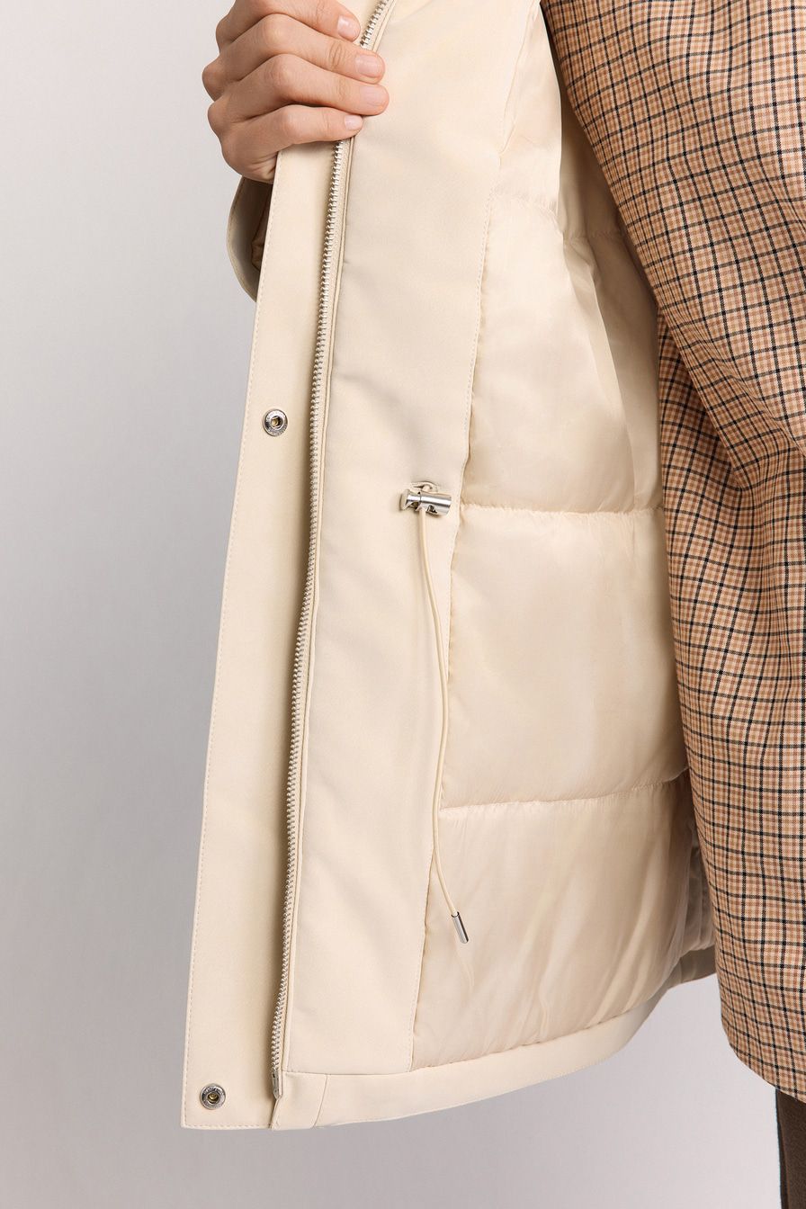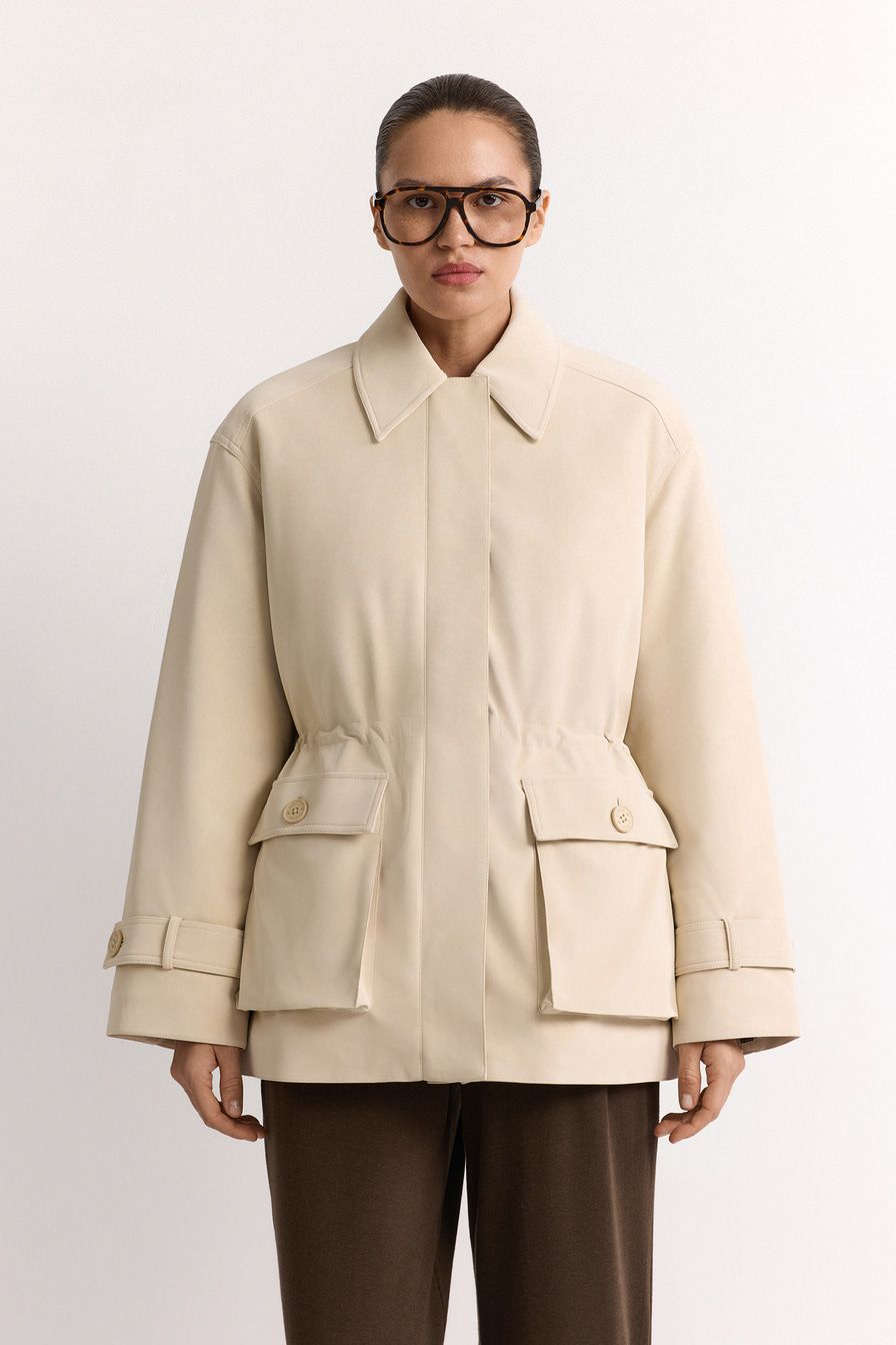 Утепленная куртка-парка с наполнителем из синтепона выполнена из экозамши на основе смесового хлопка, дополнена отложным воротником, крупными накладными карманами, хлястиками на рукавах и кулиской на поясе.