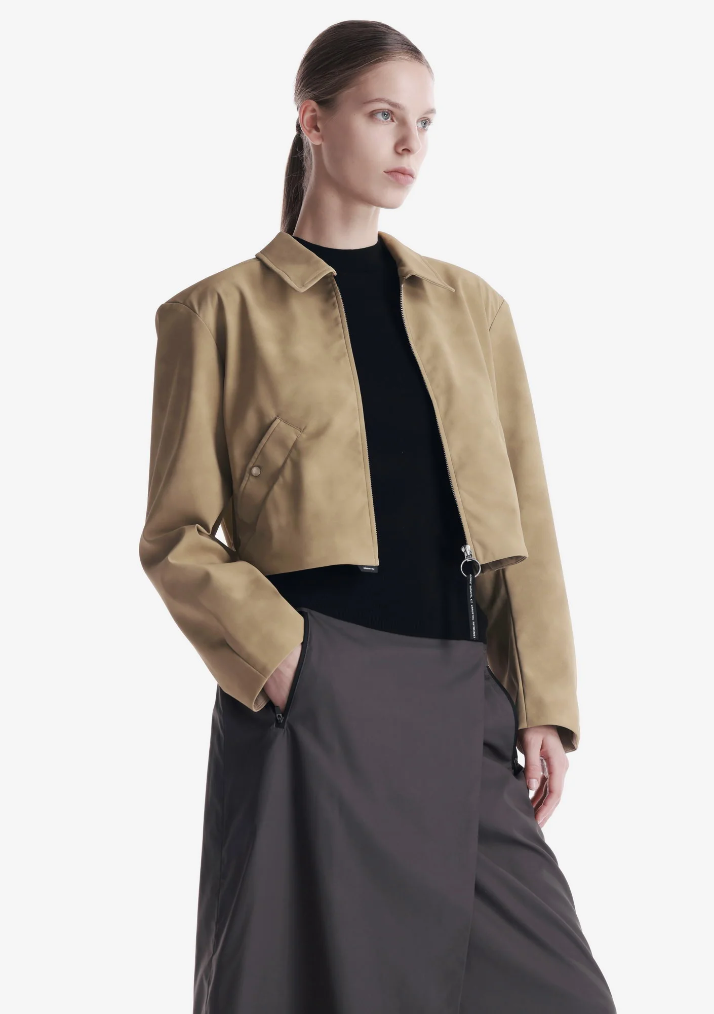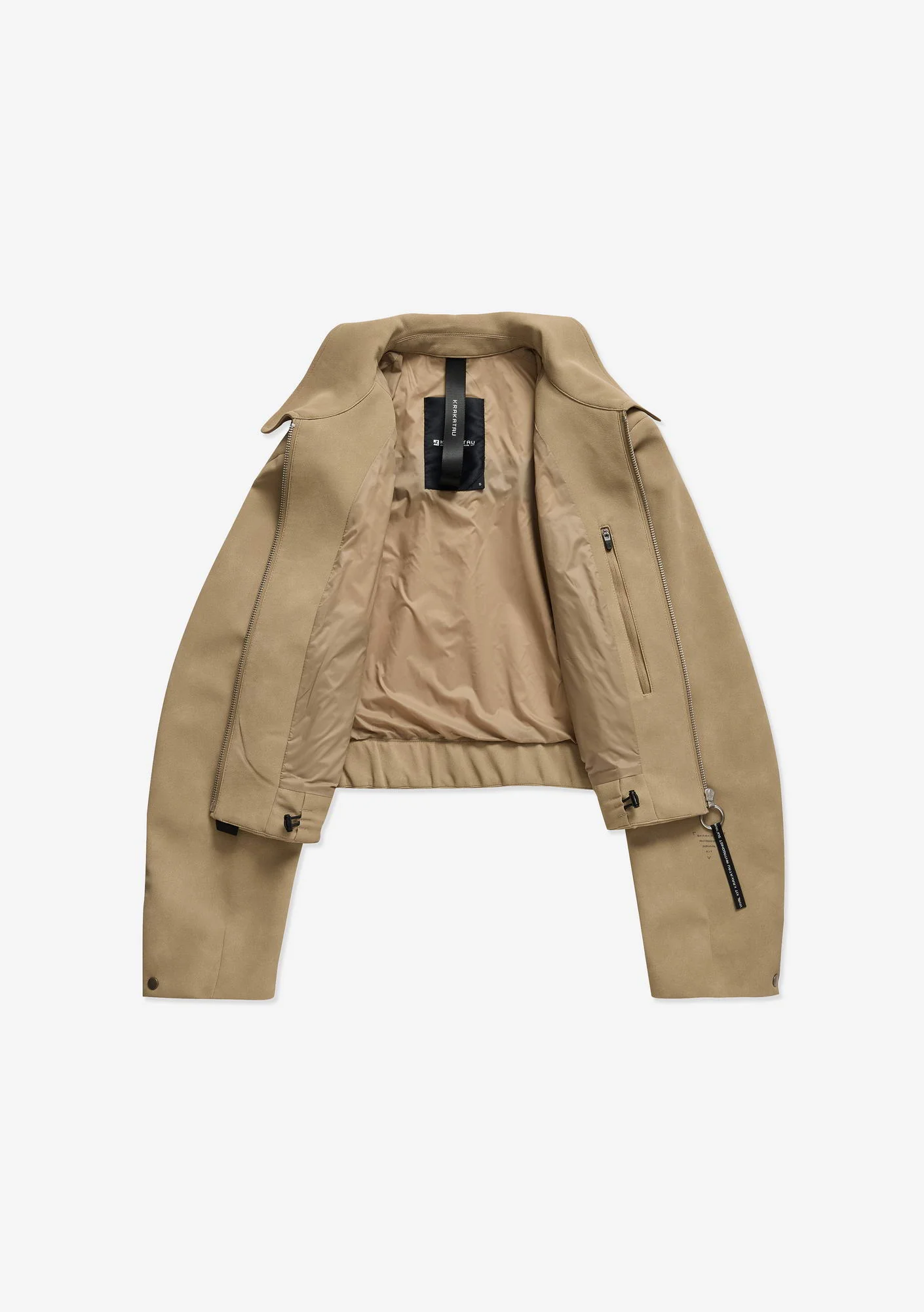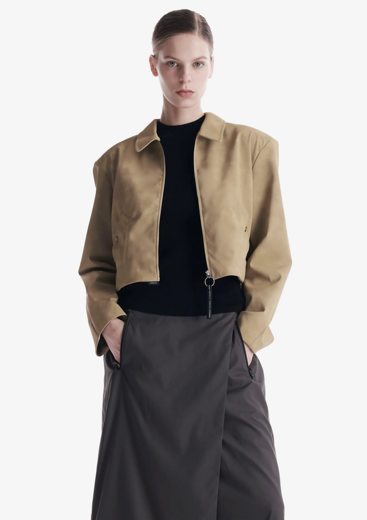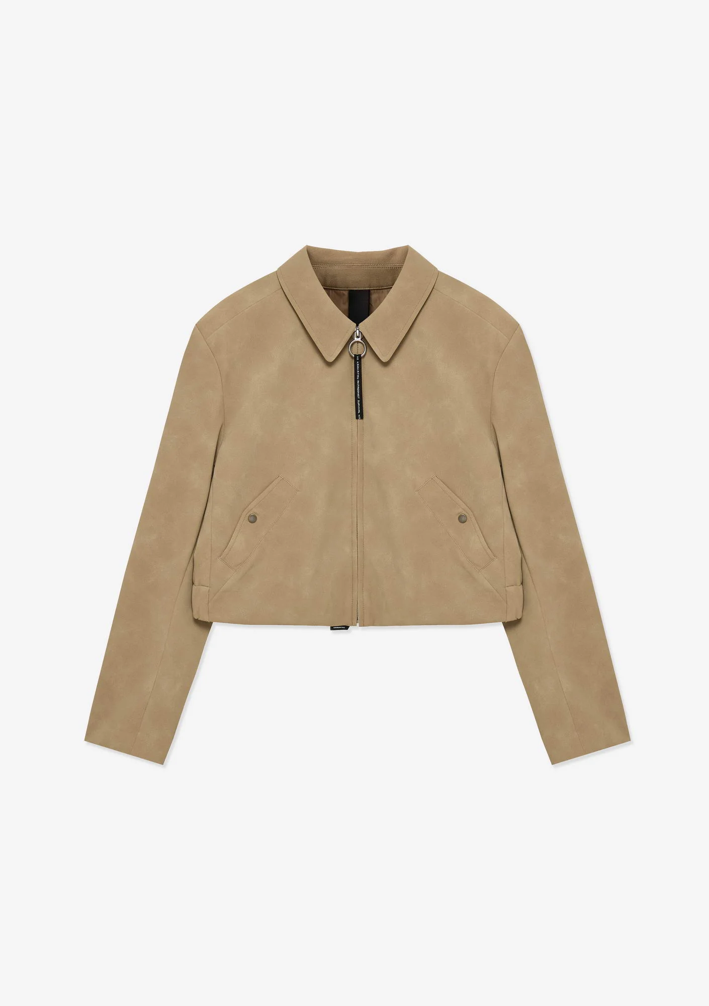 Укороченная куртка из эко-замши с матовой бархатистой поверхностью и чистым минималистичным кроем. Плотная структура материала формирует чёткий силуэт, а регулируемый низ и манжеты позволяют точно настроить посадку, сохраняя лёгкость и архитектурную выразительность модели.
