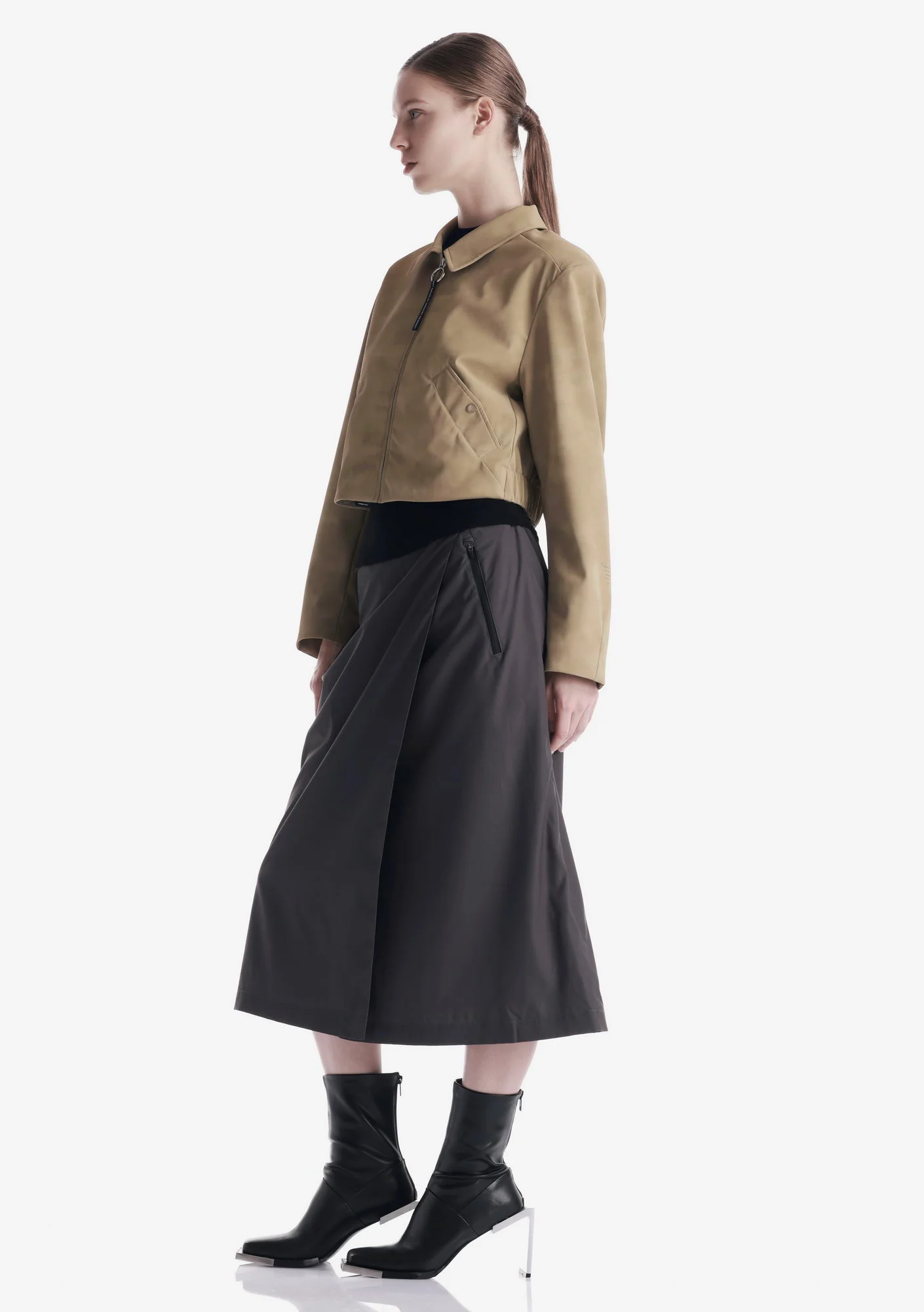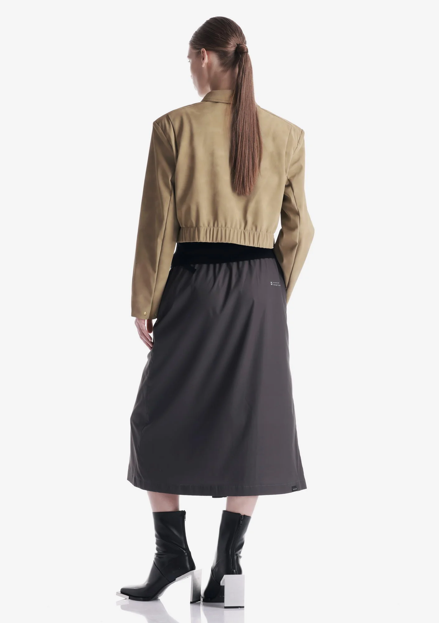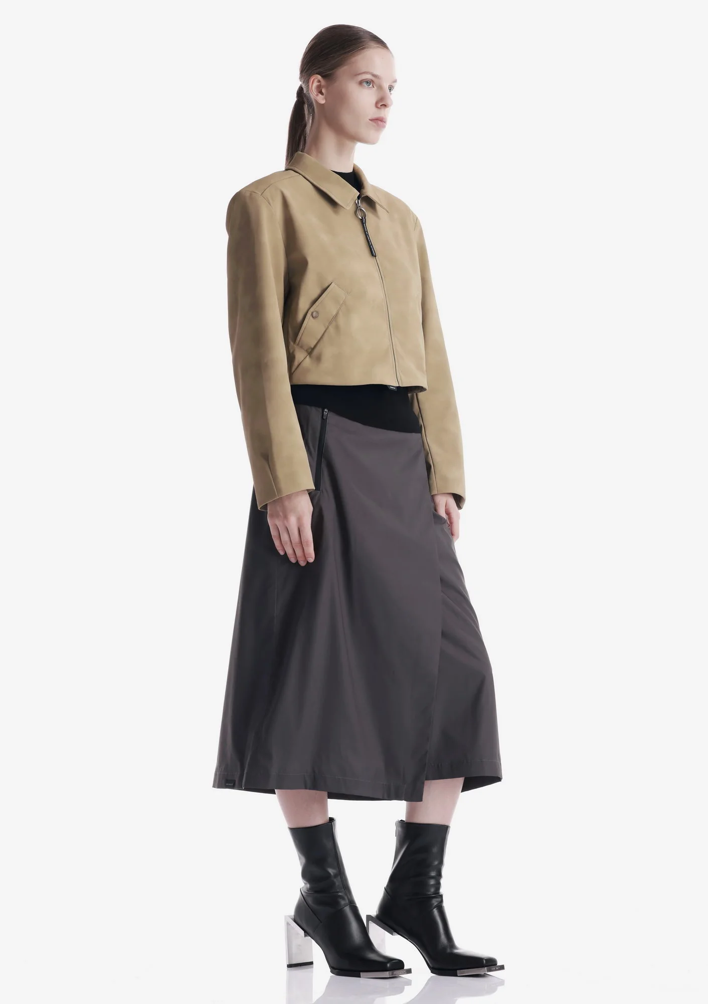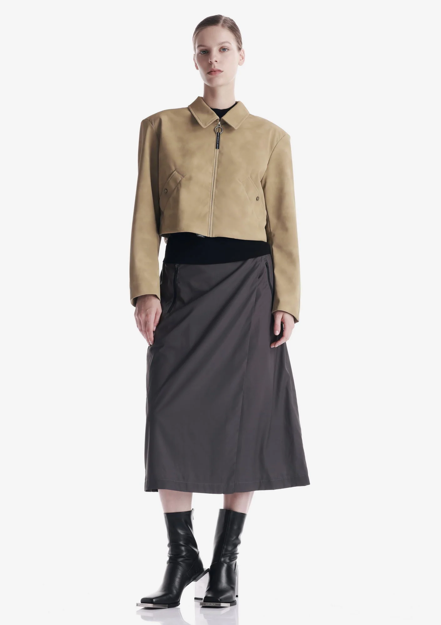Укороченная куртка из эко-замши с матовой бархатистой поверхностью и чистым минималистичным кроем. Плотная структура материала формирует чёткий силуэт, а регулируемый низ и манжеты позволяют точно настроить посадку, сохраняя лёгкость и архитектурную выразительность модели.