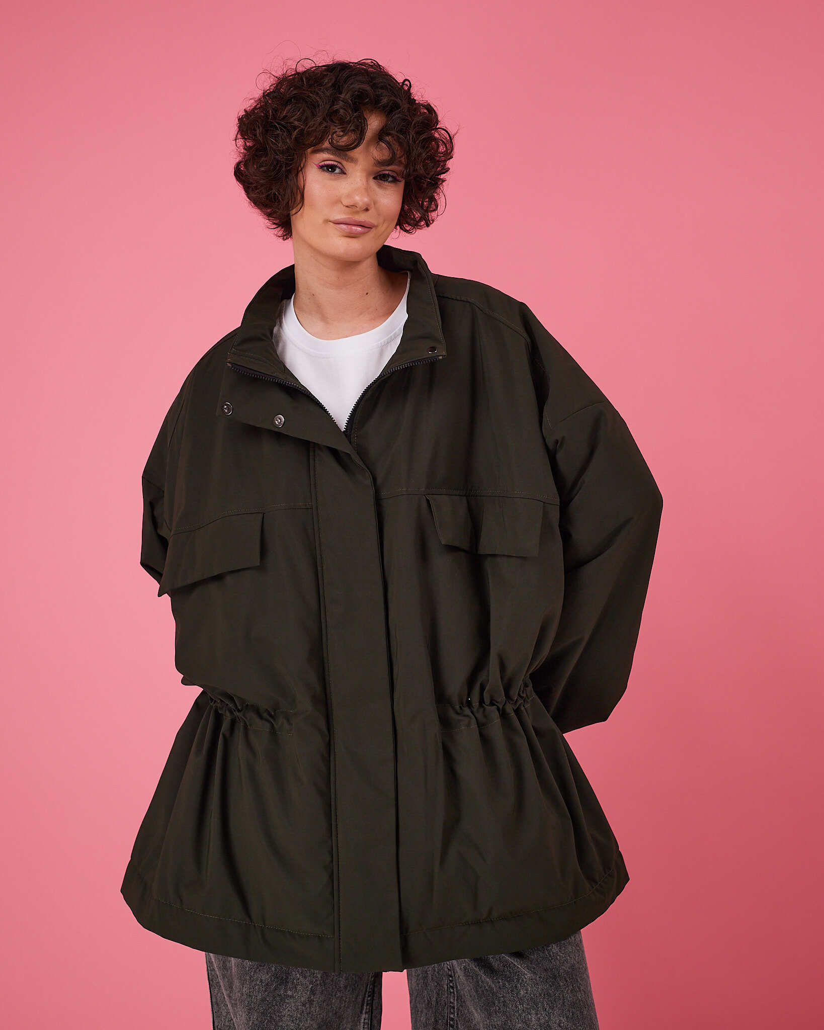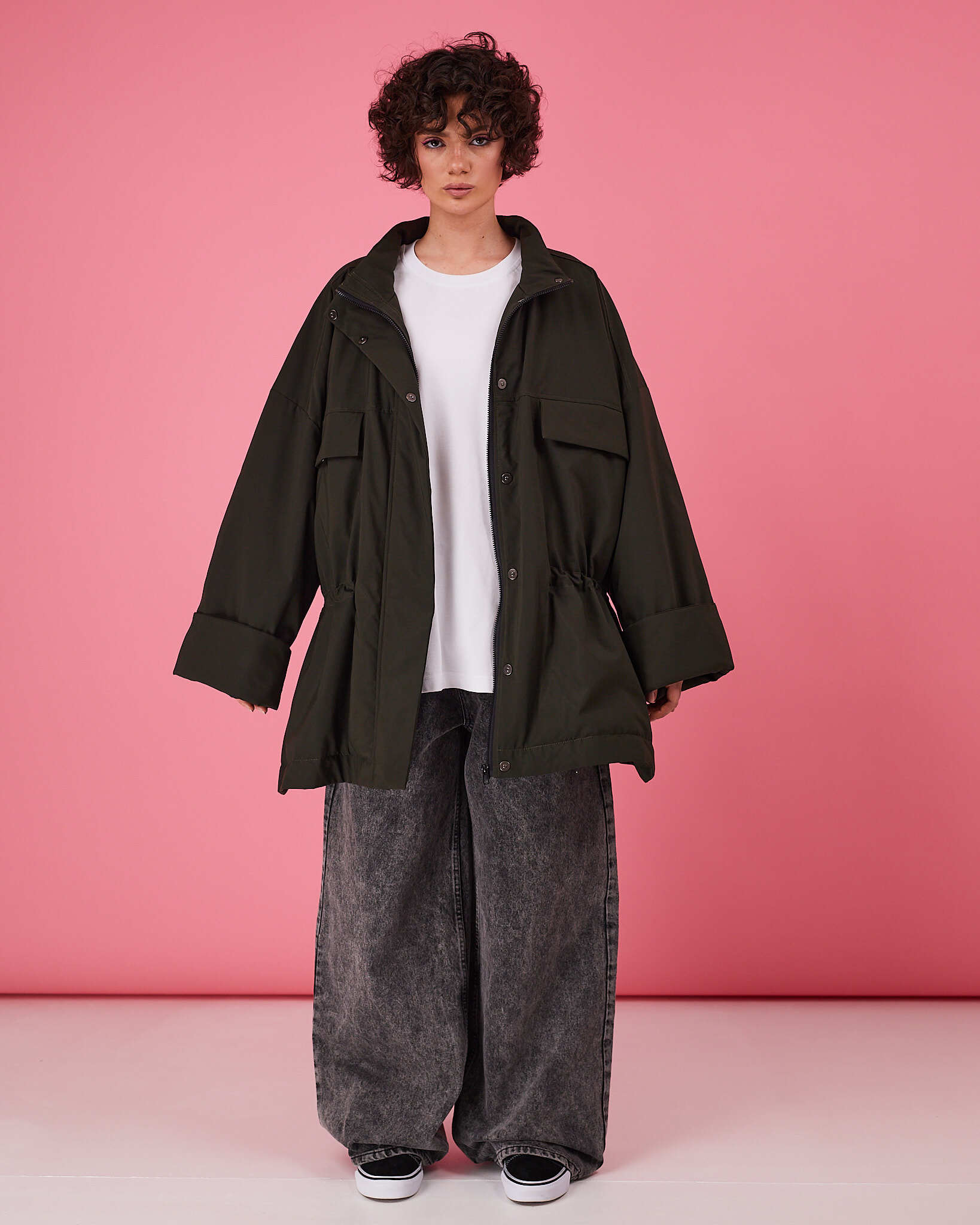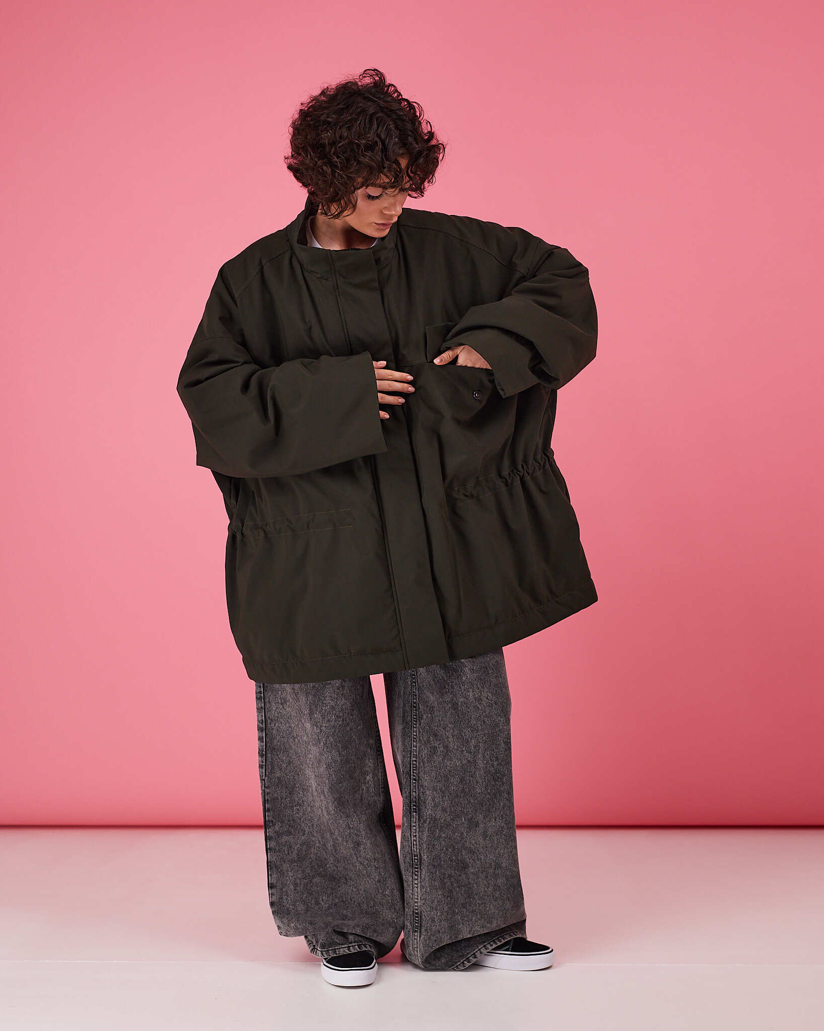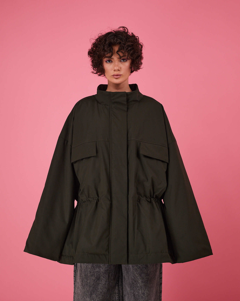 Куртка выполнена в актуальном свободном силуэте с возможностью трансформации: благодаря кулиске по талии вы легко меняете посадку — носите куртку расслабленно оверсайз или подчеркните фигуру, затянув её.