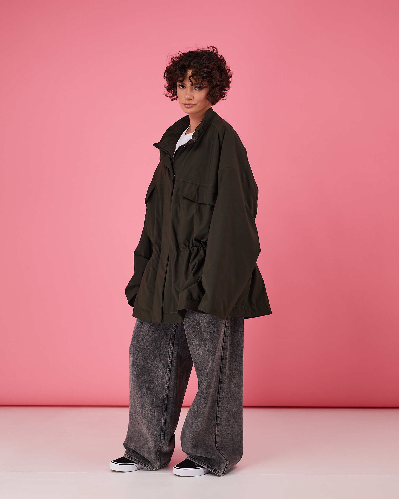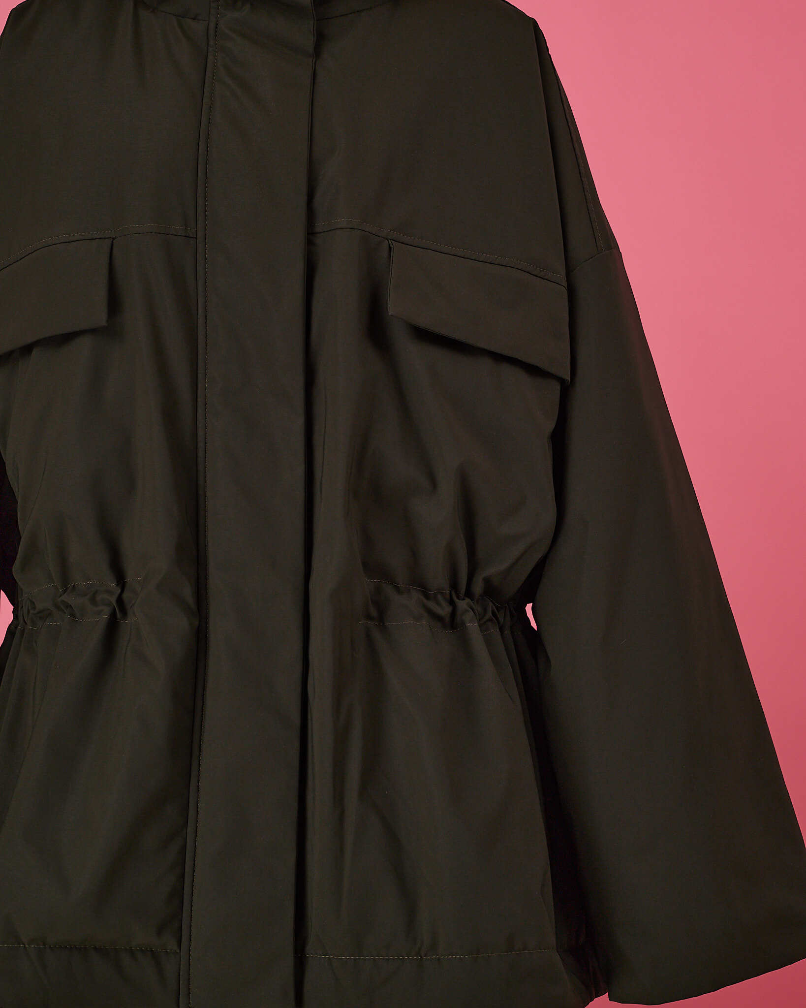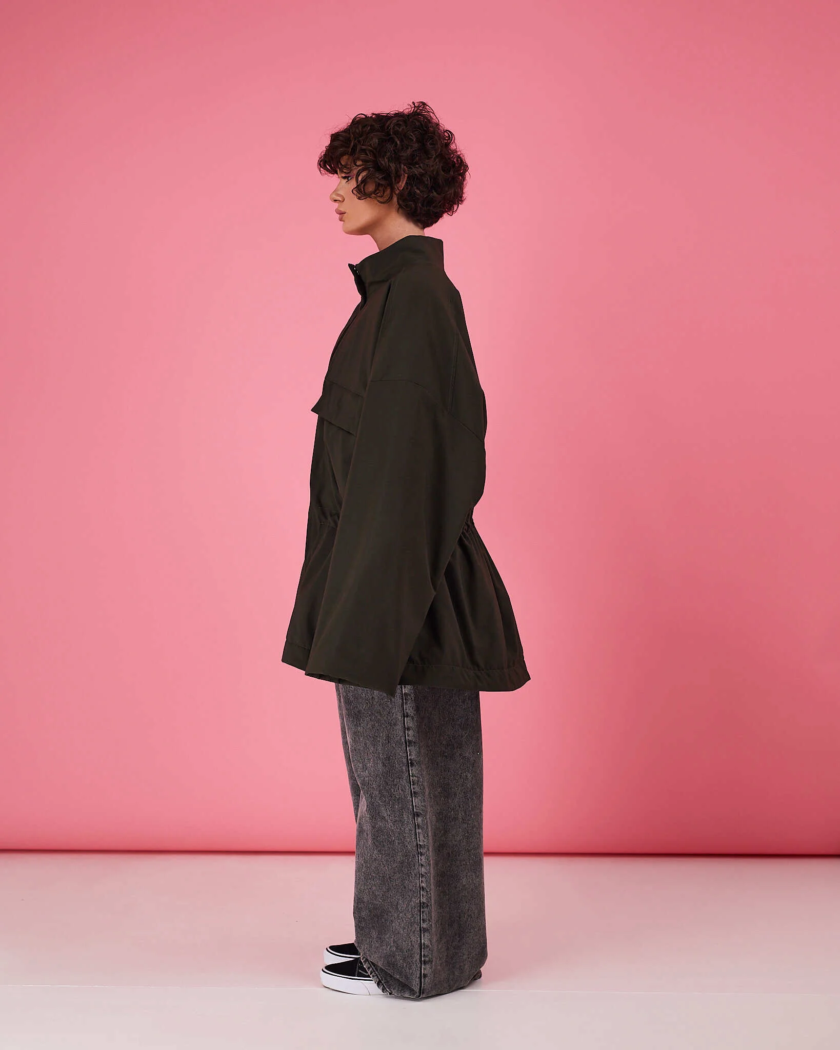 Куртка выполнена в актуальном свободном силуэте с возможностью трансформации: благодаря кулиске по талии вы легко меняете посадку — носите куртку расслабленно оверсайз или подчеркните фигуру, затянув её.