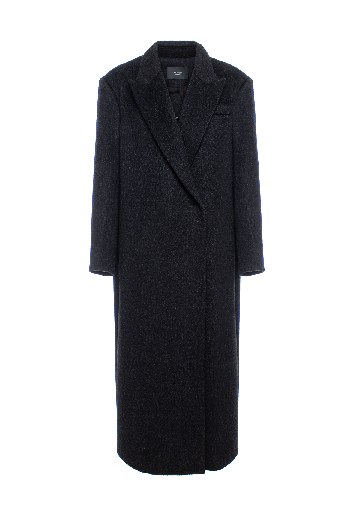 Женское двубортное пальто Laplandia из премиальной шерсти. Модель прямого силуэта в мужском стиле длины-макси, английский воротник, втачной рукав, карманы в боковом шве, высокая шлица по спинке, застежка на пуговицы.