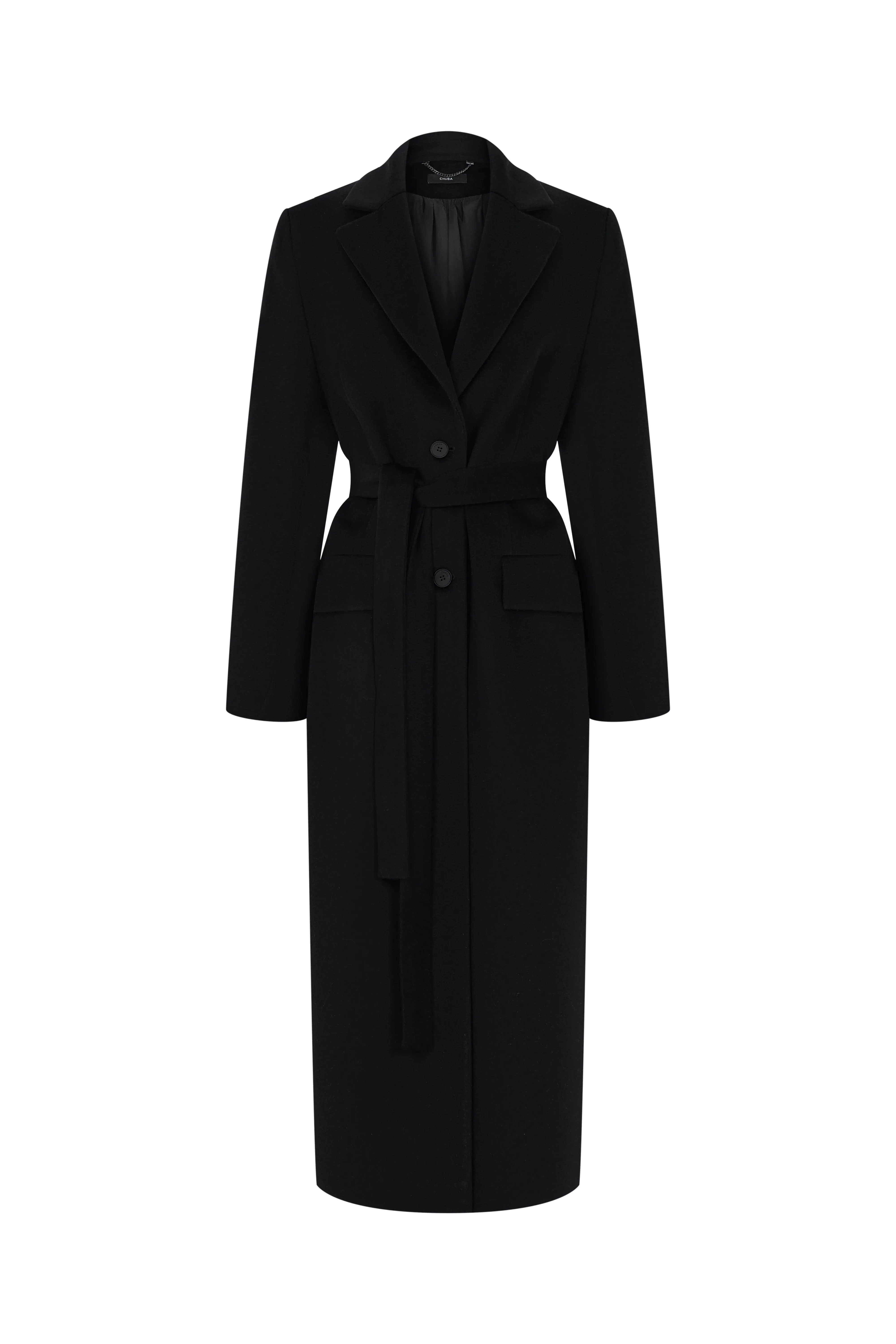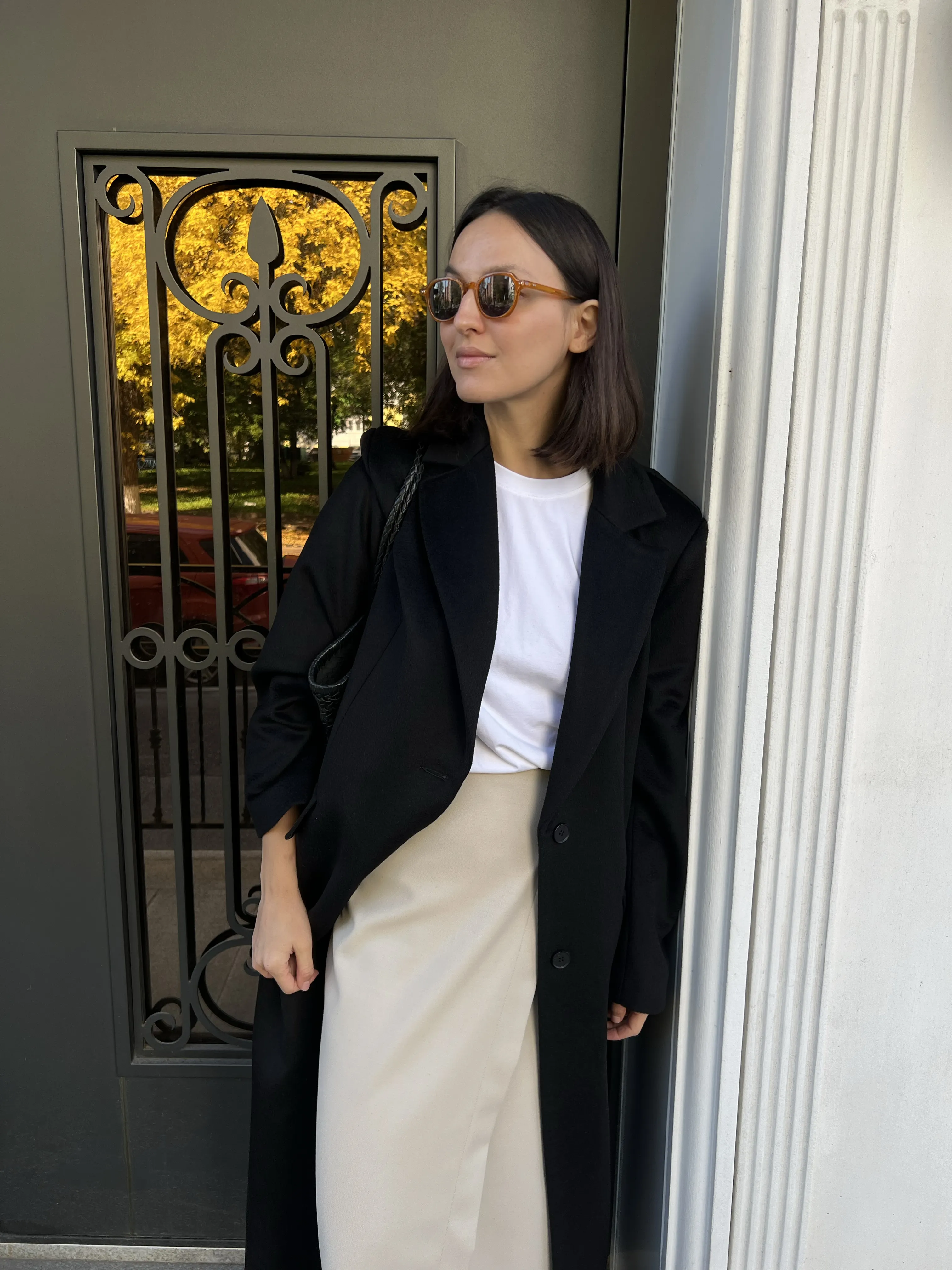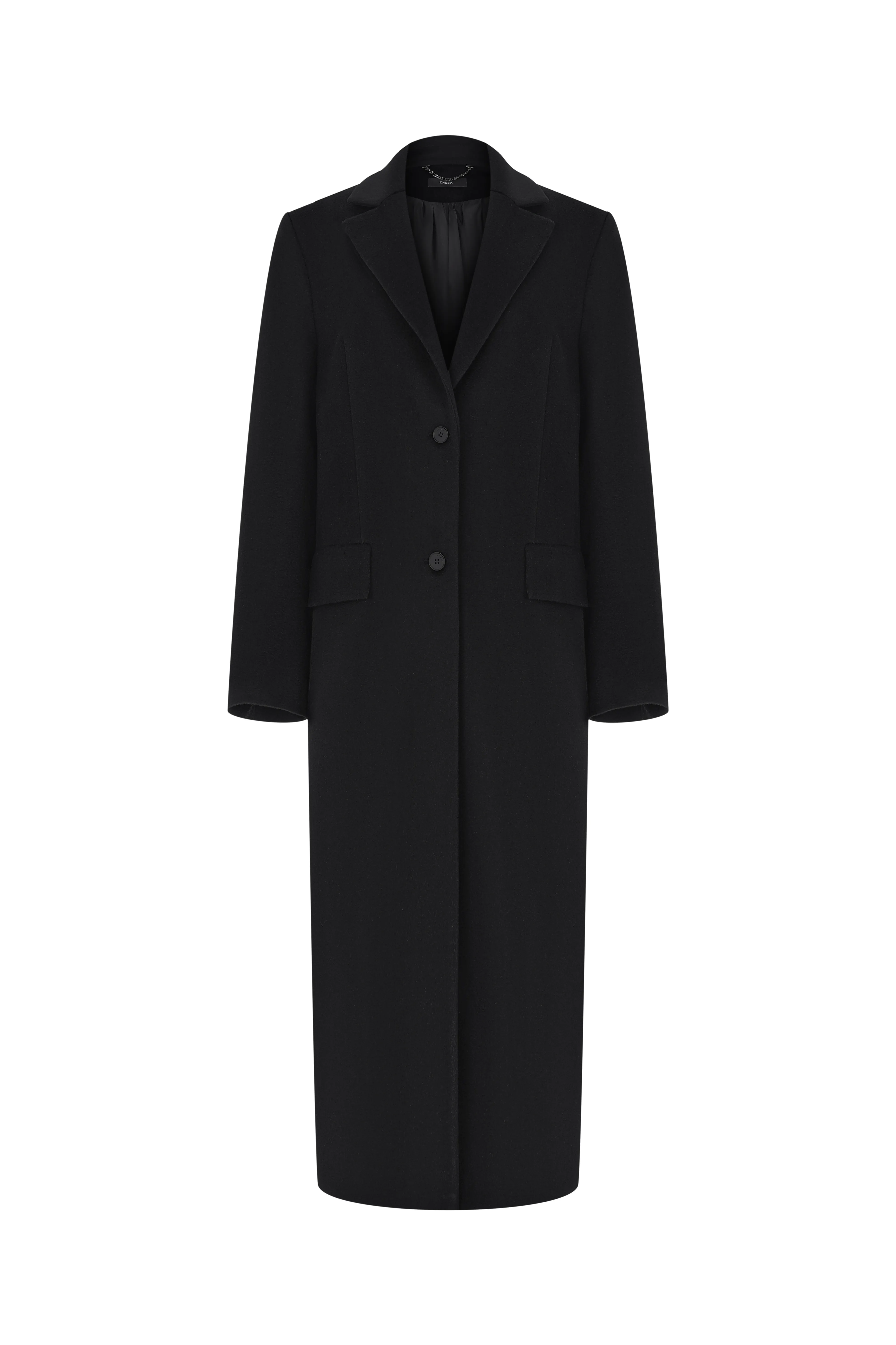 Акцентное пальто в черном цвете. 100% шерсть, прямой силуэт и умеренный объем.