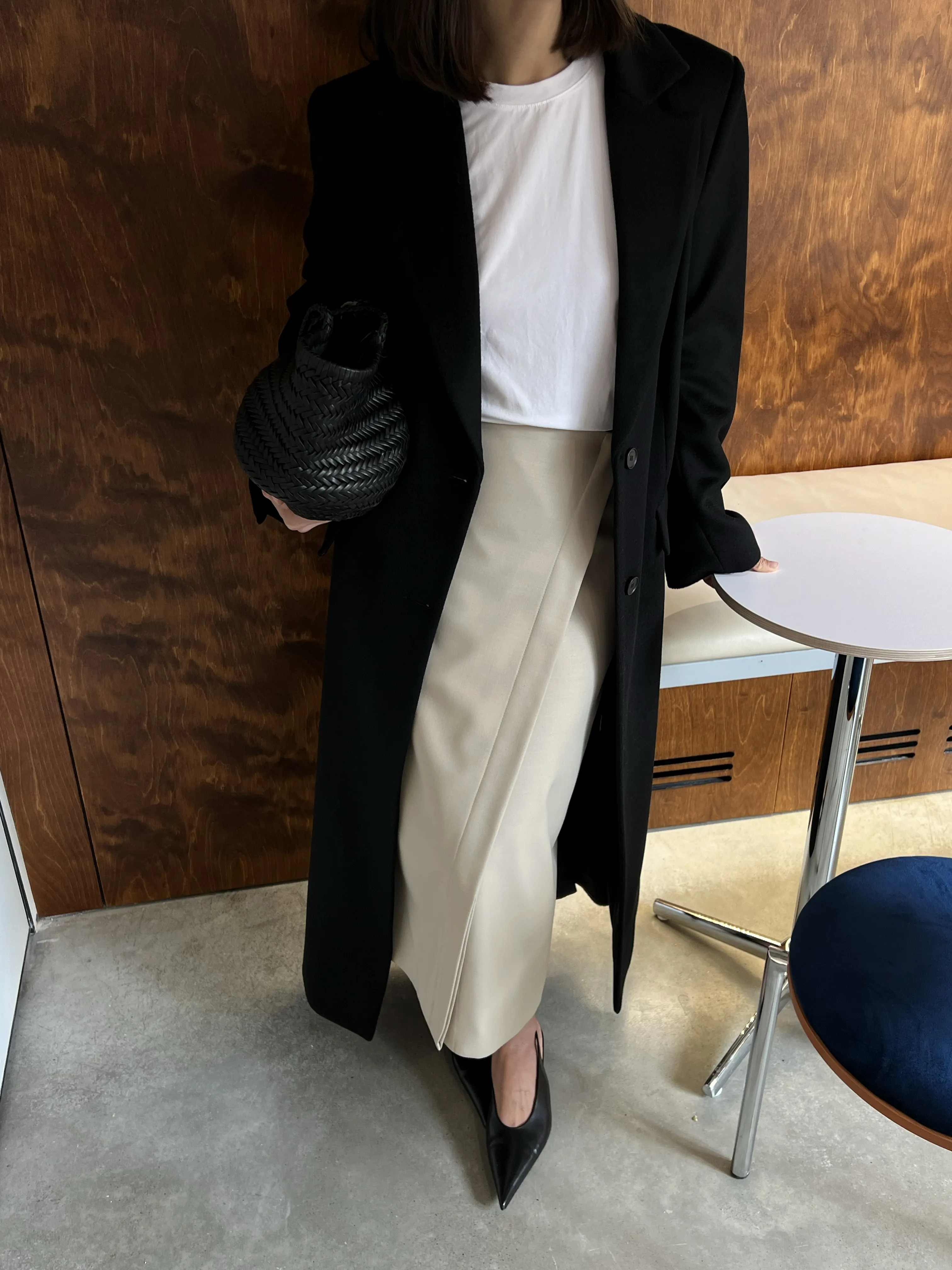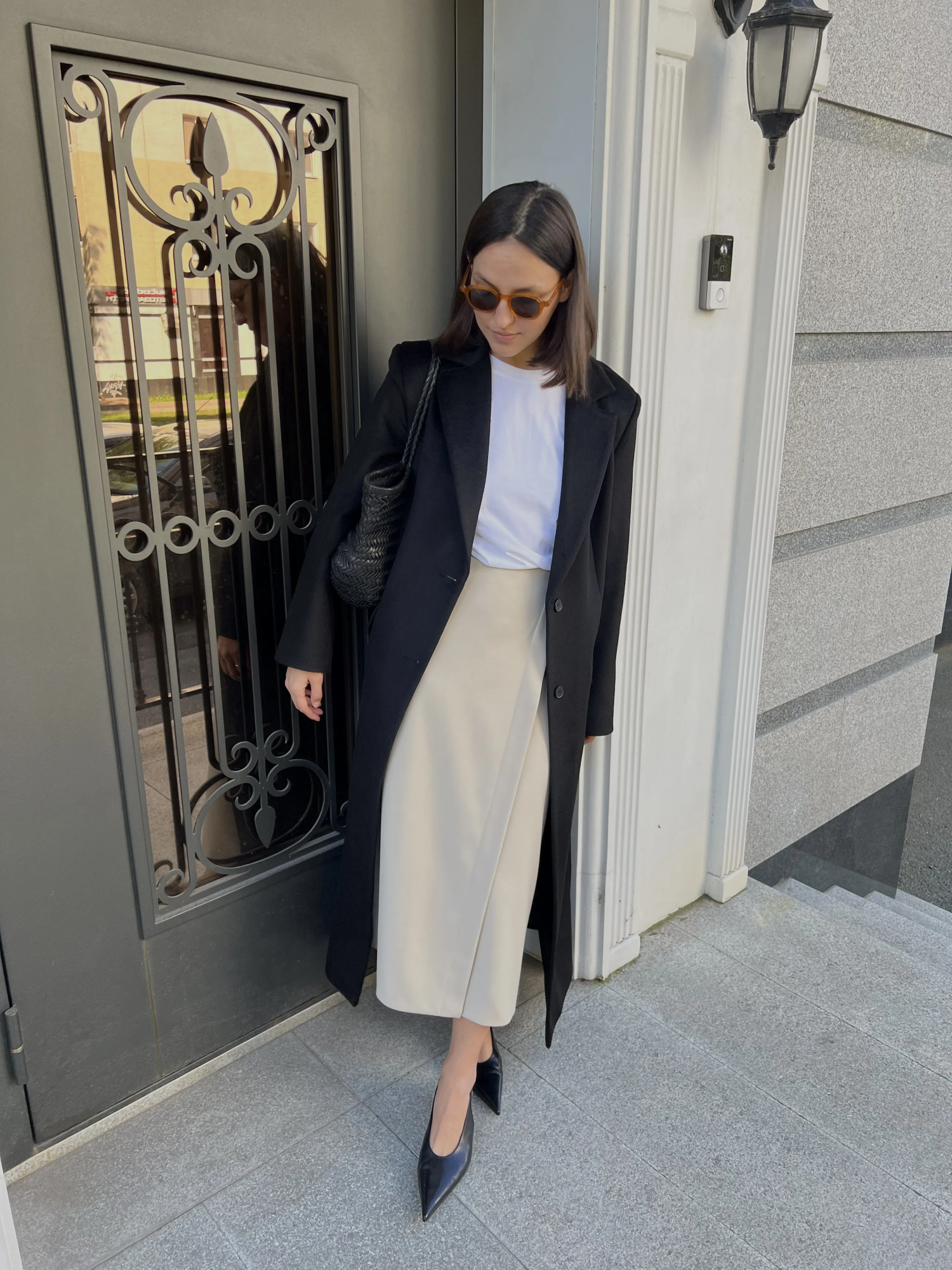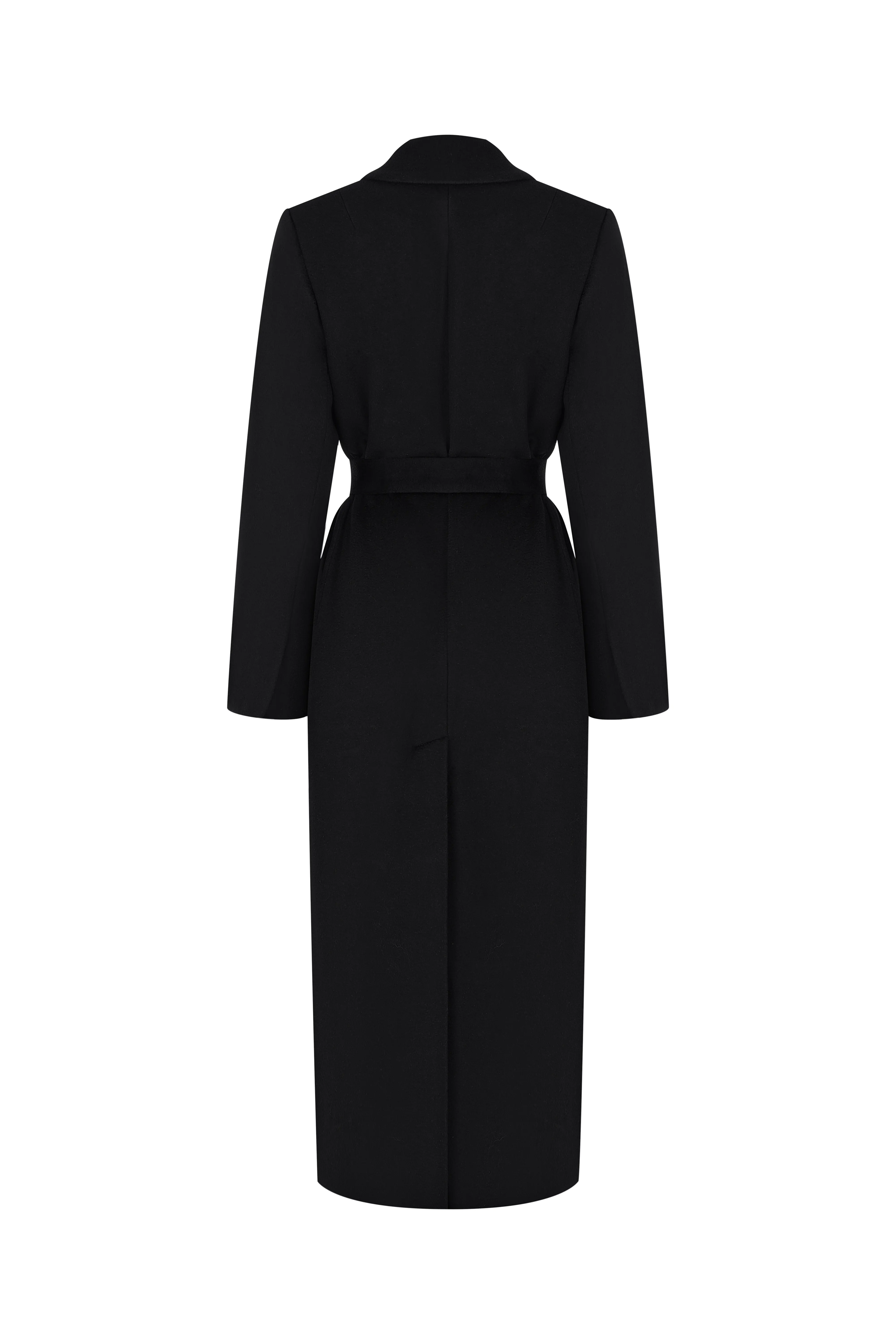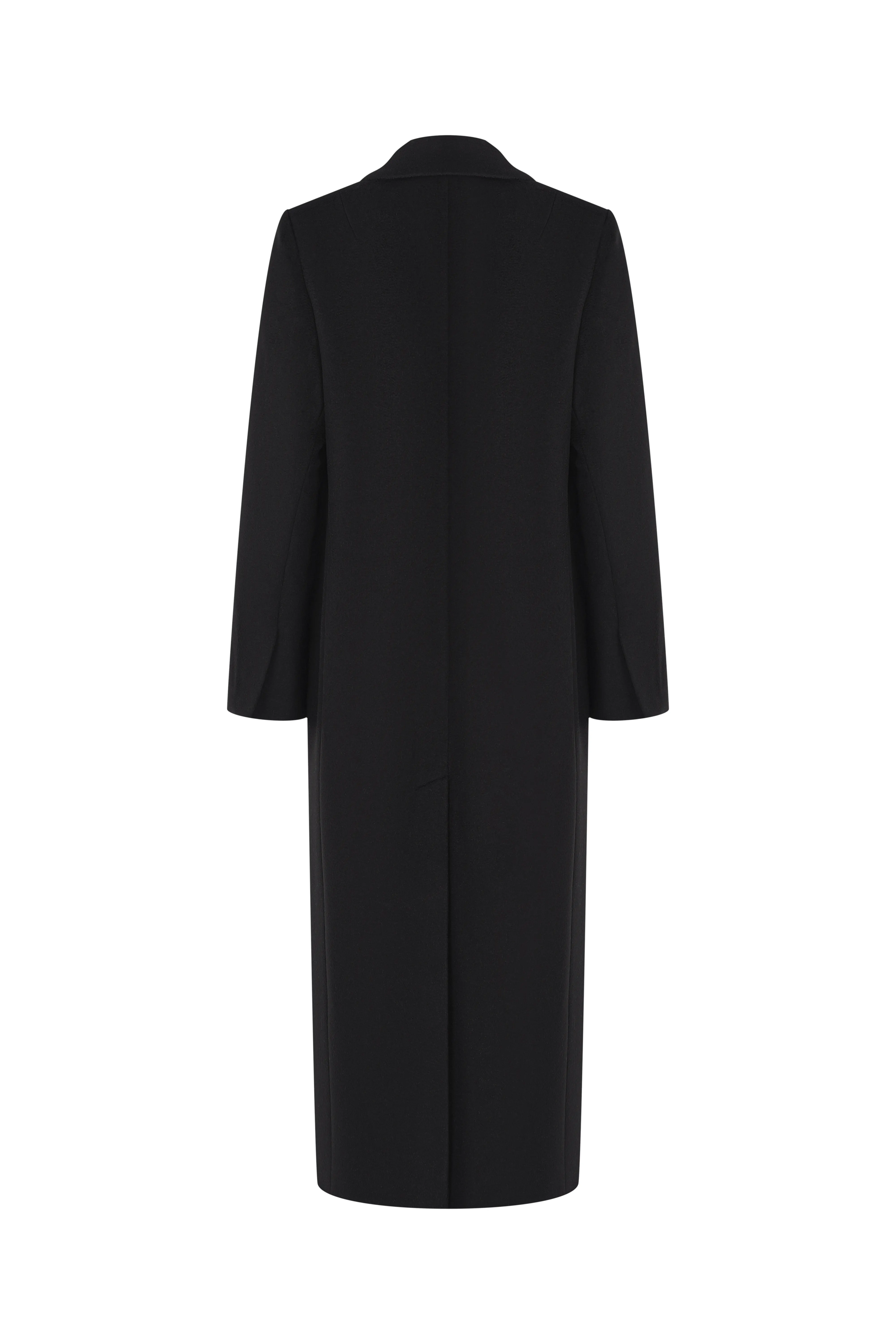 Акцентное пальто в черном цвете. 100% шерсть, прямой силуэт и умеренный объем.