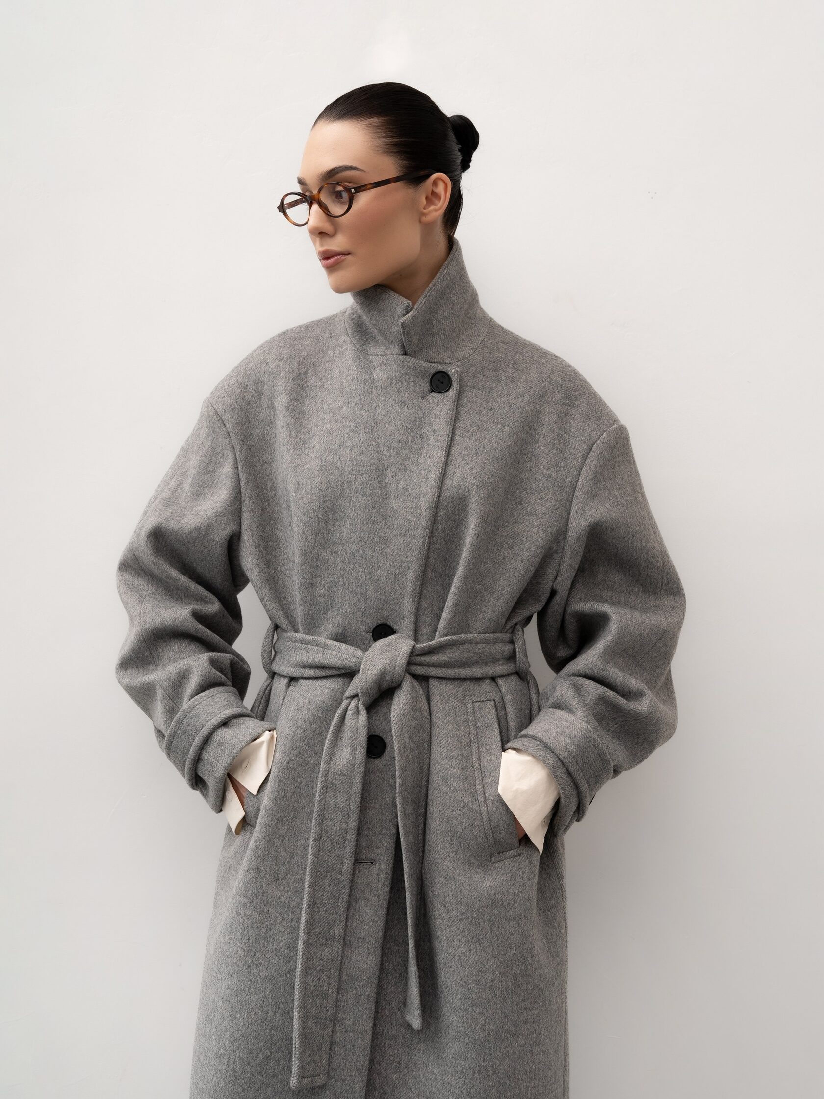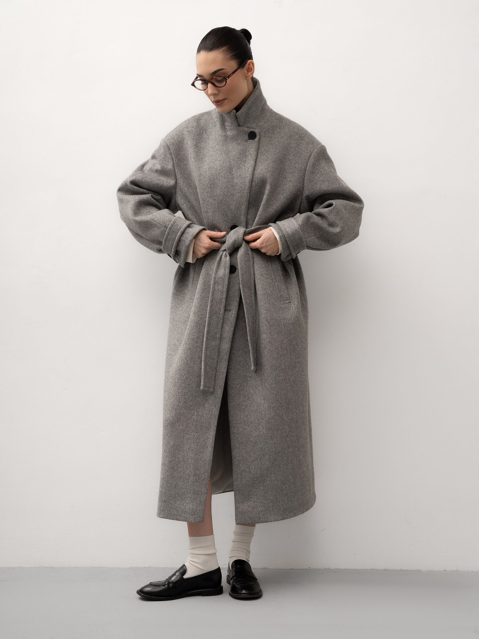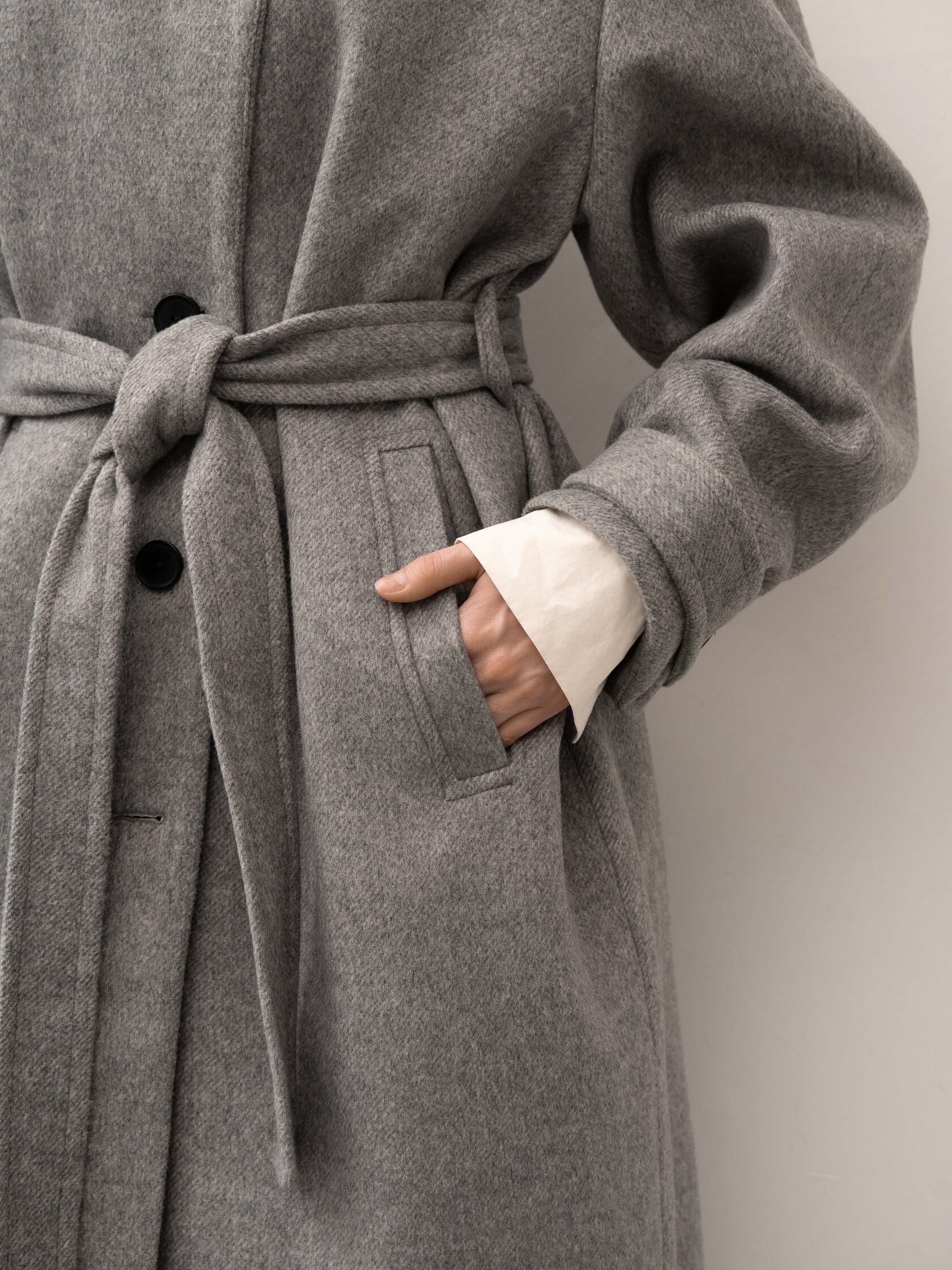 Серое пальто с поясом создает женственный образ без потери комфорта и подчеркивает фигуру. Шерсть в составе делает пальто теплым и подходящим для холодного сезона, а лаконичный дизайн позволяет носить его как с повседневными комплектами, так и с более элегантными образами. Универсальная вещь для спокойного городского гардероба.