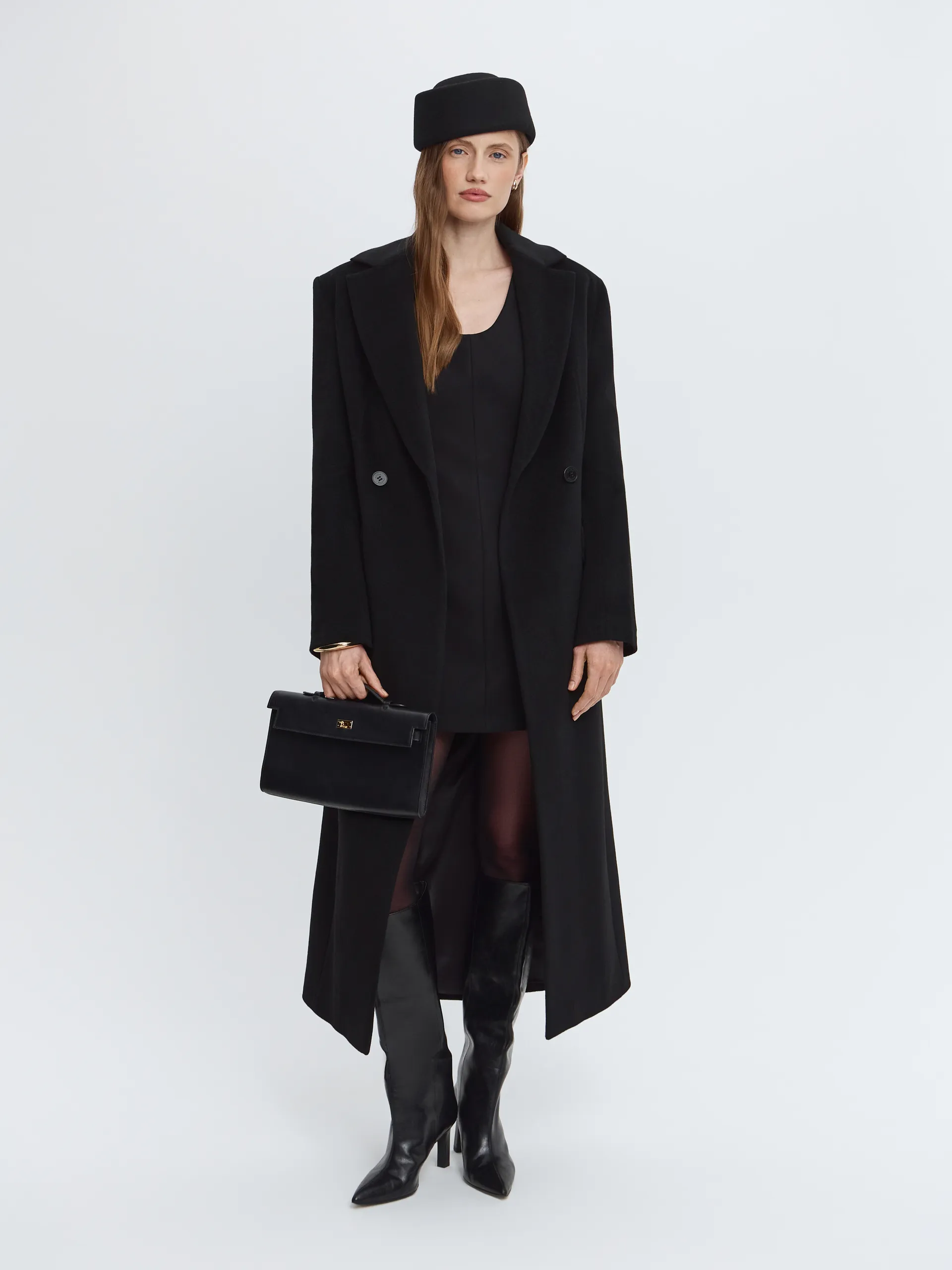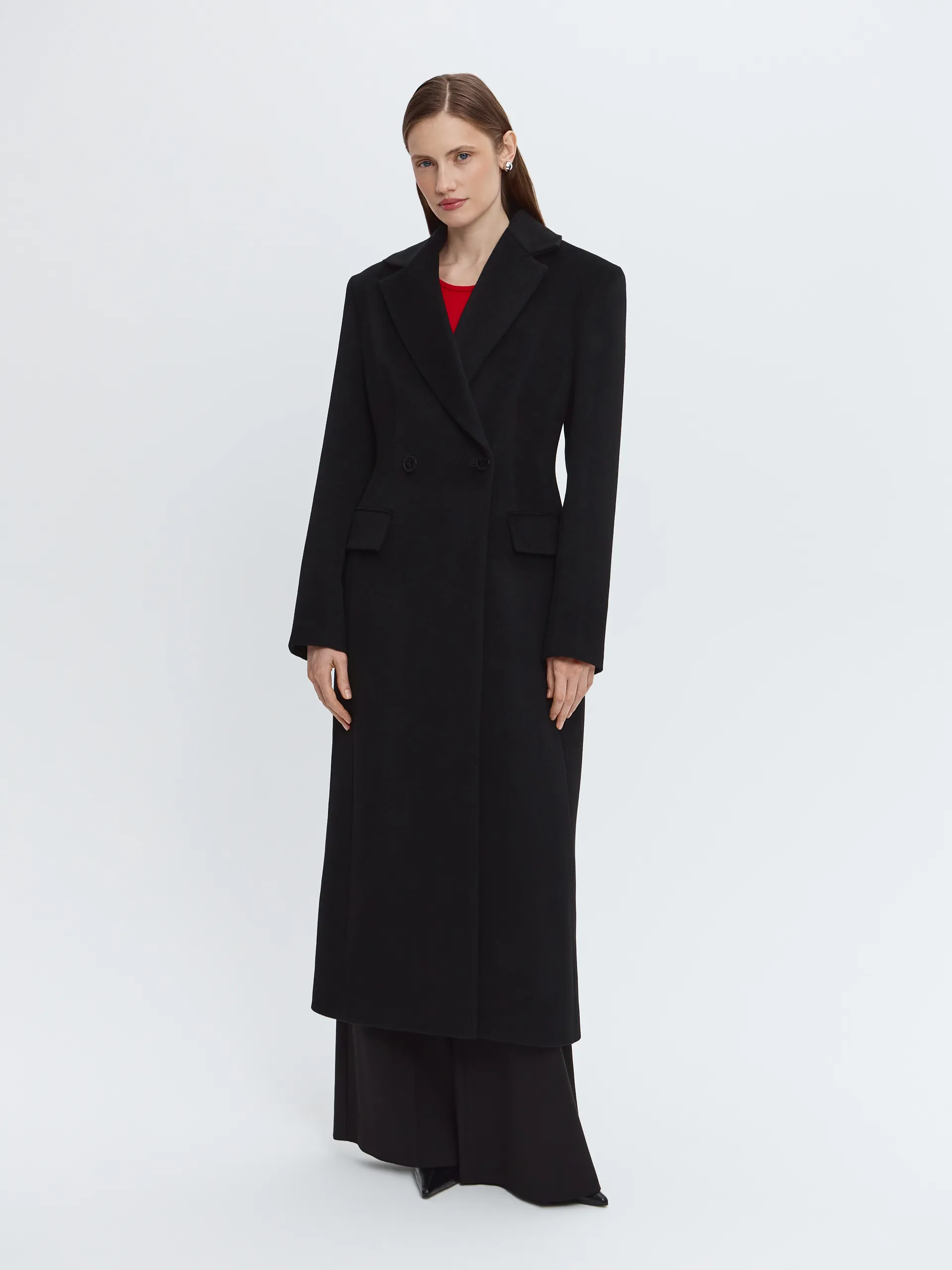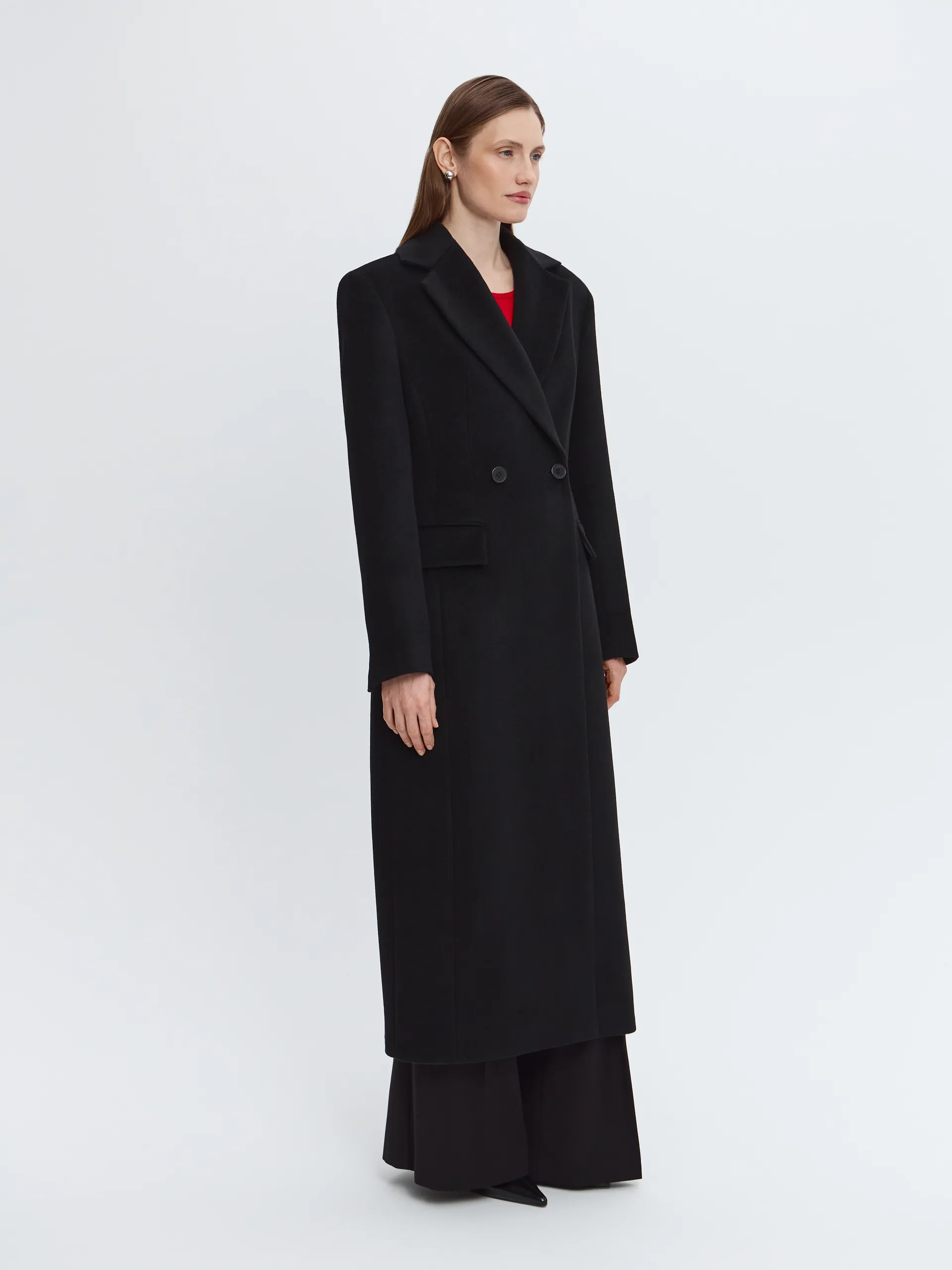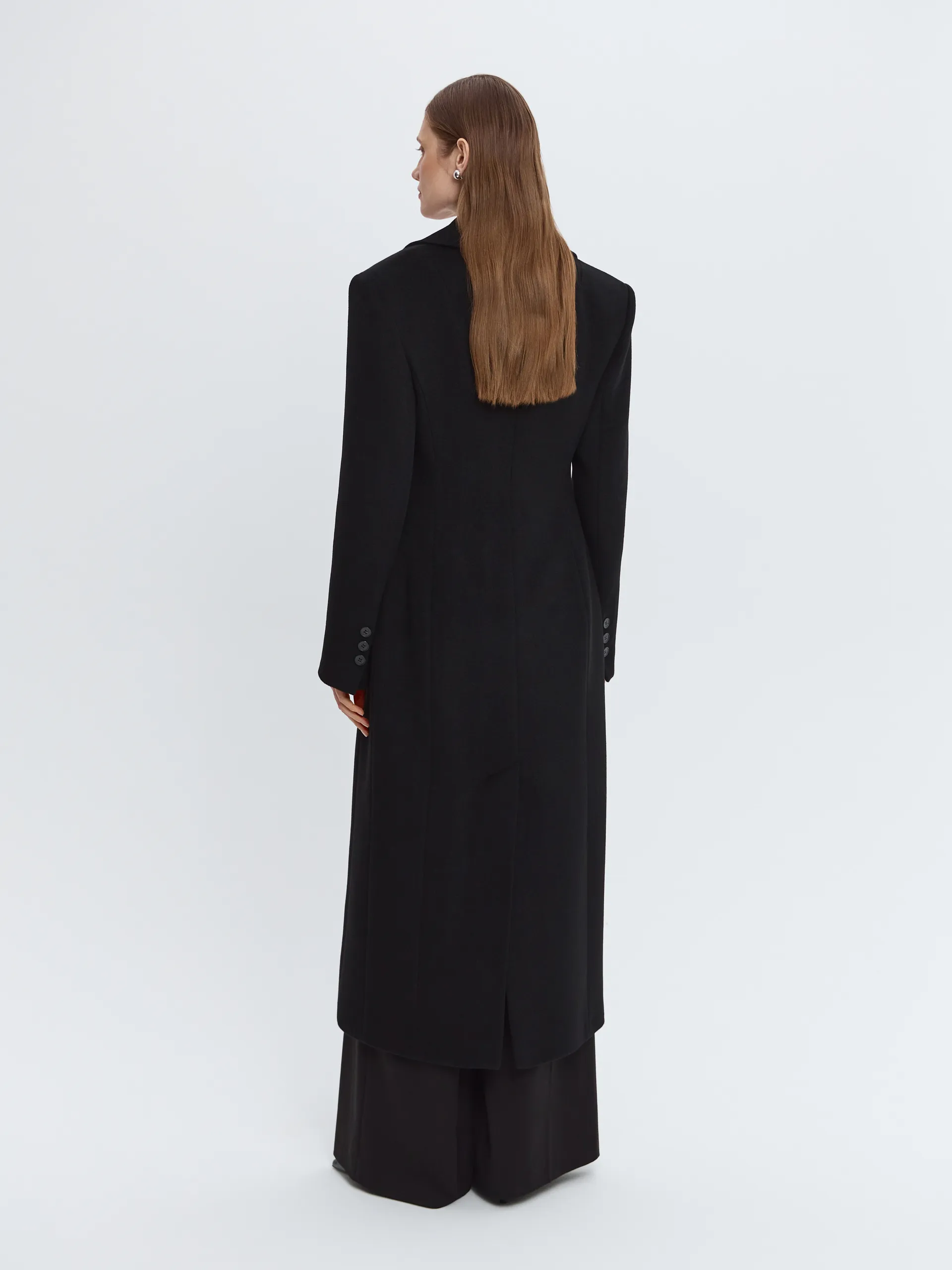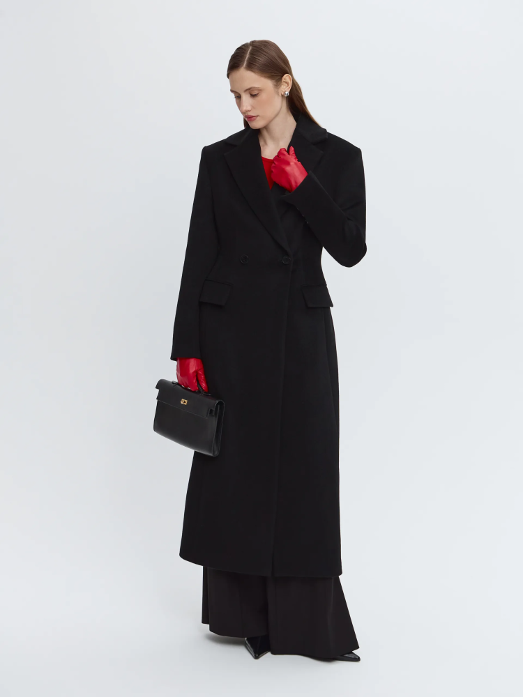 Чёрная элегантная модель из премиальной шерсти, которая поддерживает комфортную температуру и надолго сохраняет аккуратный внешний вид. Выверенный крой и чёткая линия силуэта визуально вытягивают фигуру, делая образ собранным и выразительным. Увеличенная линия плеч добавляет характер и современный акцент. Пальто легко стилизовать с обувью на каблуке или на плоском ходу, дополняя образ яркими аксессуарами.