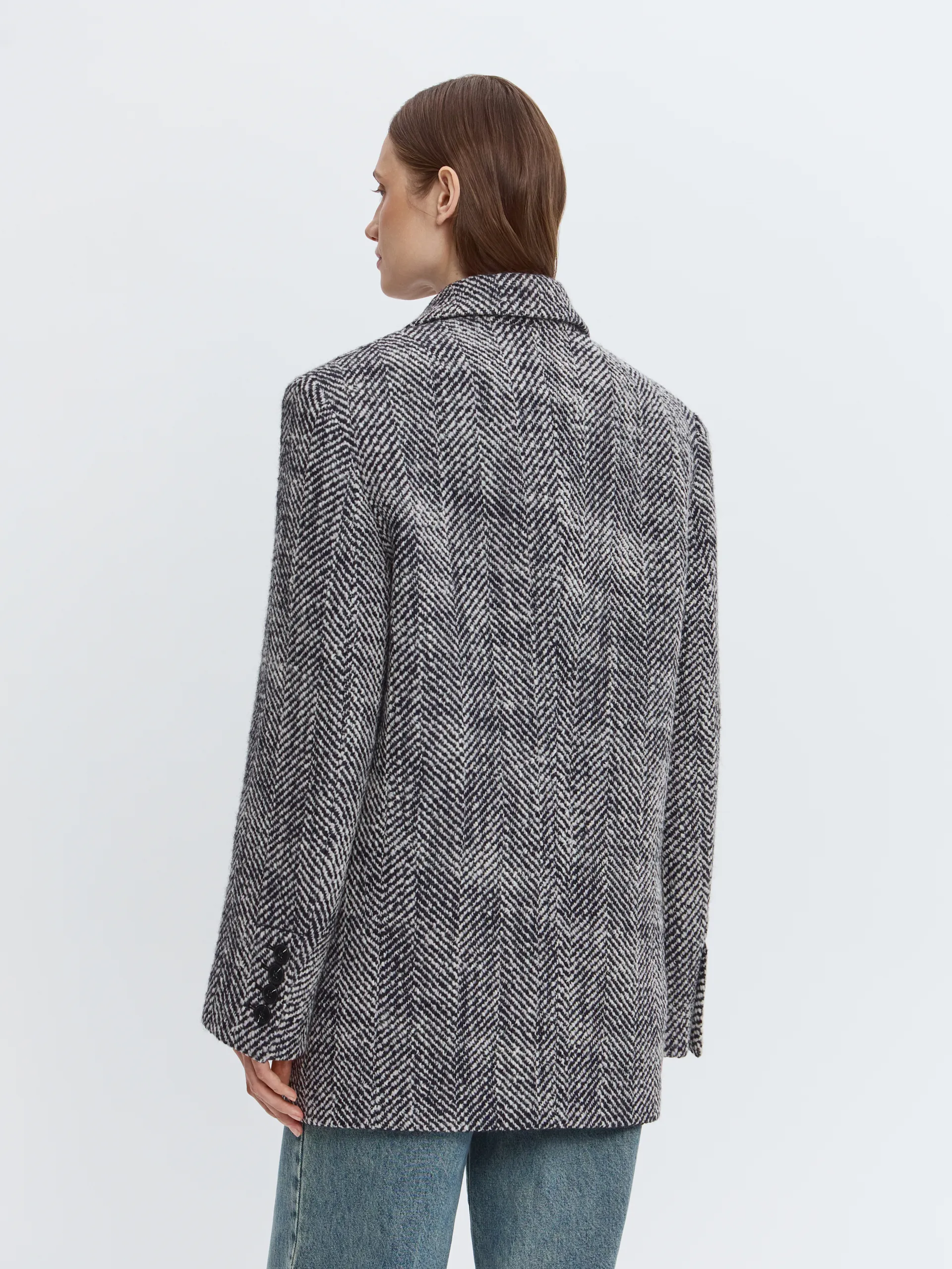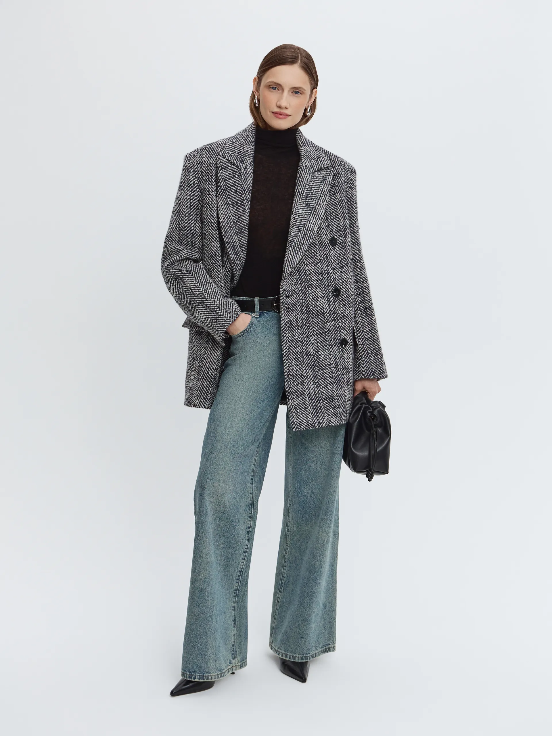 Черно-белая модель с рисунком «ёлочка» и высоким содержанием шерсти. Двубортный крой придаёт силуэту собранность и структуру, делая образ выверенным и универсальным для холодного сезона. Пальто-жакет легко вписывается в повседневный и более строгий гардероб, сохраняя баланс между классикой и современным настроением.