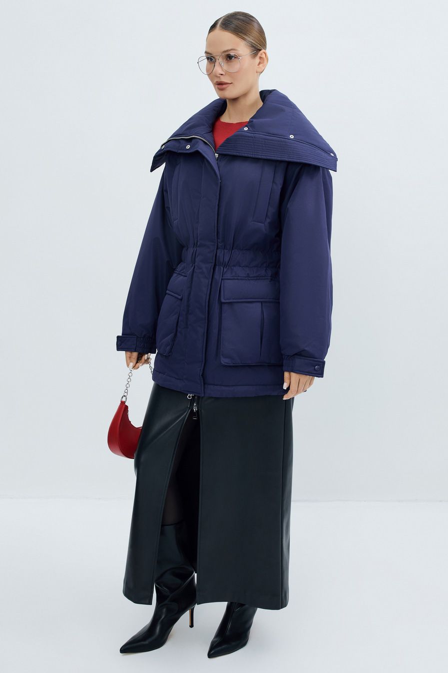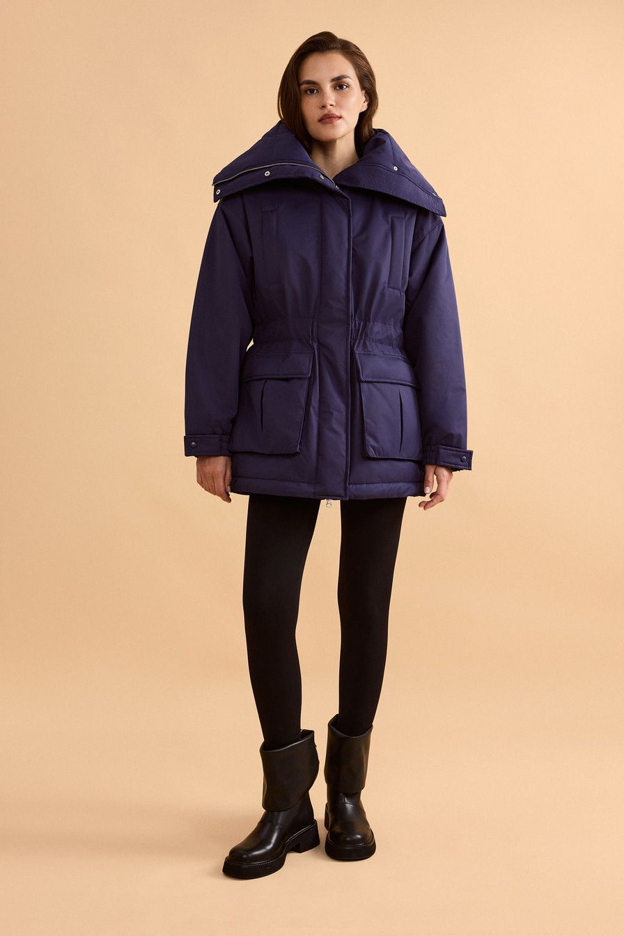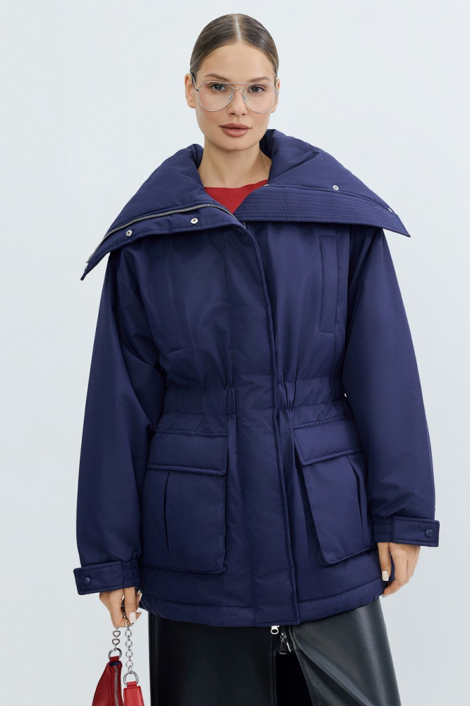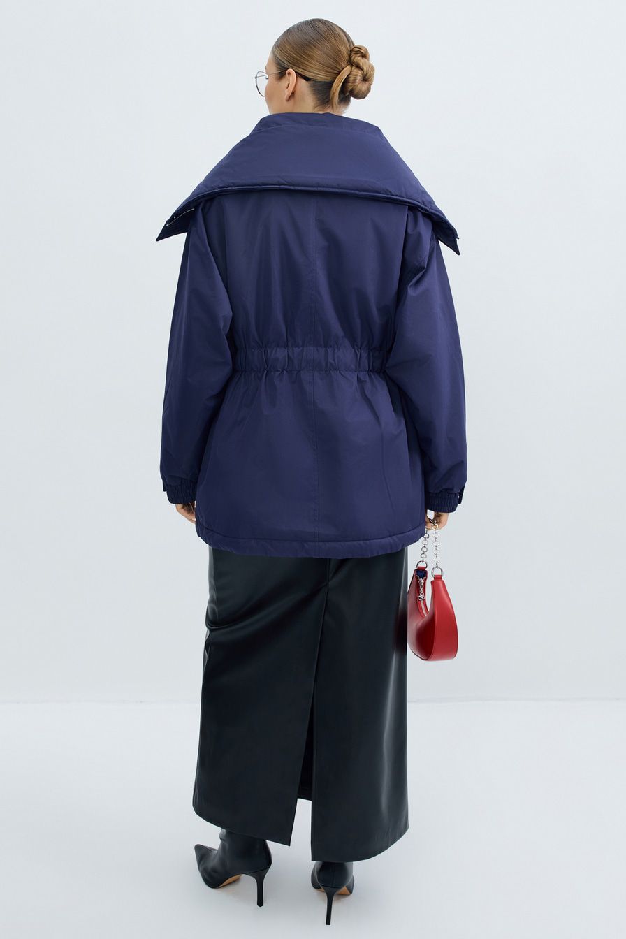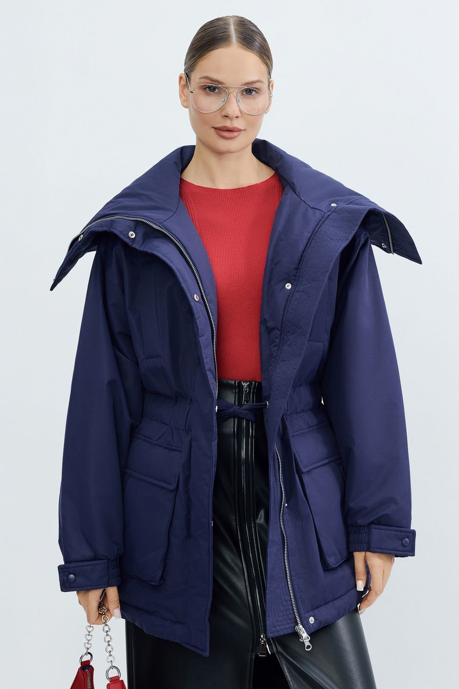 Укороченная куртка-парка с наполнителем из синтепона – модель темно-синего цвета с капюшоном, накладными карманами и резинкой на талии. Парка сделана из мембранной ткани со специальной пропиткой – она защищает от ветра и влаги, и сохраняет тепло.