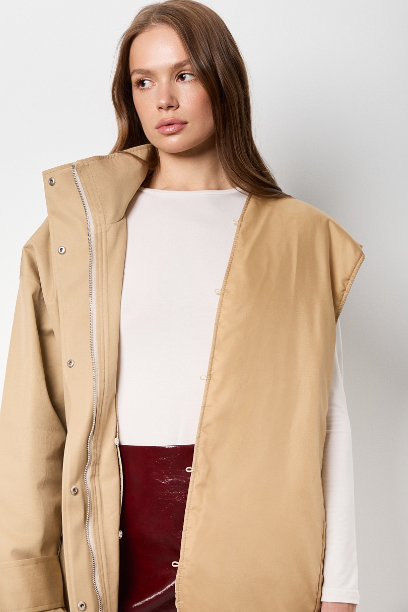 Ветровка из хлопка с пропиткой со съёмным утеплителем — практичная и универсальная модель на каждый день. Изготовлена из прочного хлопка с водо- и ветроотталкивающей пропиткой, которая надежно защищает от непогоды. Съёмный утеплитель делает ветровку комфортной как в прохладную, так и в более тёплую погоду.