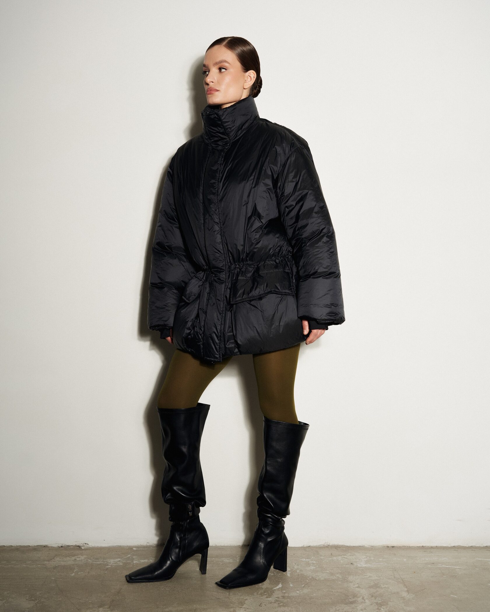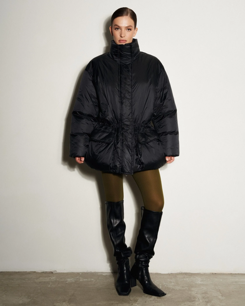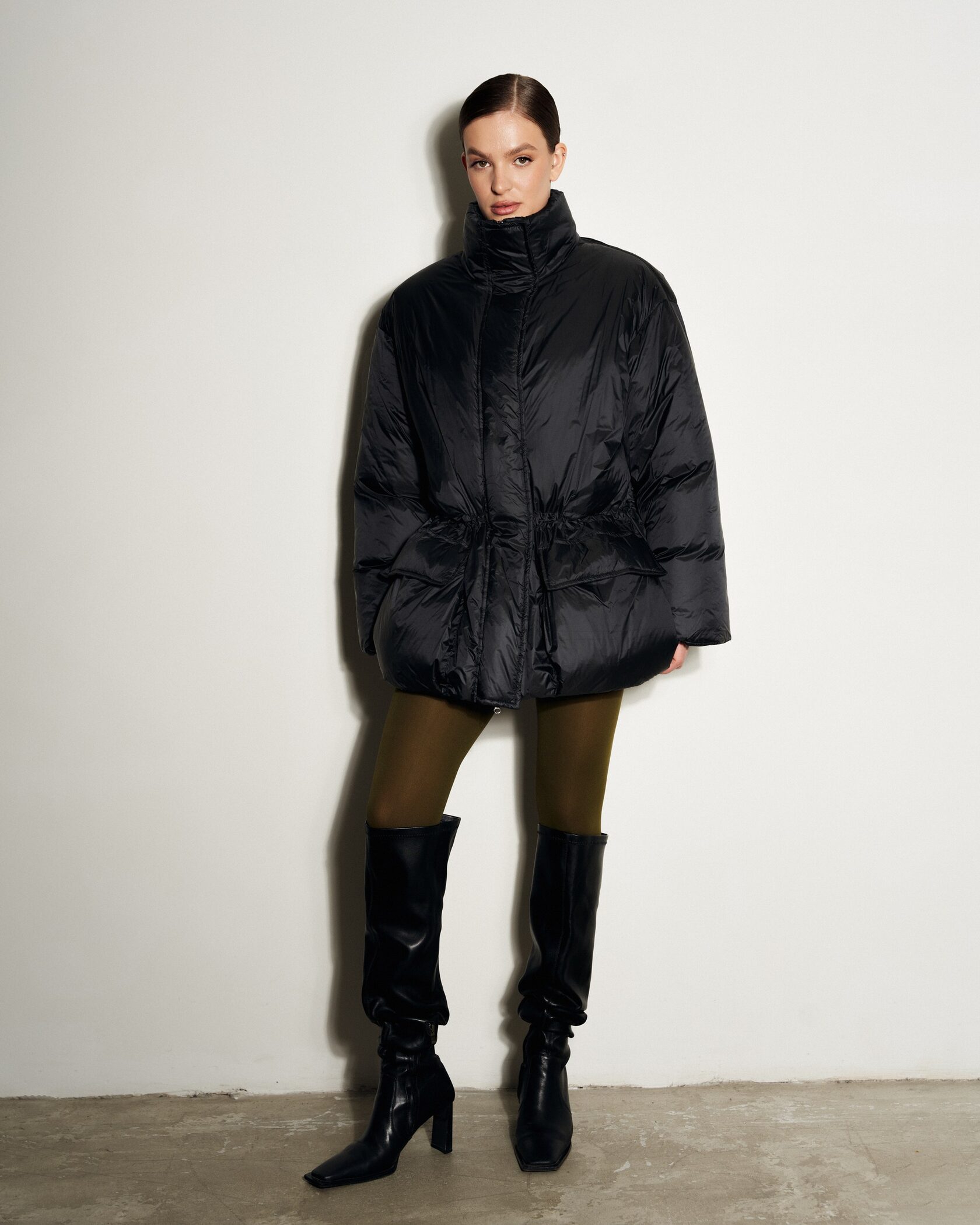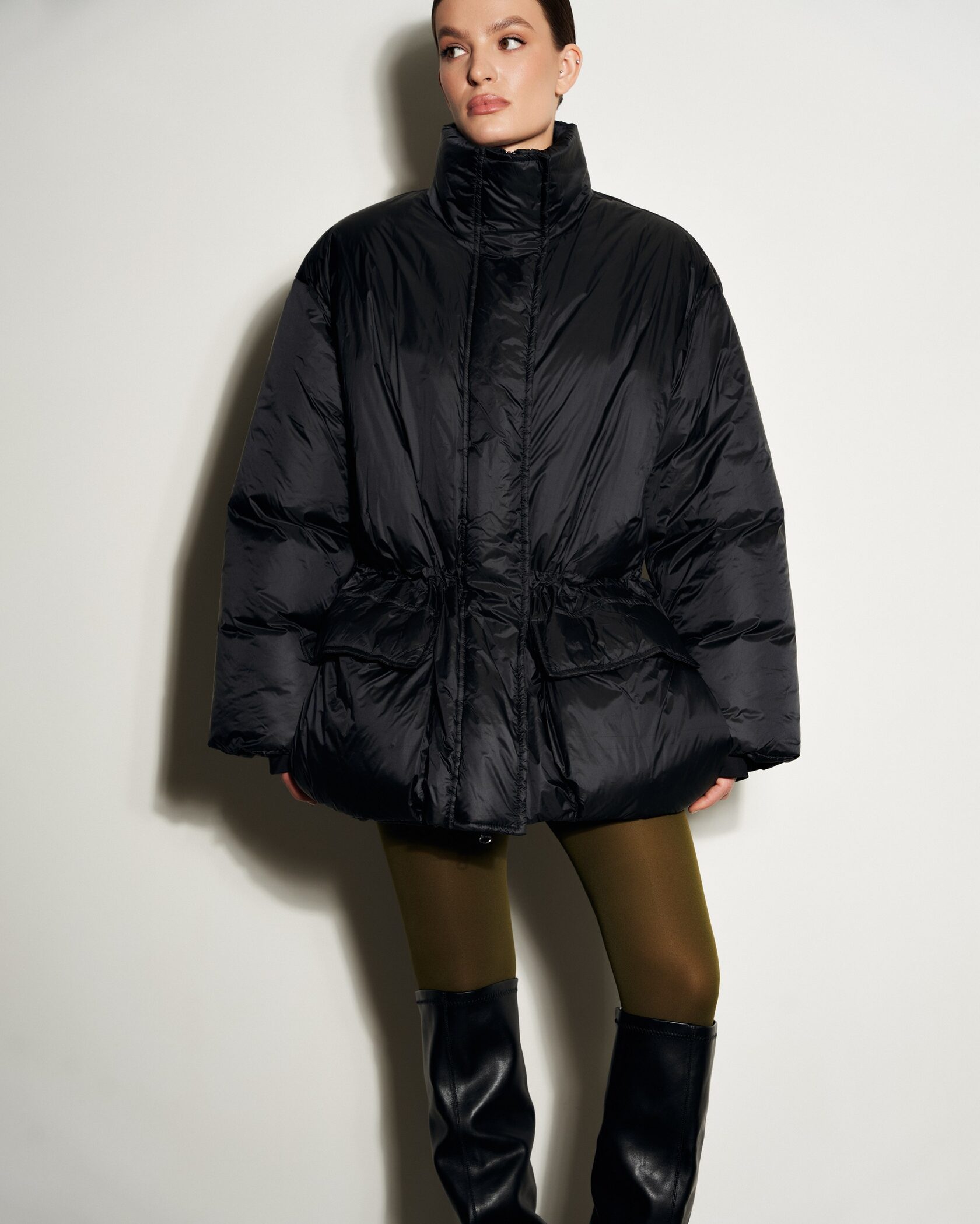 Высокий воротник-стойка обеспечивает дополнительную защиту от ветра и холода, а кулиска на талии позволяет регулировать посадку, создавая более приталенный или свободный силуэт. Вместительные накладные карманы добавляют функциональности и удобства.