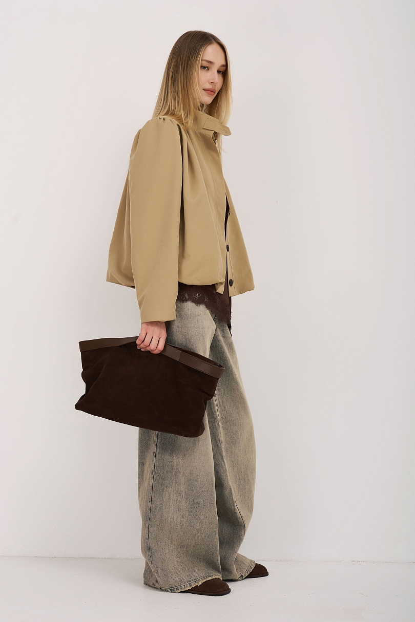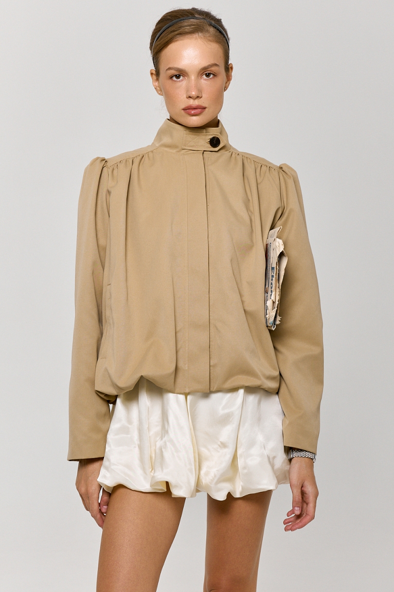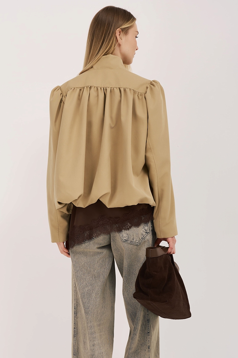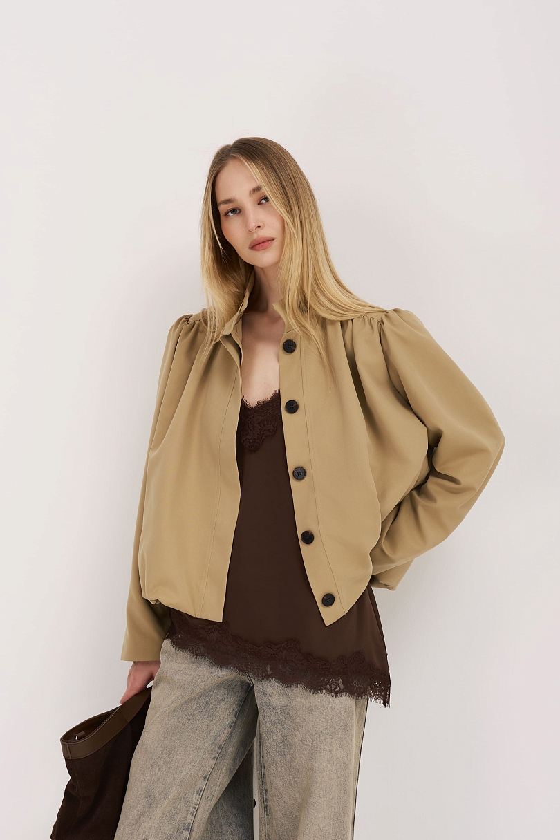 Тренч укороченный с декоративными сборками — стильная интерпретация классической верхней одежды. Модель выполнена в универсальном бежевом оттенке, что делает её лёгкой в сочетании с различными элементами гардероба.