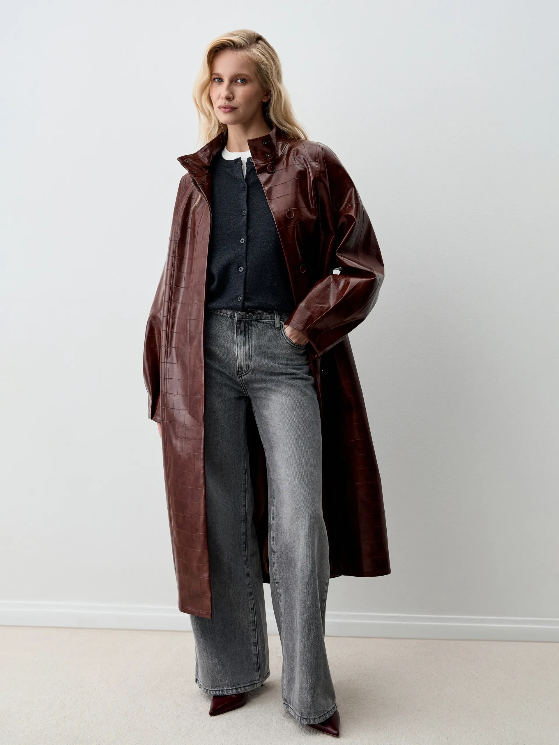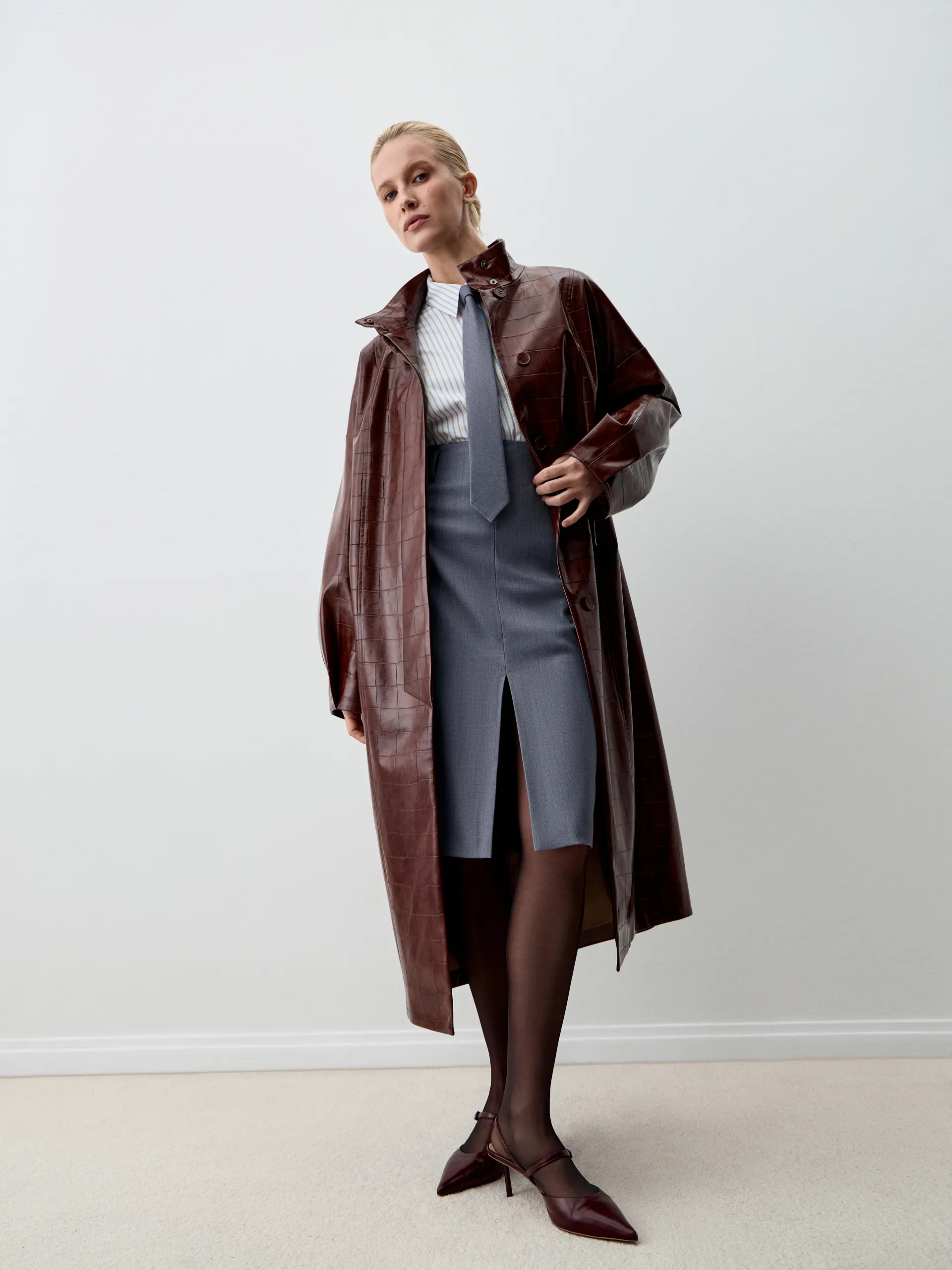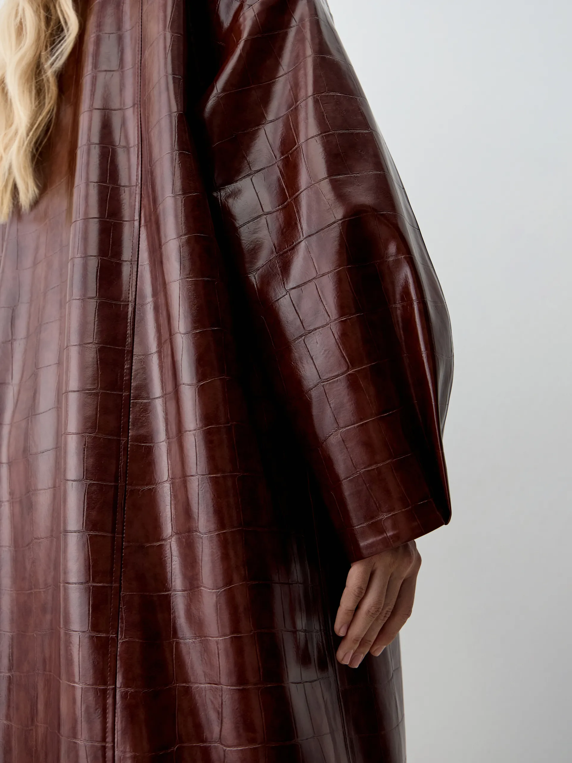 Плащ Dana. Изготовлен из премиальной экокожи в глубоком коньячном оттенке с анималистичным принтом под крокодила. О-силуэт придаёт модели современный и утончённый вид, а акцентные защипы на рукавах добавляют оригинальности и подчёркивают стиль. Материал долговечен, прост в уходе и создаёт эффект натуральной кожи. Такой плащ универсален для разных случаев: его можно носить с узкими брюками и ботильонами для элегантного образа, с джинсами и свитером для повседневного выхода или с платьем и высокими сапогами для женственного наряда.