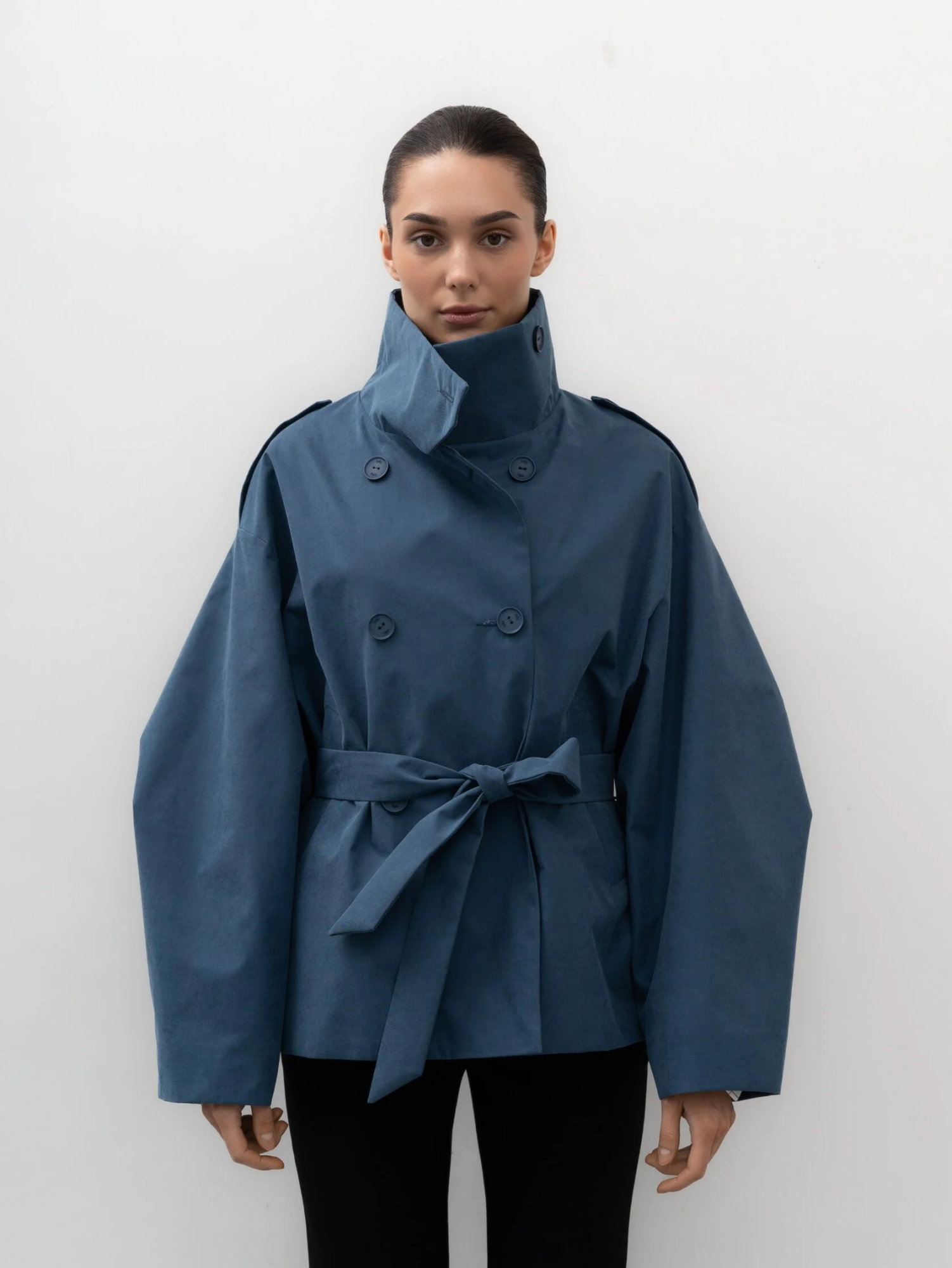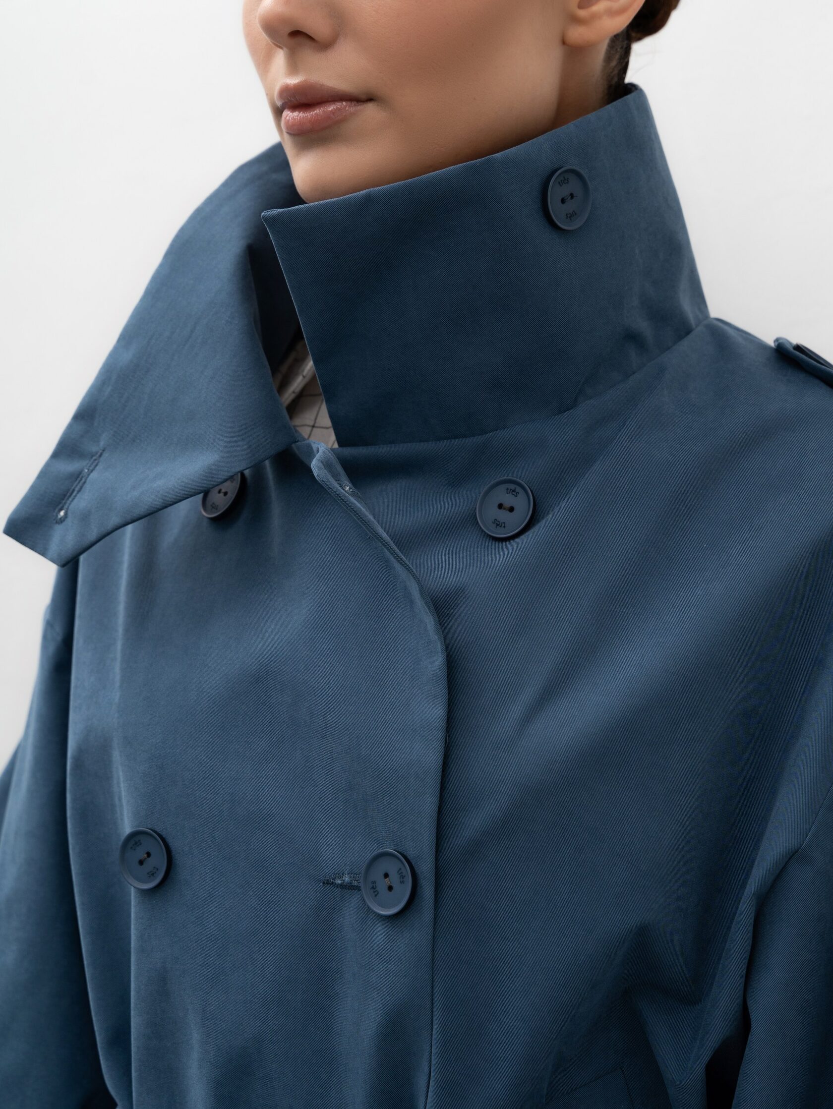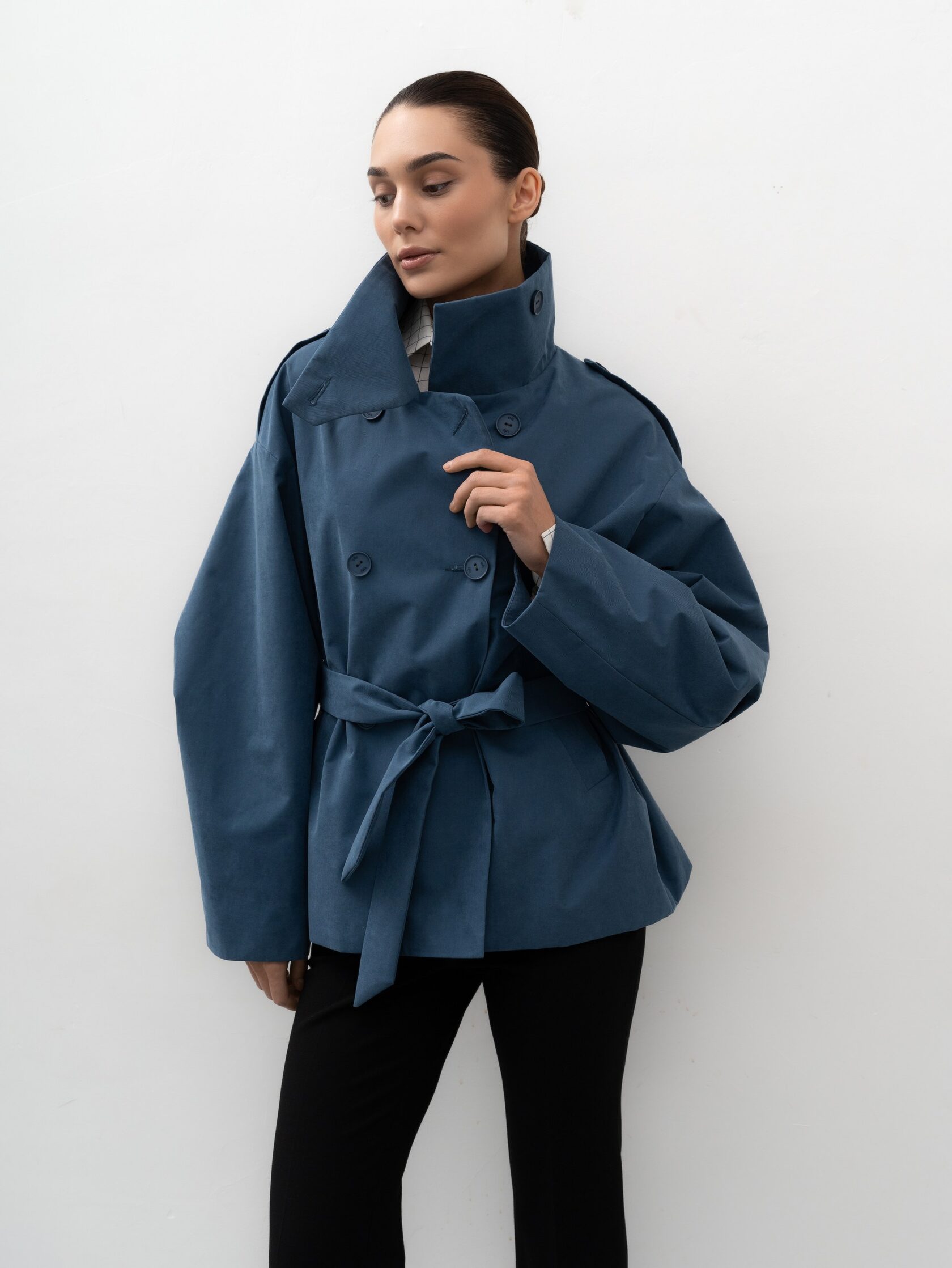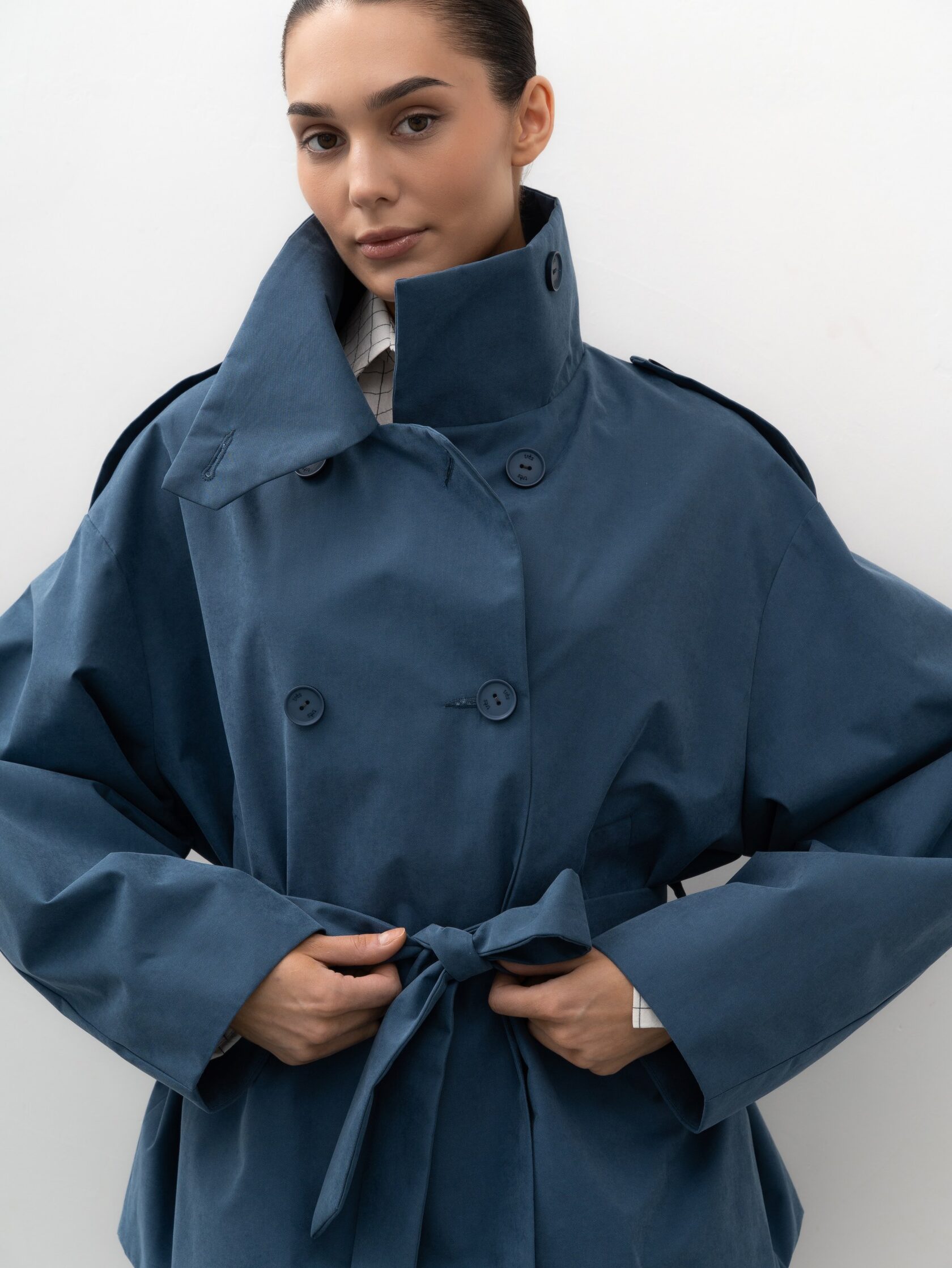 Тренч в синем оттенке — новая интерпретация нашего бестселлера в укороченной длине. Лаконичный крой, высокая стойка и широкий пояс формируют выразительный силуэт и придают образу графичность.