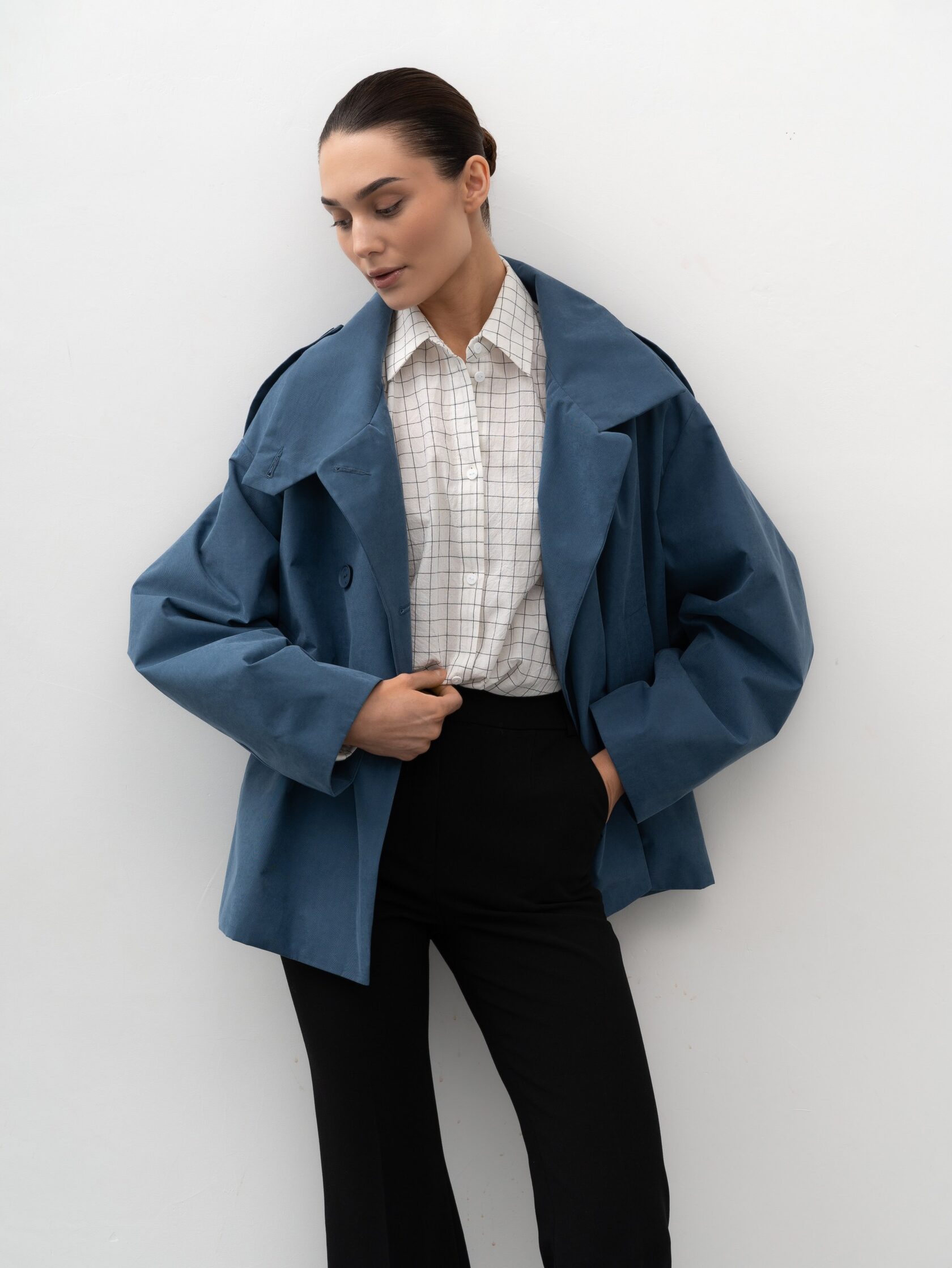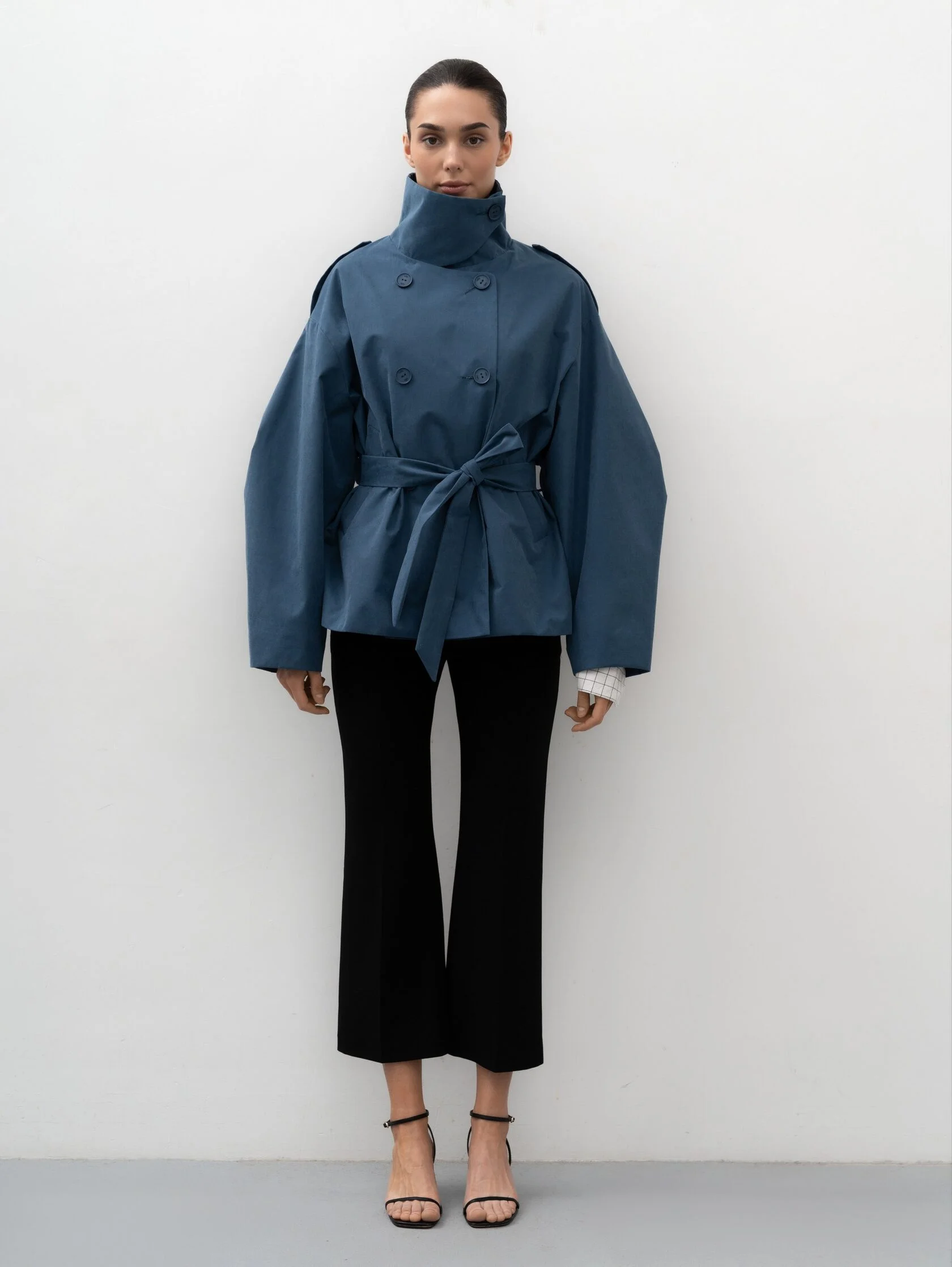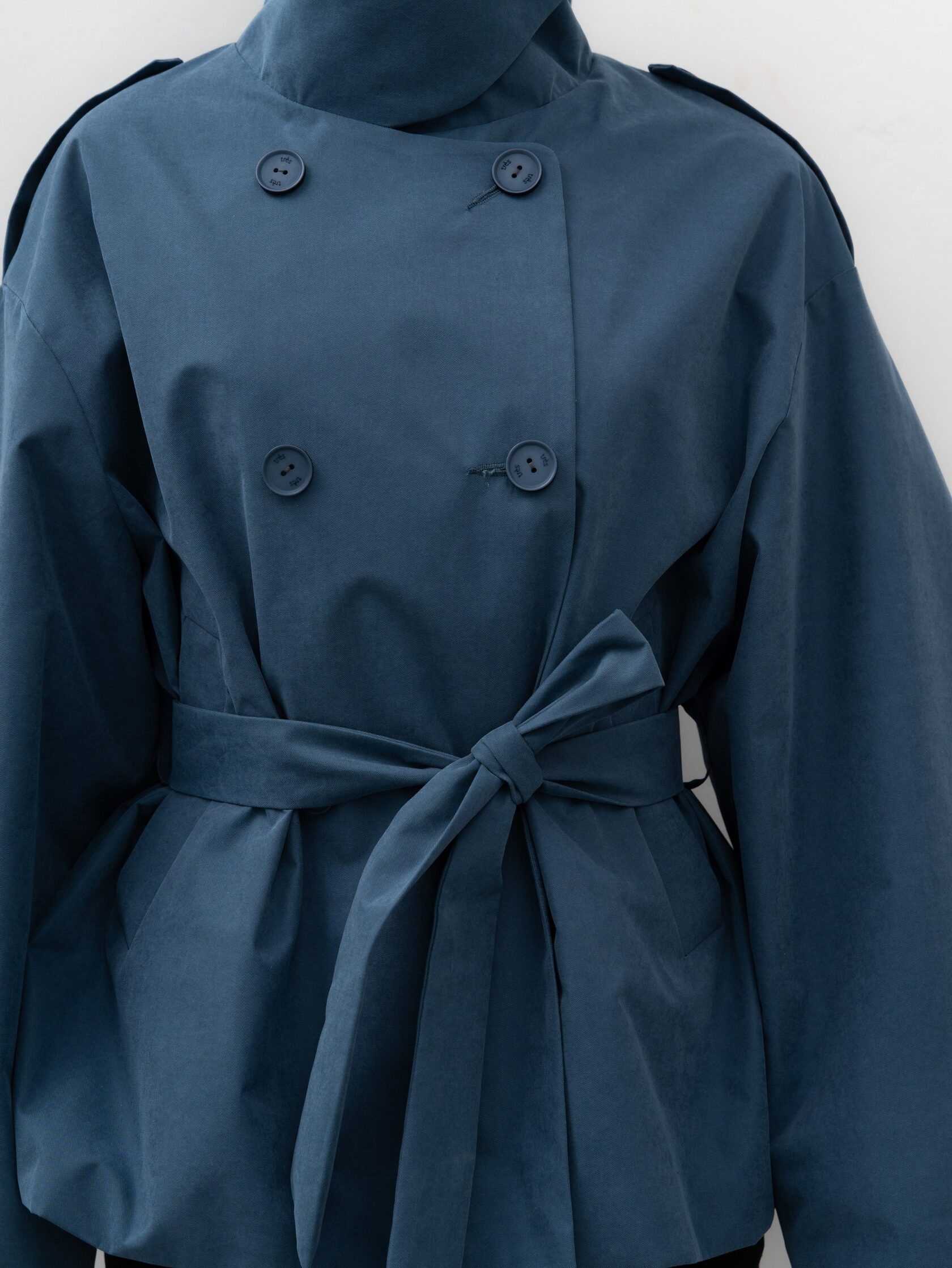 Тренч в синем оттенке — новая интерпретация нашего бестселлера в укороченной длине. Лаконичный крой, высокая стойка и широкий пояс формируют выразительный силуэт и придают образу графичность.