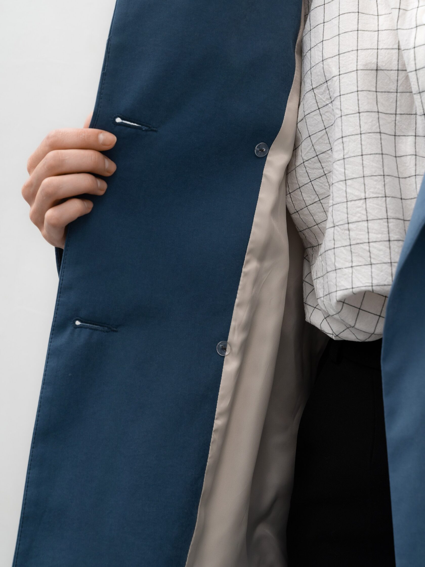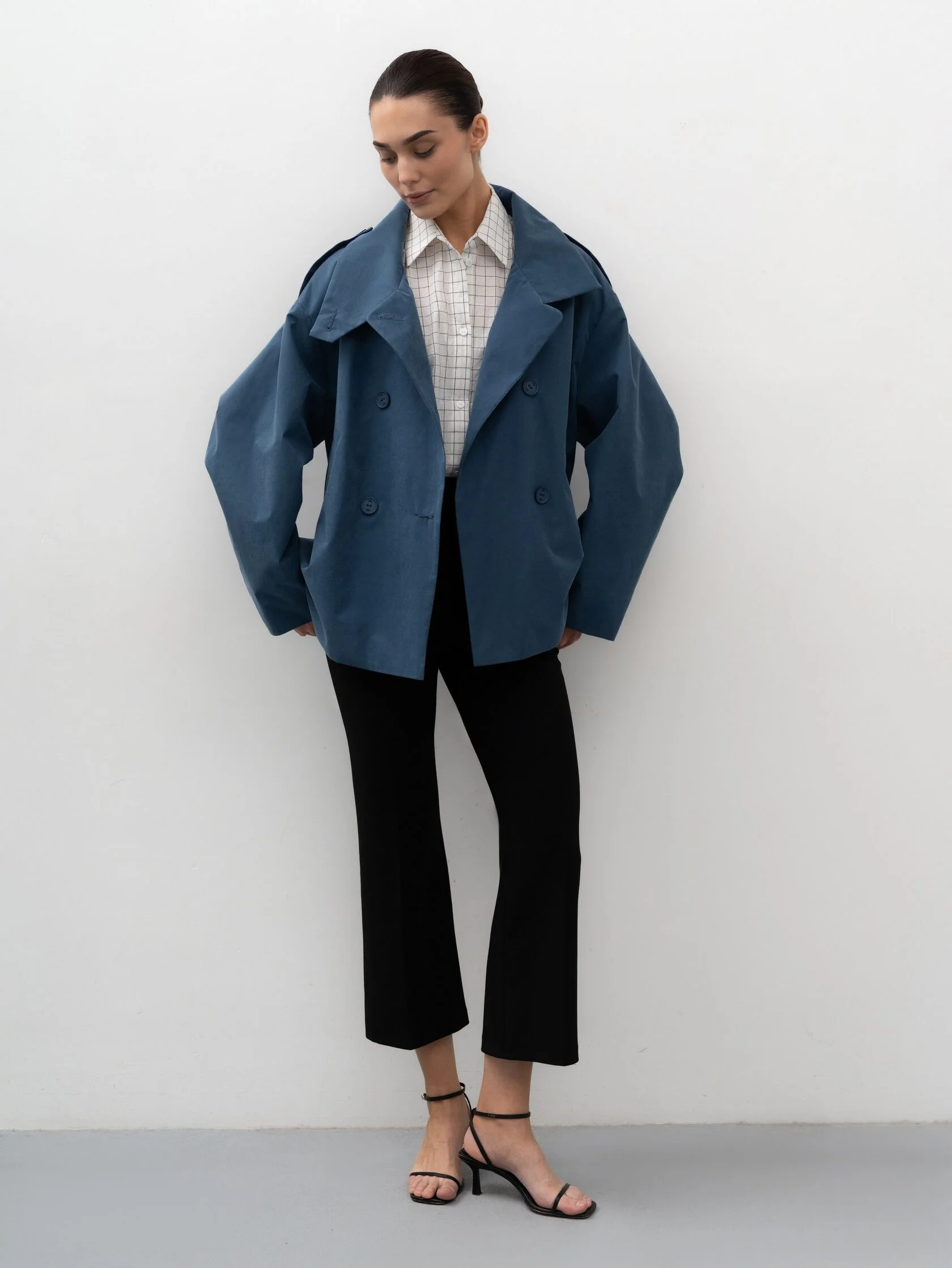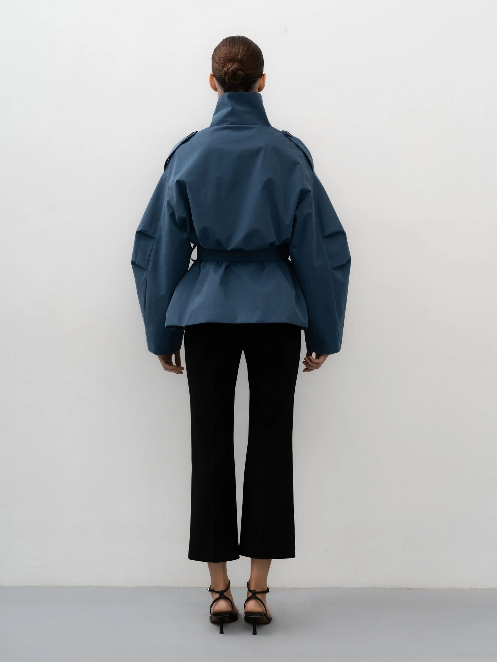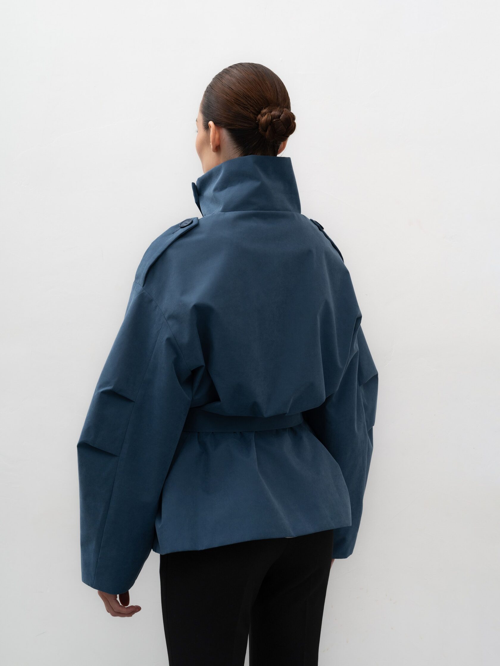 Тренч в синем оттенке — новая интерпретация нашего бестселлера в укороченной длине. Лаконичный крой, высокая стойка и широкий пояс формируют выразительный силуэт и придают образу графичность.