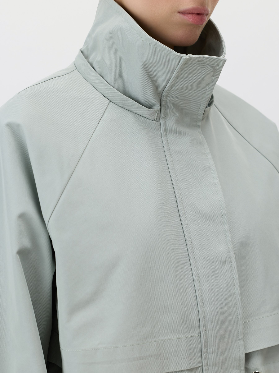 съемным капюшоном и отлетными кокетками, которые добавляют объем и защищают от ветра. Рукава реглан мягко подстраиваются под объем плеч, а кулиса на талии позволяет регулировать облегание. Застежка на молнию и кнопки усилена ветрозащитной планкой. Изделие дополнено вместительными карманами.