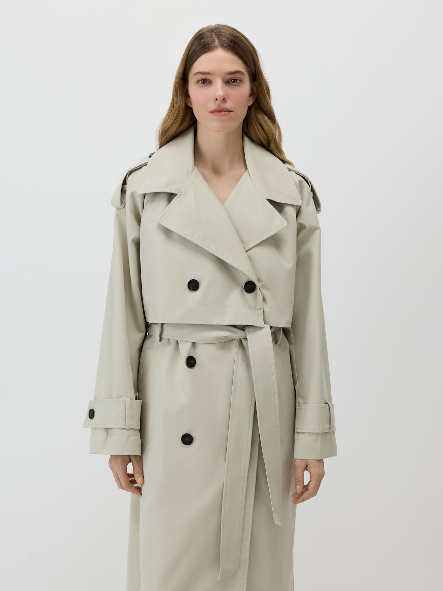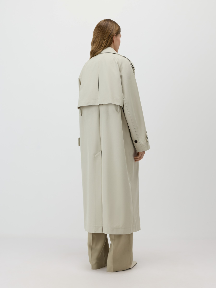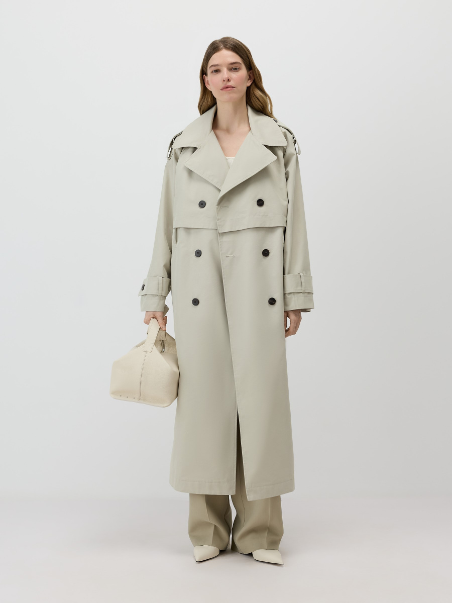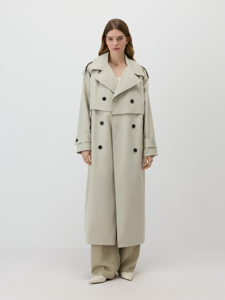 Двубортный оверсайз-тренч макси с английским воротником, который можно поднять и застегнуть на пуговицу. Плотная ткань на основе хлопка и классические детали: летящая кокетка по полочкам и спинке, погоны и паты, глубокая шлица и длинный пояс. Модель выполнена с широкими анатомическими рукавами и вместительными боковыми карманами.
