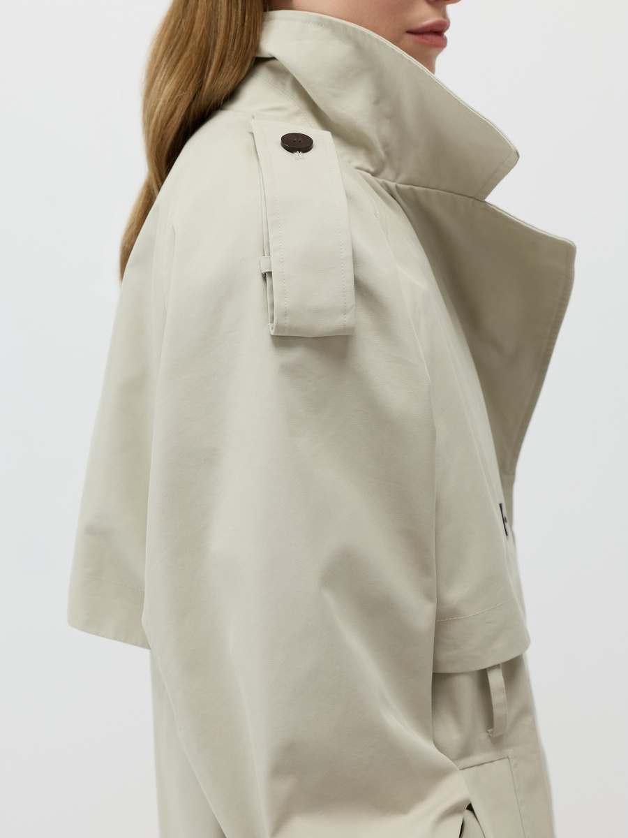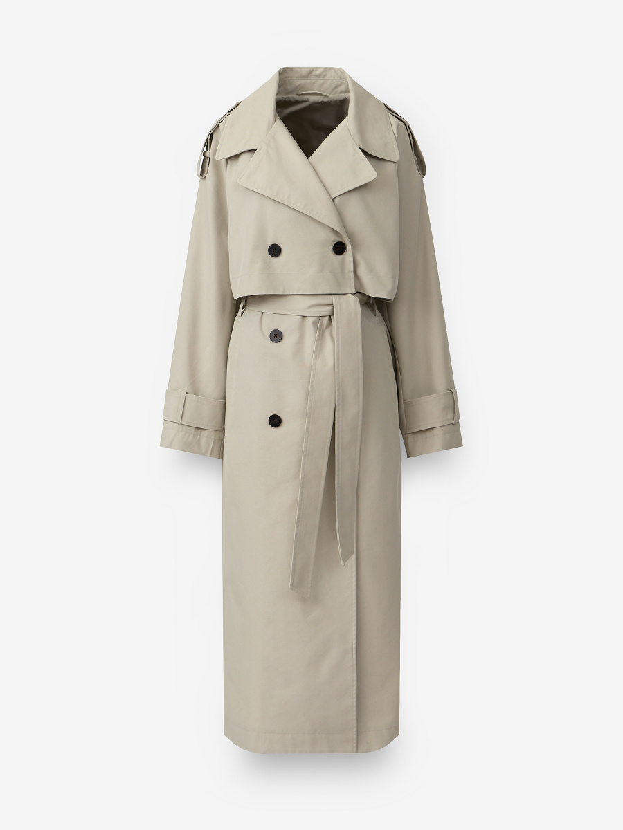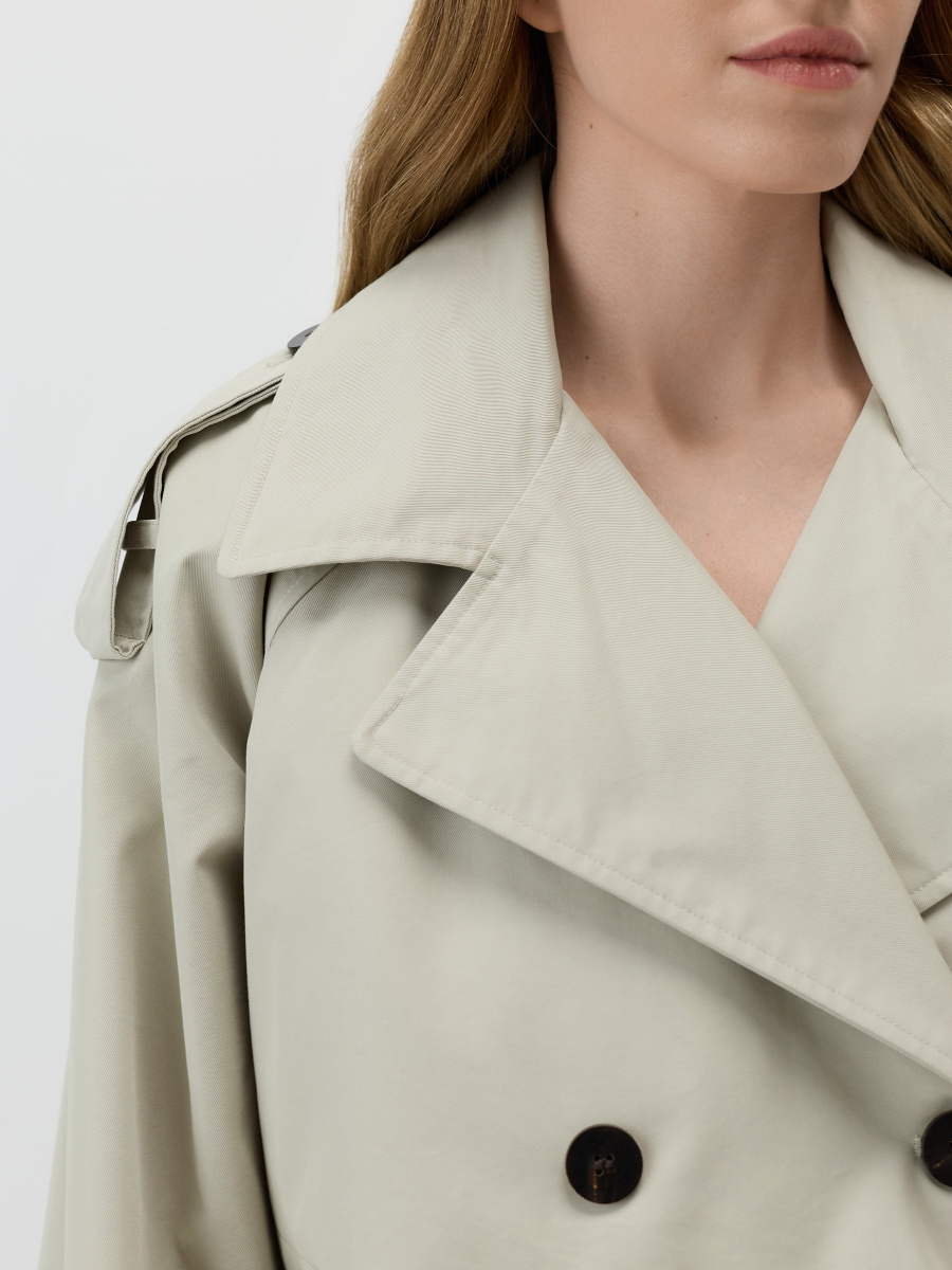 Двубортный оверсайз-тренч макси с английским воротником, который можно поднять и застегнуть на пуговицу. Плотная ткань на основе хлопка и классические детали: летящая кокетка по полочкам и спинке, погоны и паты, глубокая шлица и длинный пояс. Модель выполнена с широкими анатомическими рукавами и вместительными боковыми карманами.
