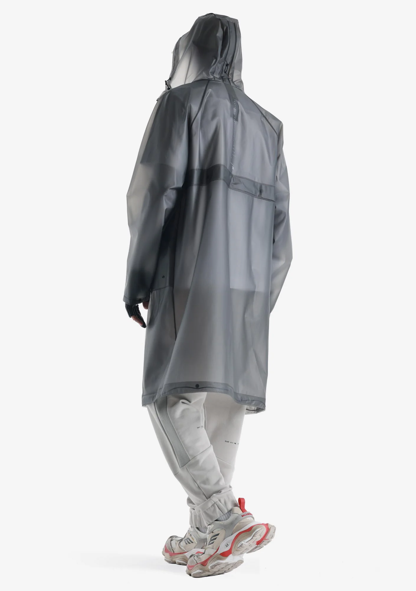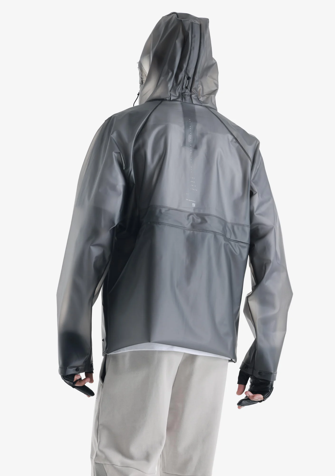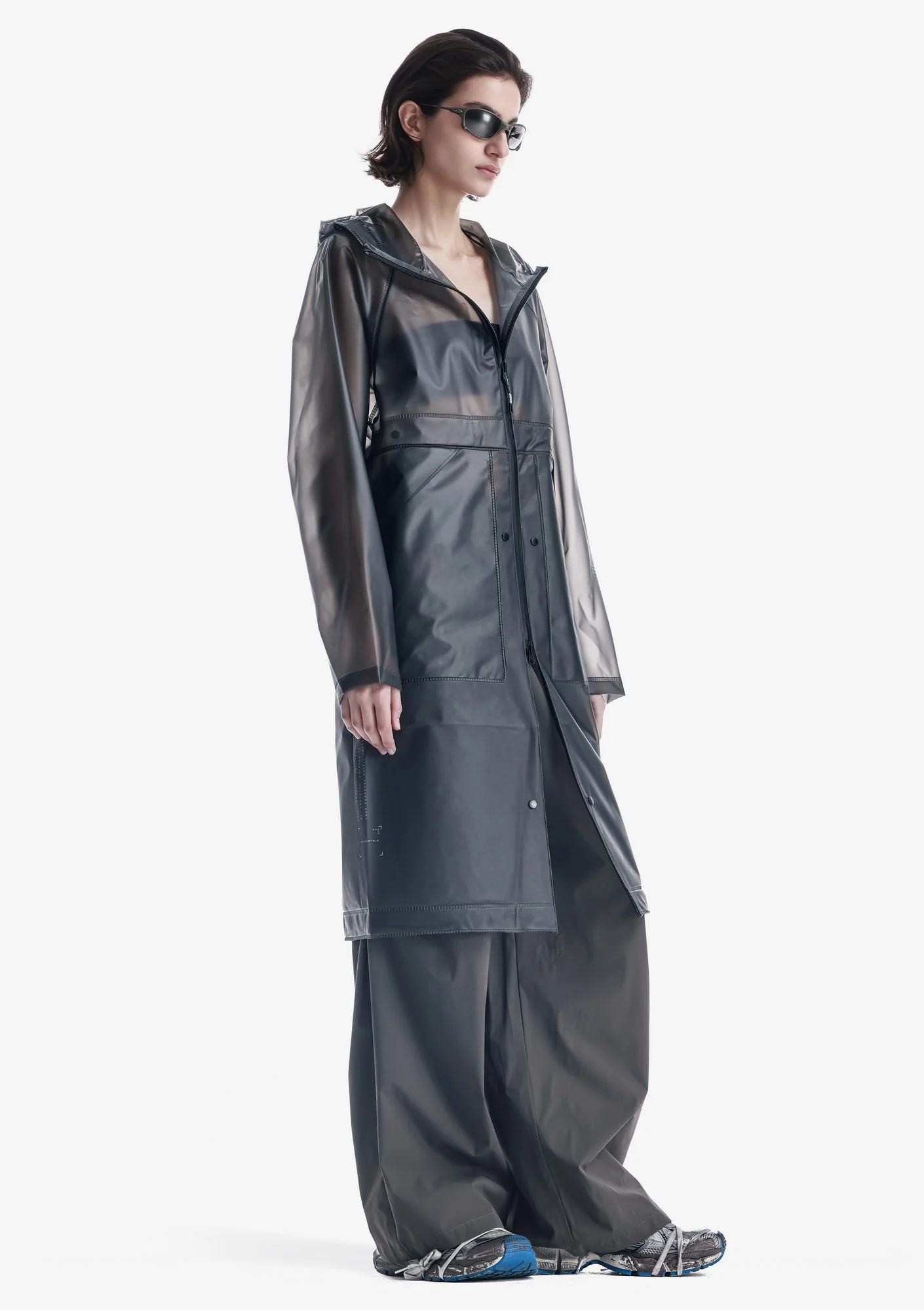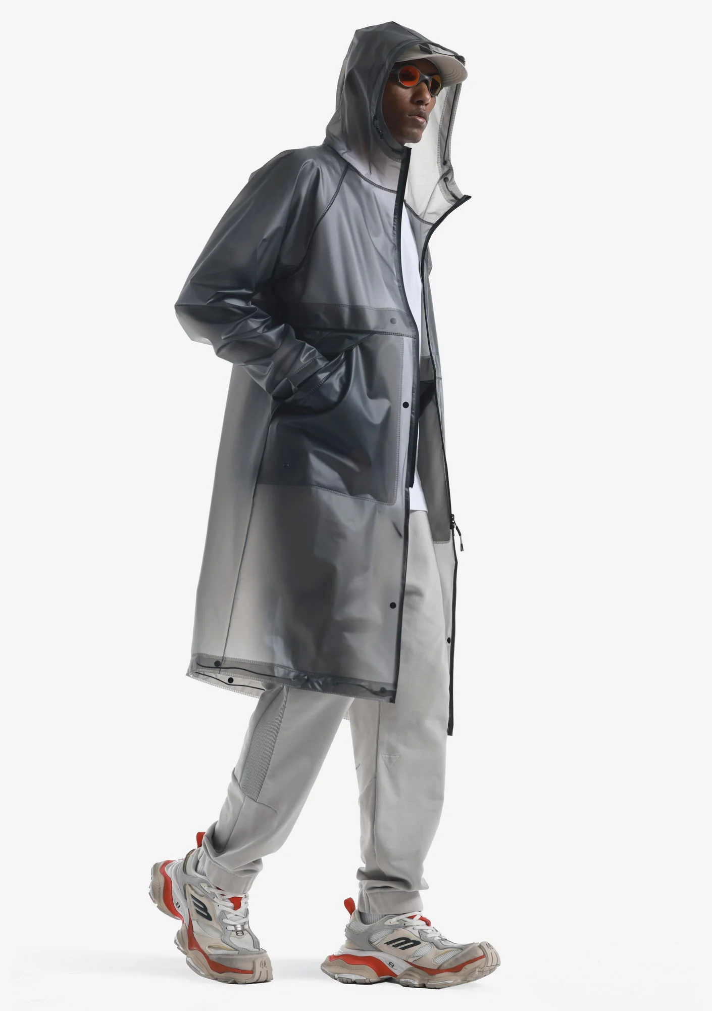 Дождевик-трансформер из полупрозрачного плотного водонепроницаемого полиуретана с герметизированными швами. Оснащён водозащитными карманами и регулируемой длиной, позволяющей носить этот дождевик в качестве длинного плаща и короткой куртки.