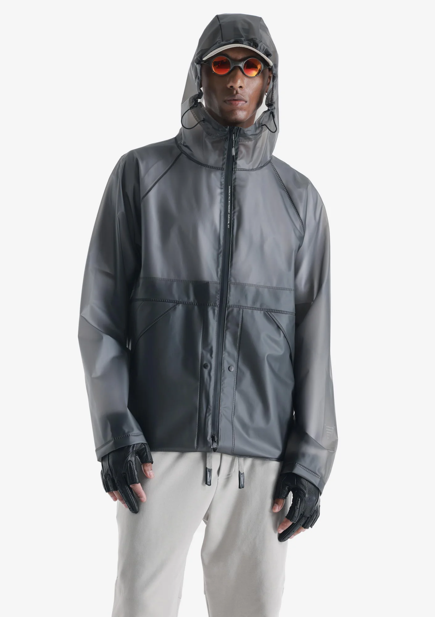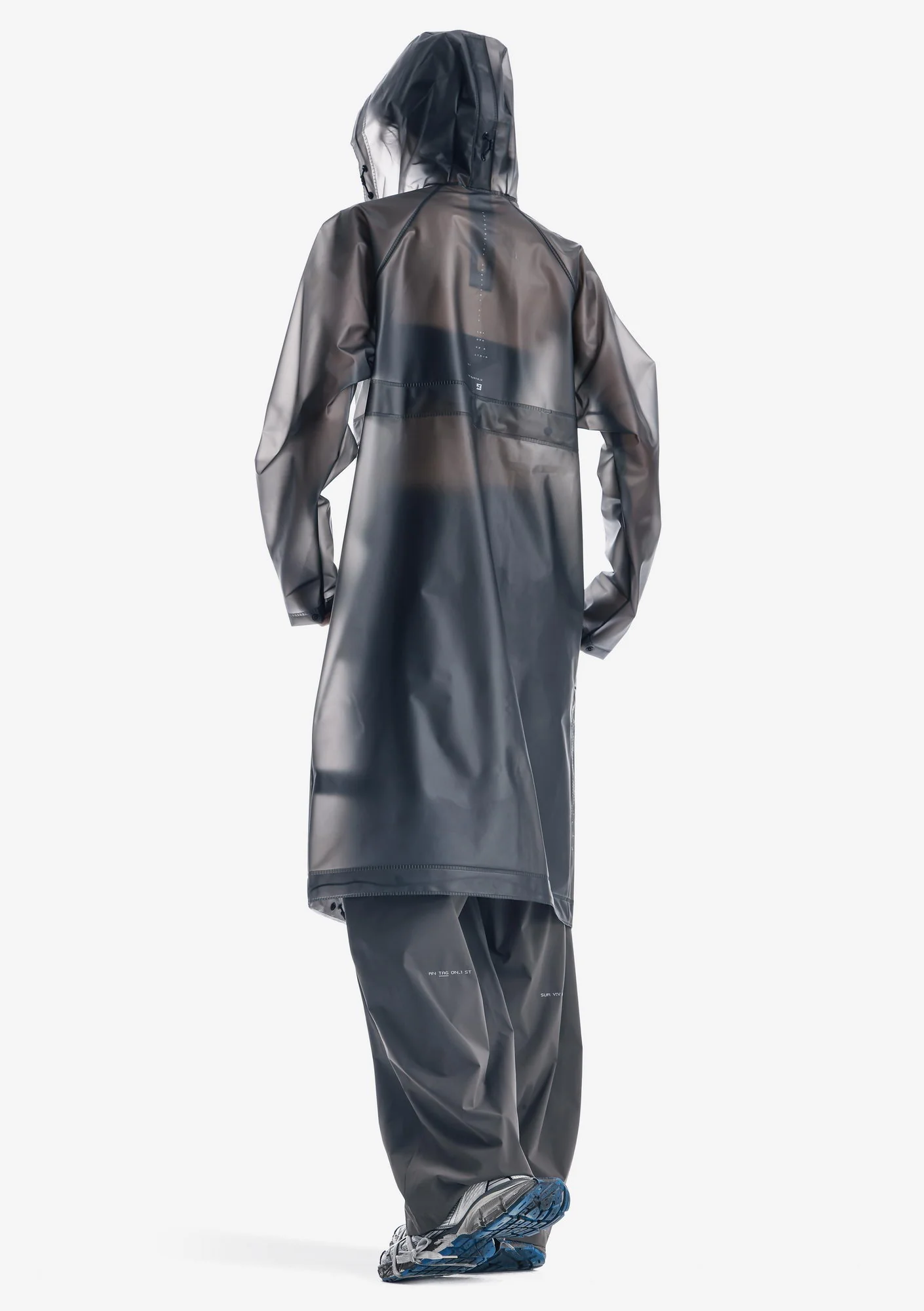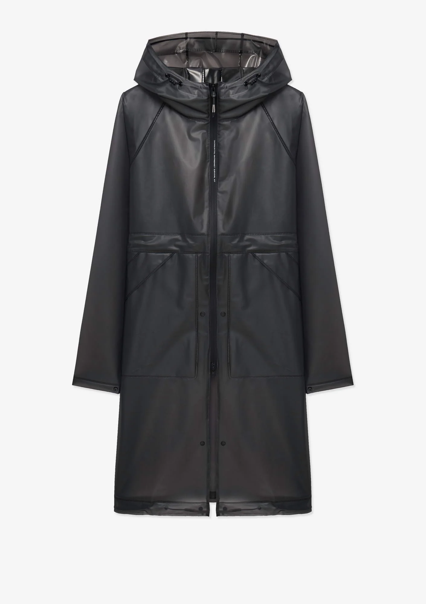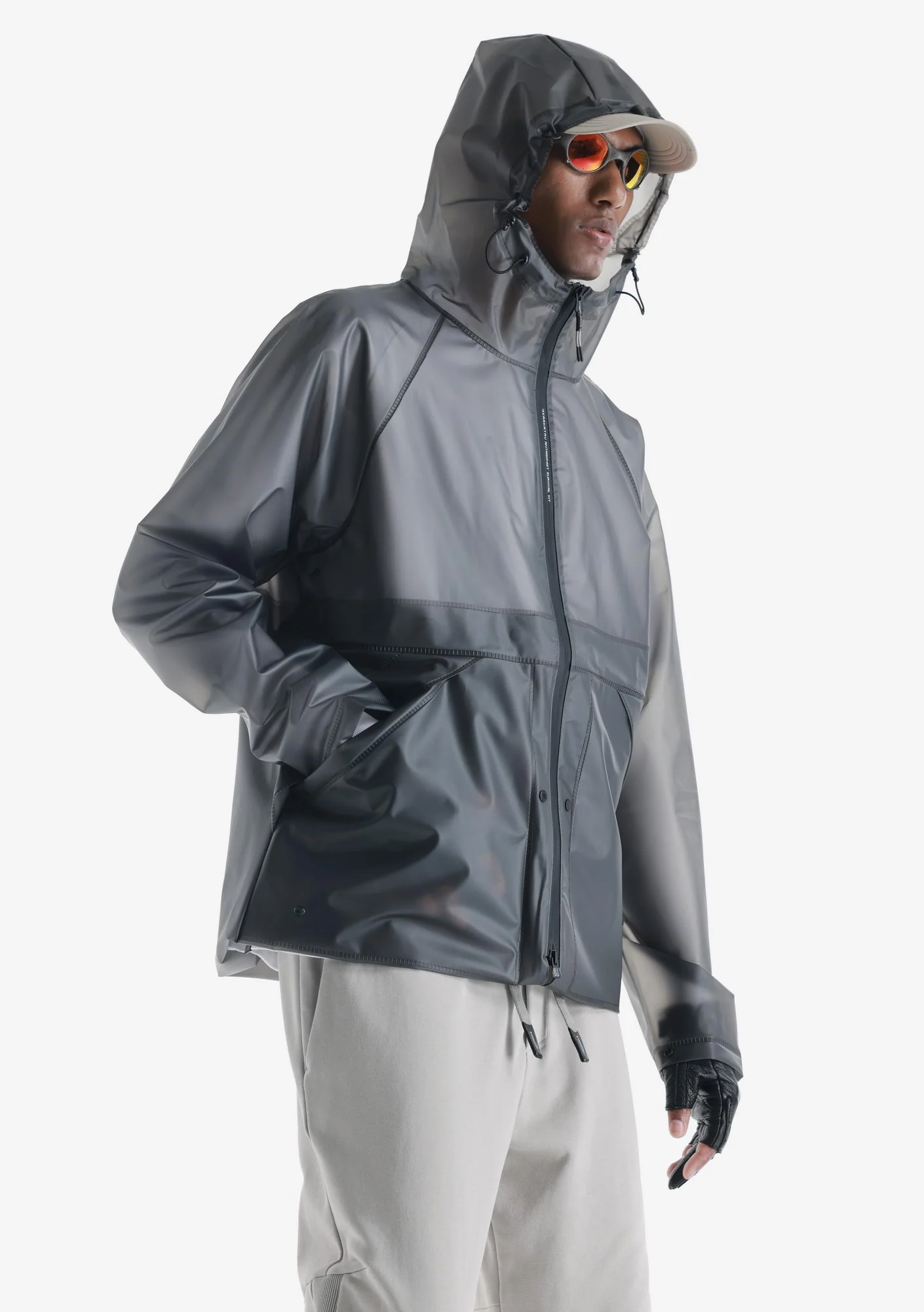 Дождевик-трансформер из полупрозрачного плотного водонепроницаемого полиуретана с герметизированными швами. Оснащён водозащитными карманами и регулируемой длиной, позволяющей носить этот дождевик в качестве длинного плаща и короткой куртки.