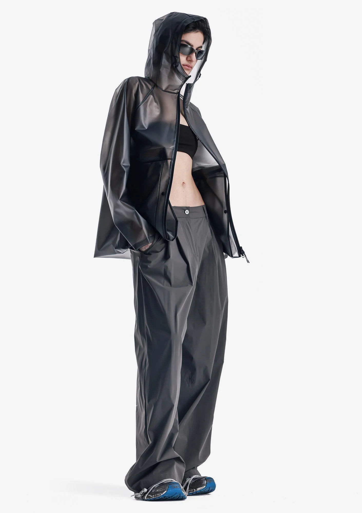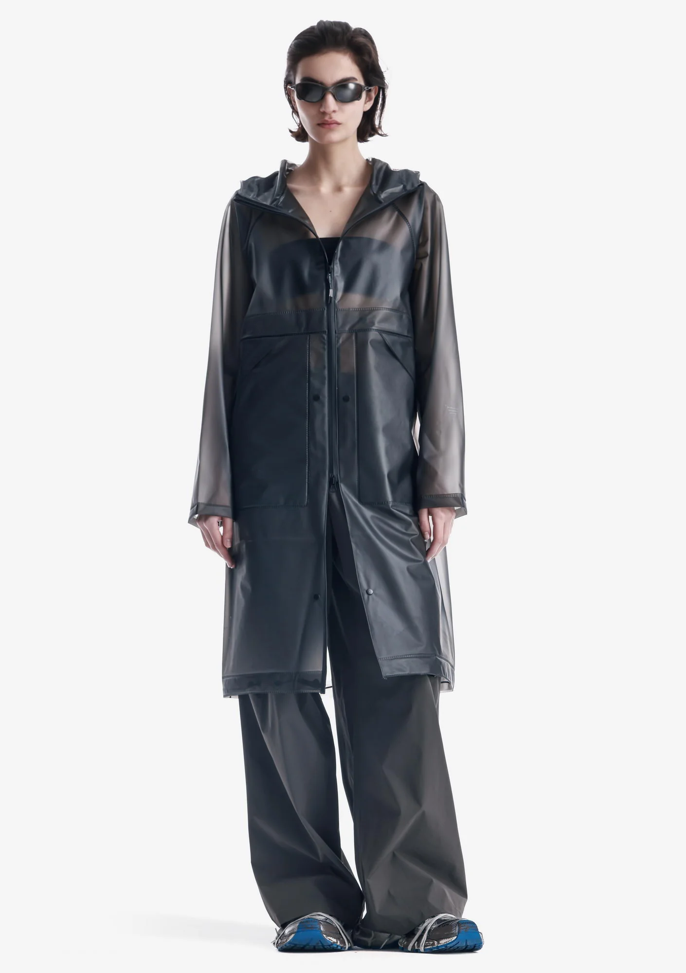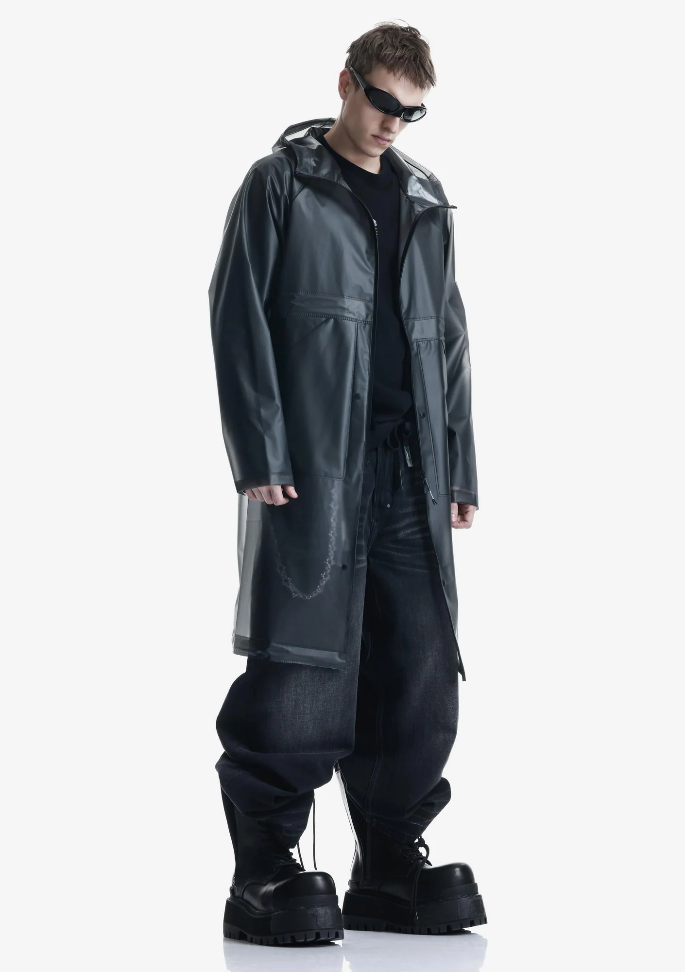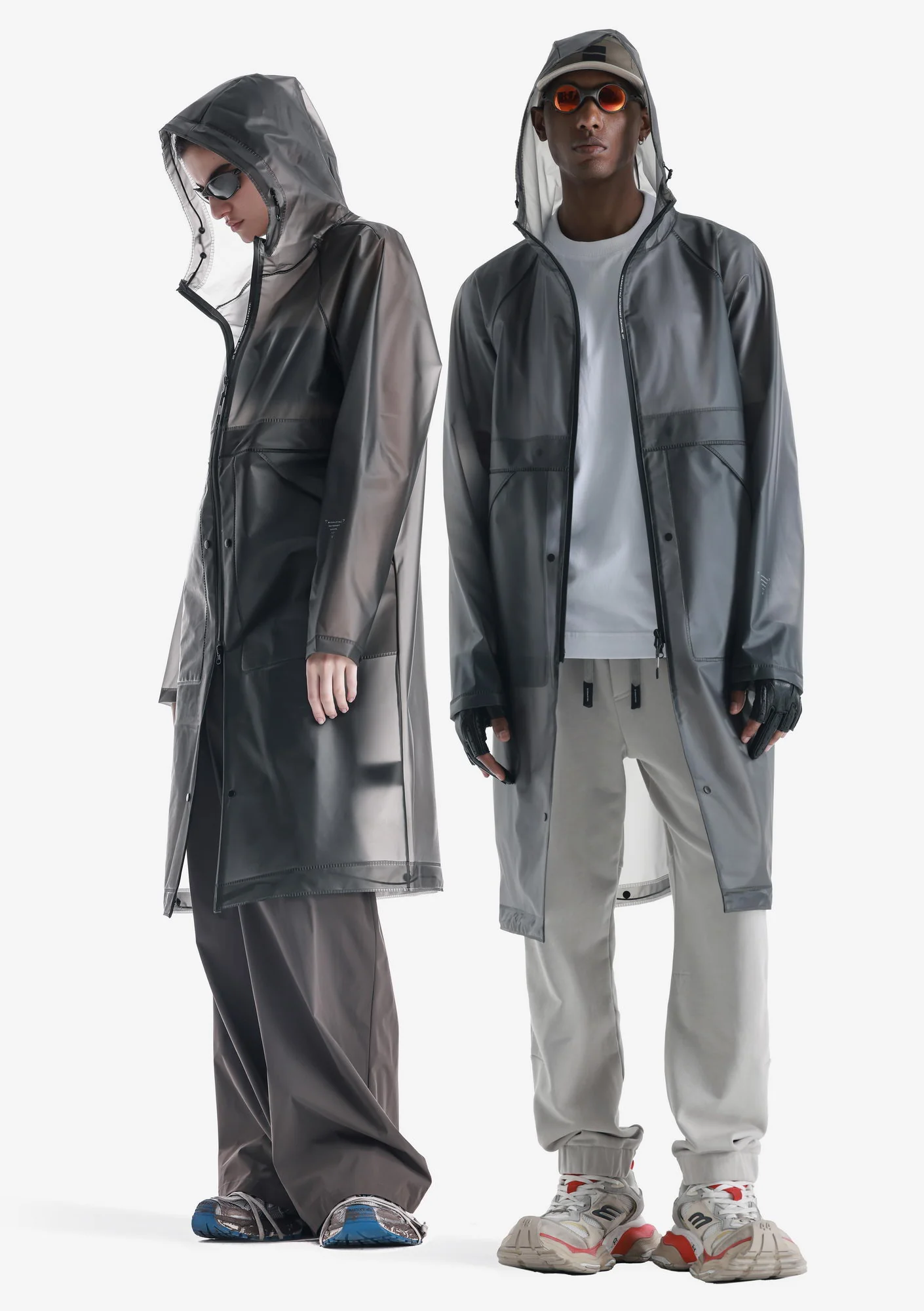 Дождевик-трансформер из полупрозрачного плотного водонепроницаемого полиуретана с герметизированными швами. Оснащён водозащитными карманами и регулируемой длиной, позволяющей носить этот дождевик в качестве длинного плаща и короткой куртки.