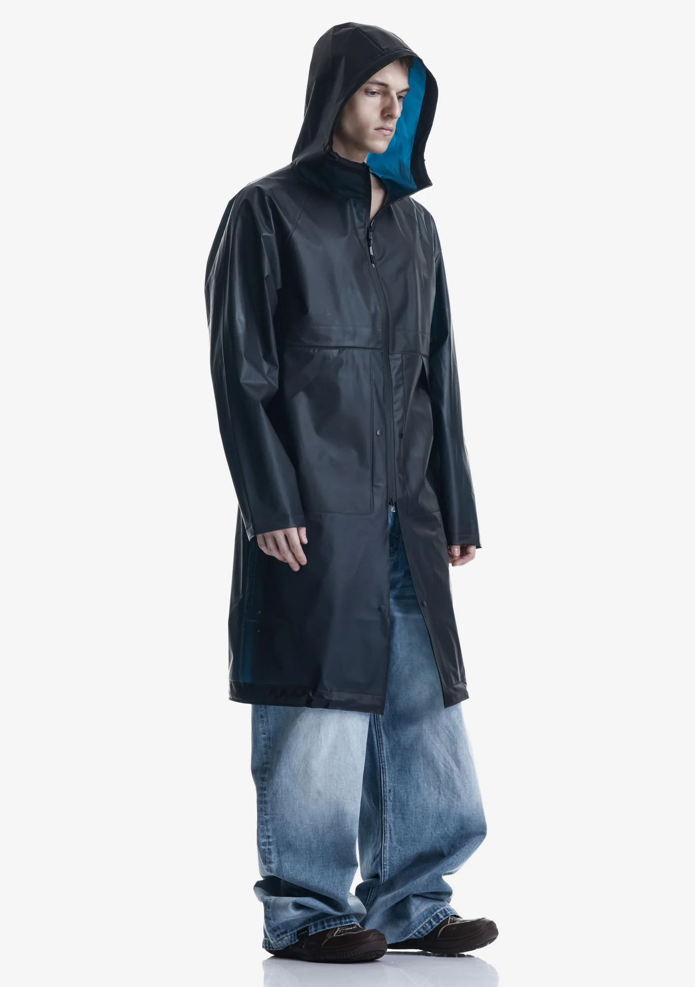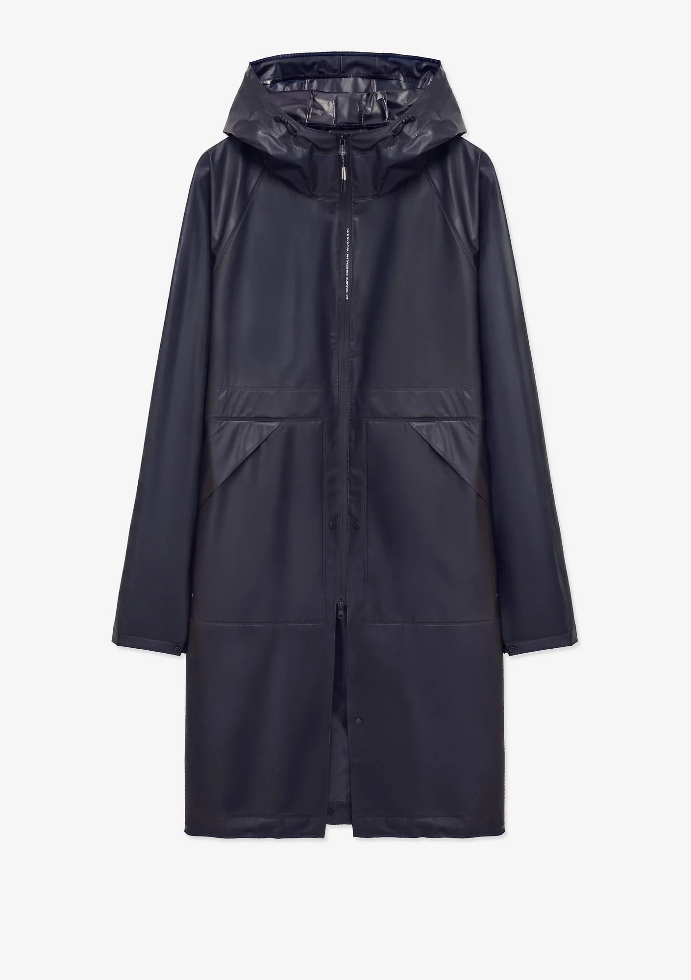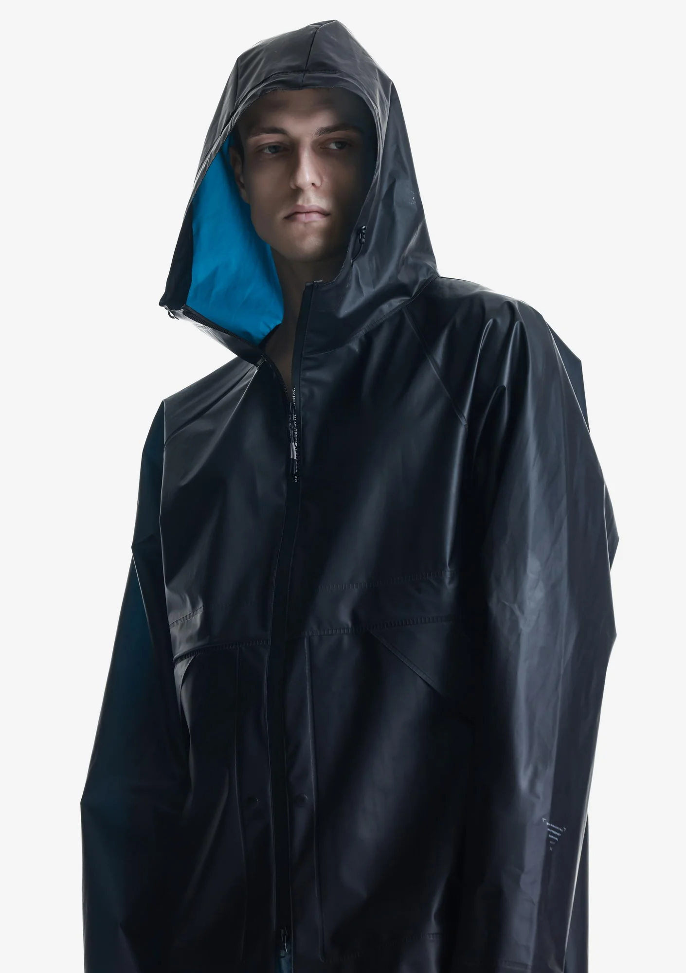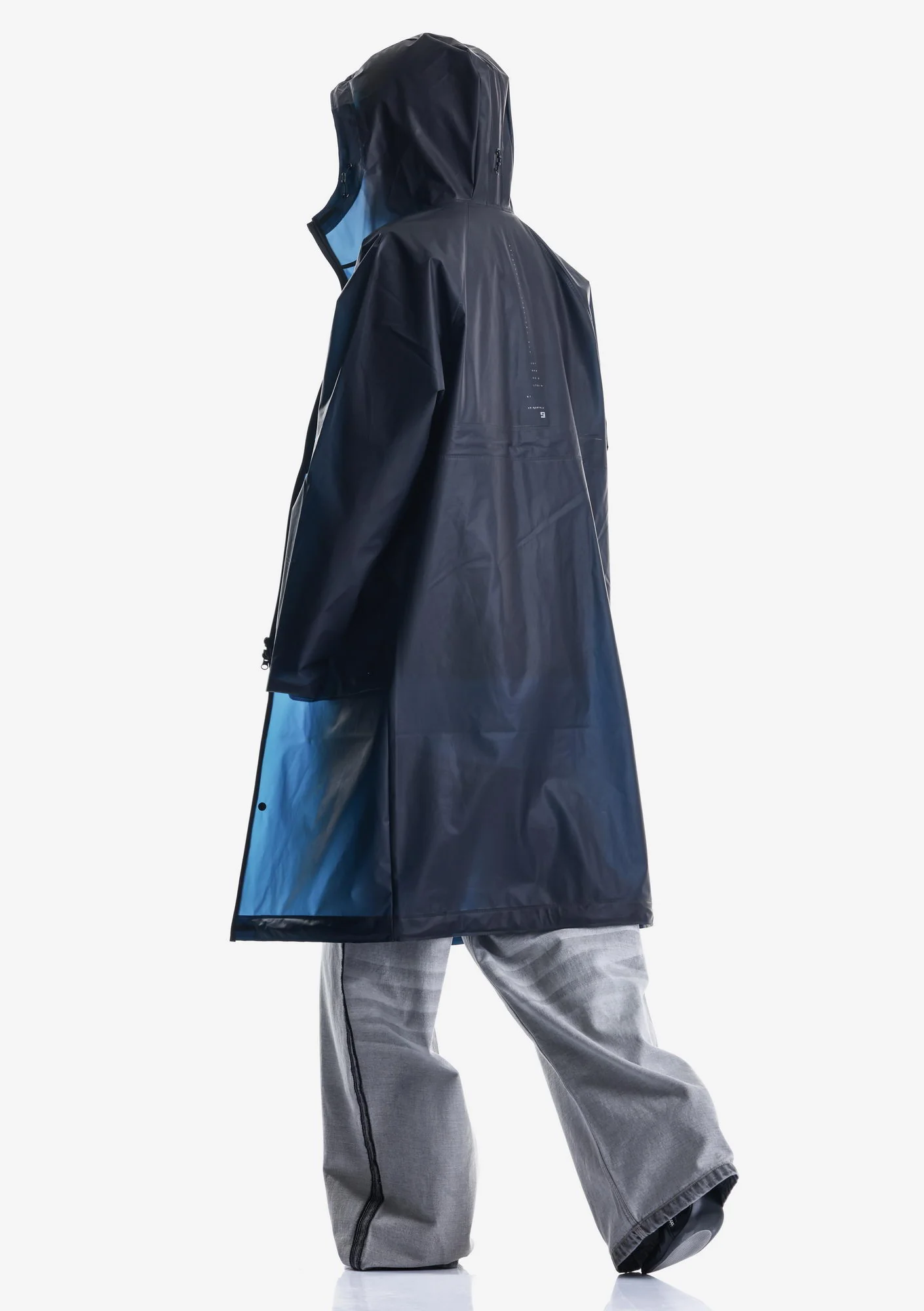 Дождевик-трансформер из полупрозрачного плотного водонепроницаемого полиуретана с герметизированными швами. Оснащён водозащитными карманами и регулируемой длиной, позволяющей носить этот дождевик в качестве длинного плаща и короткой куртки.