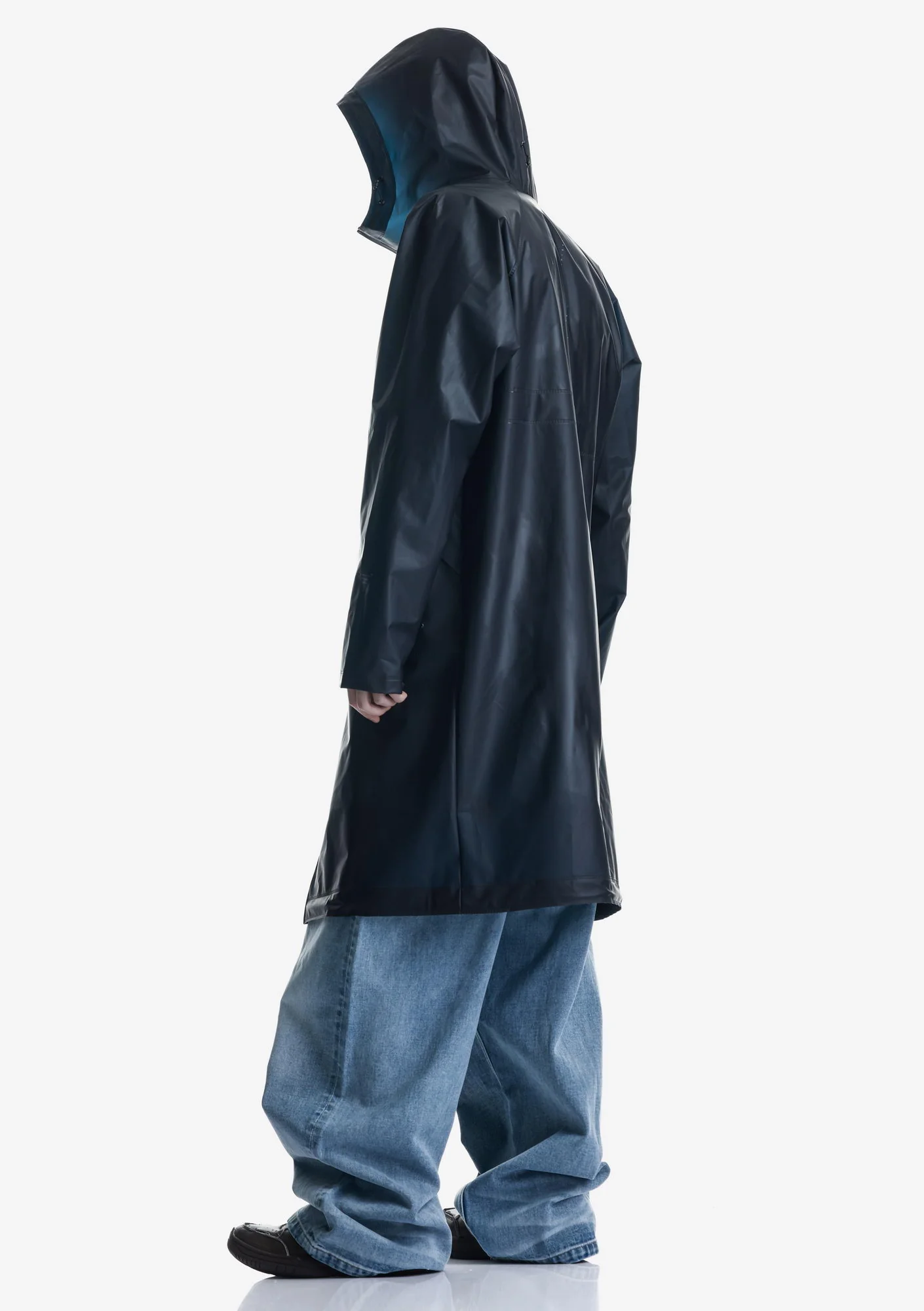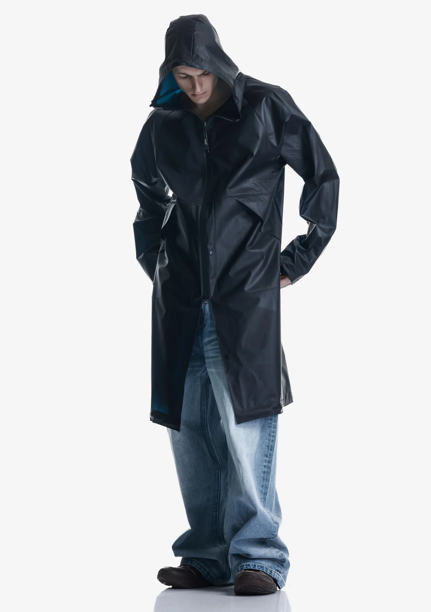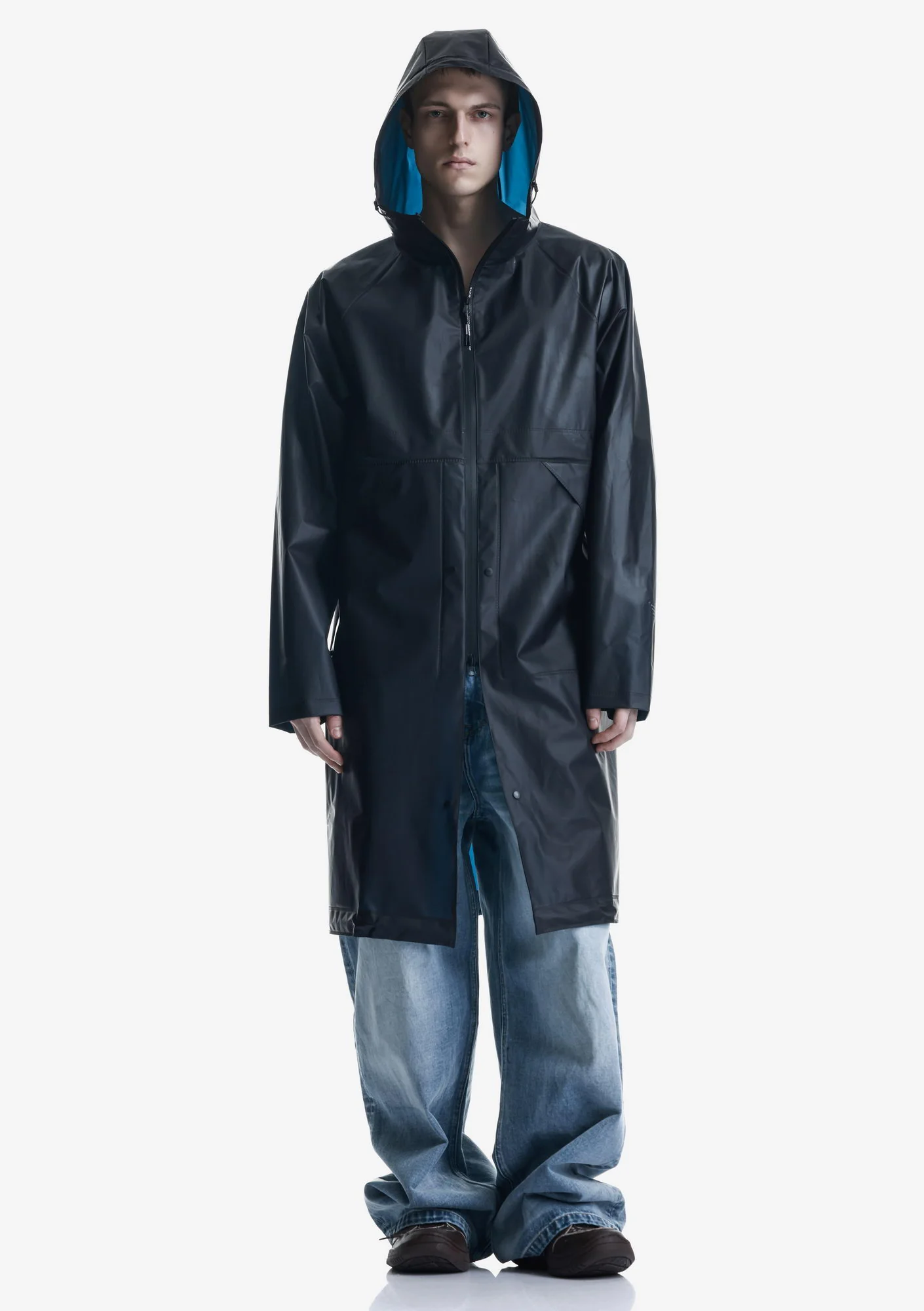 Дождевик-трансформер из полупрозрачного плотного водонепроницаемого полиуретана с герметизированными швами. Оснащён водозащитными карманами и регулируемой длиной, позволяющей носить этот дождевик в качестве длинного плаща и короткой куртки.
