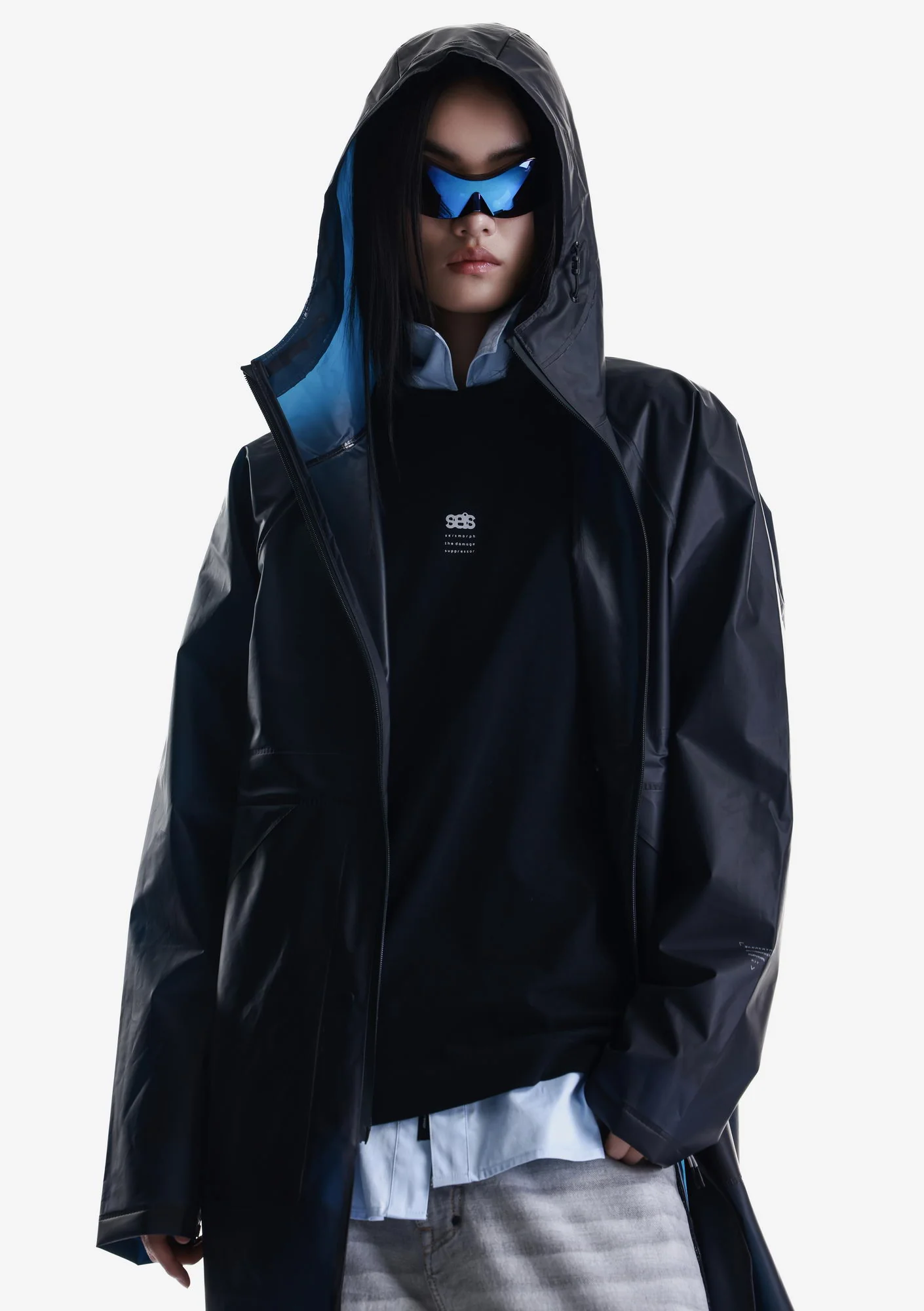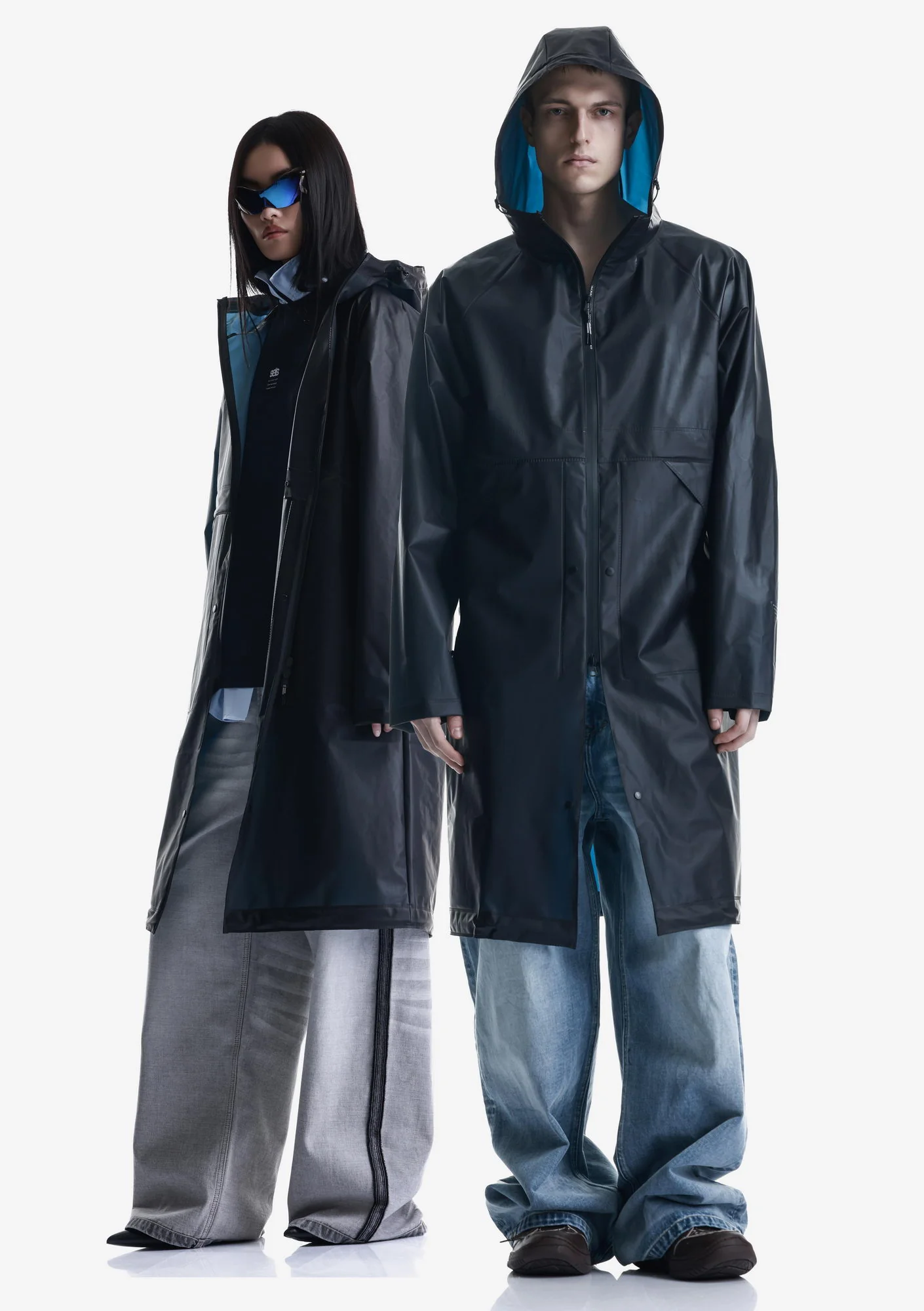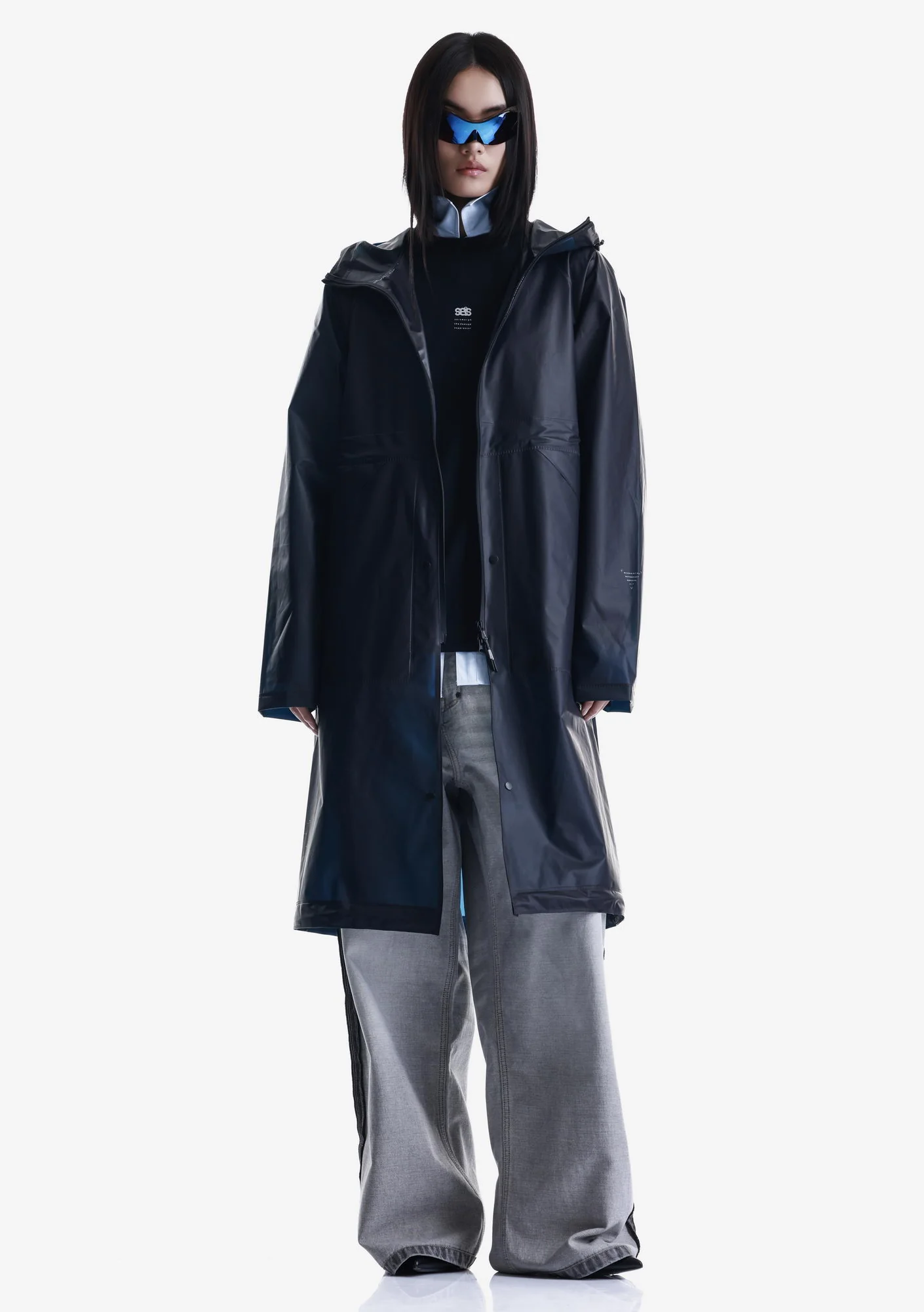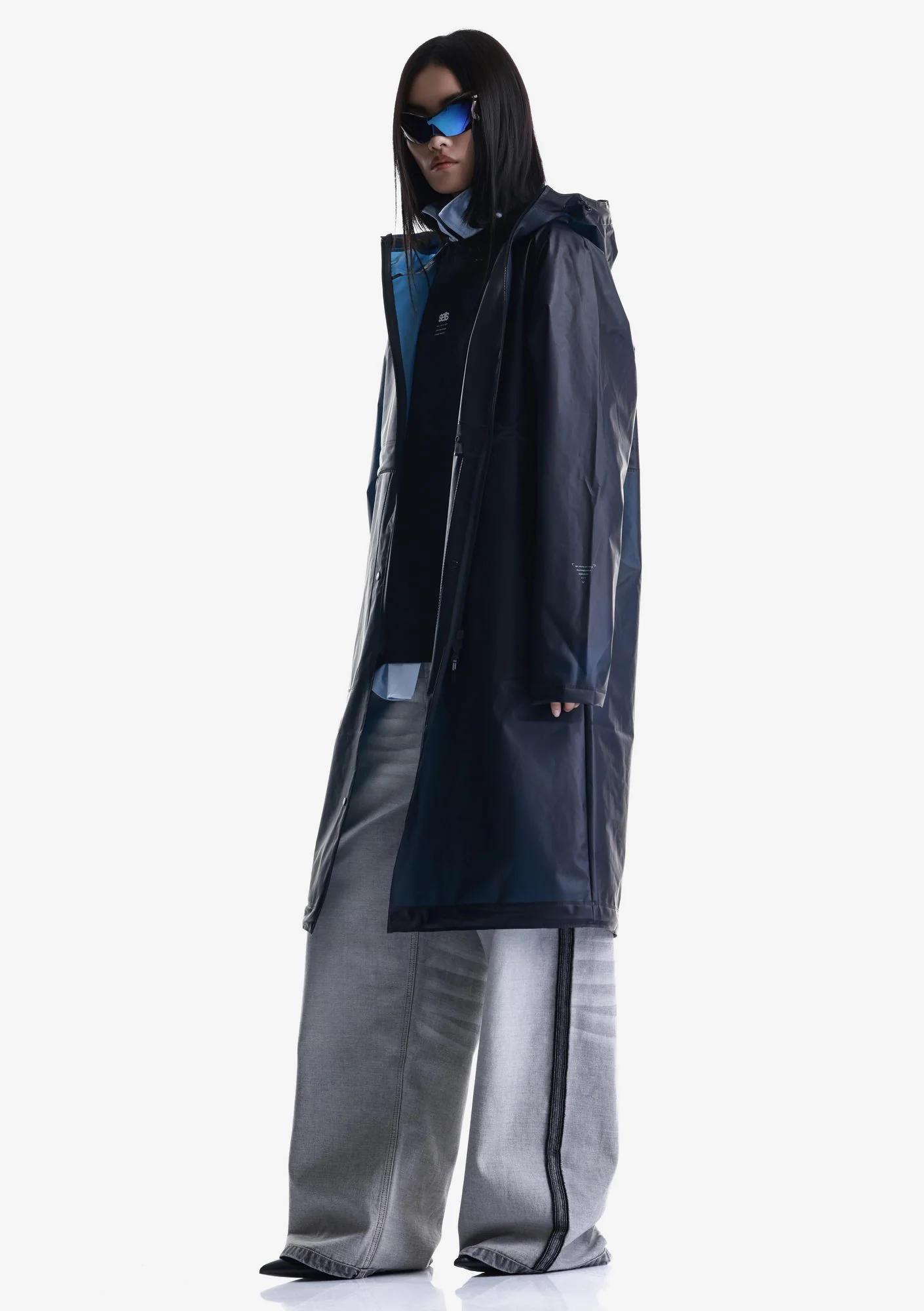 Дождевик-трансформер из полупрозрачного плотного водонепроницаемого полиуретана с герметизированными швами. Оснащён водозащитными карманами и регулируемой длиной, позволяющей носить этот дождевик в качестве длинного плаща и короткой куртки.