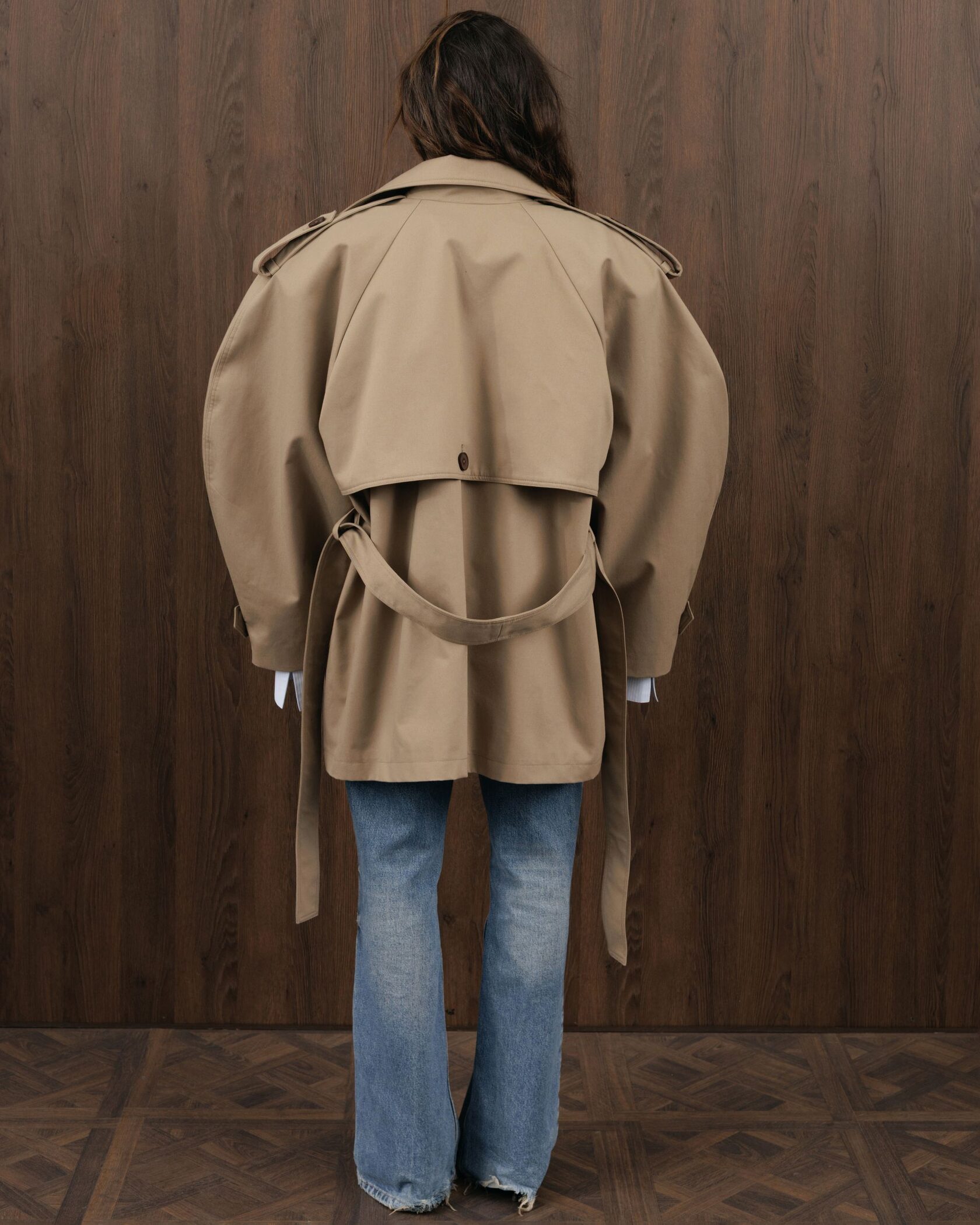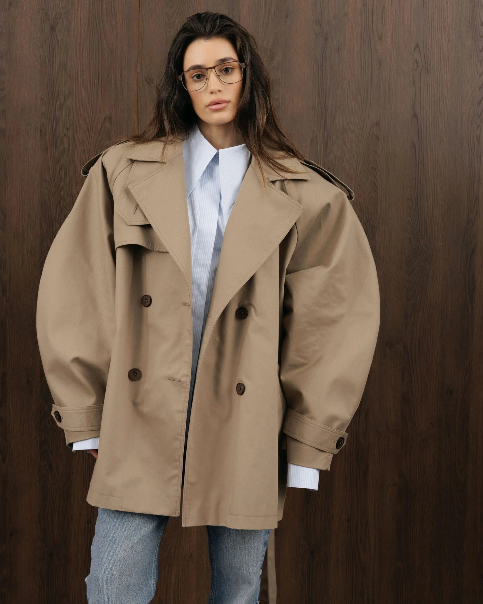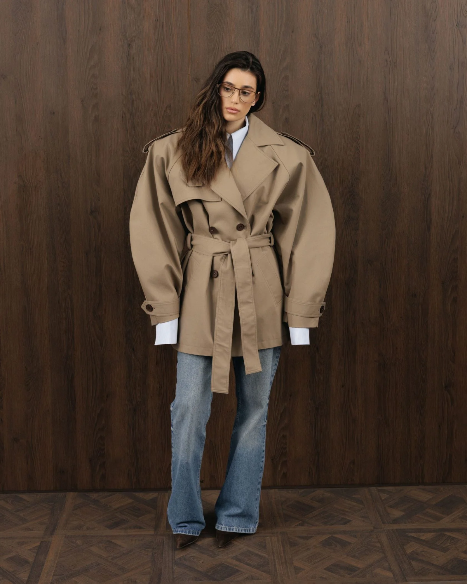 Тренч в бежево-сером оттенке — современная интерпретация классики. Объёмный силуэт с акцентными рукавами и поясом подчёркивает талию и создаёт выразительный образ. Двубортная застёжка, отложной воротник и продуманные детали делают модель универсальной для повседневных и более собранных образов. Выполнен из водоотталкивающей ткани, что делает его практичным выбором для переменчивой погоды. Идеален для межсезонья и стильных городских выходов.