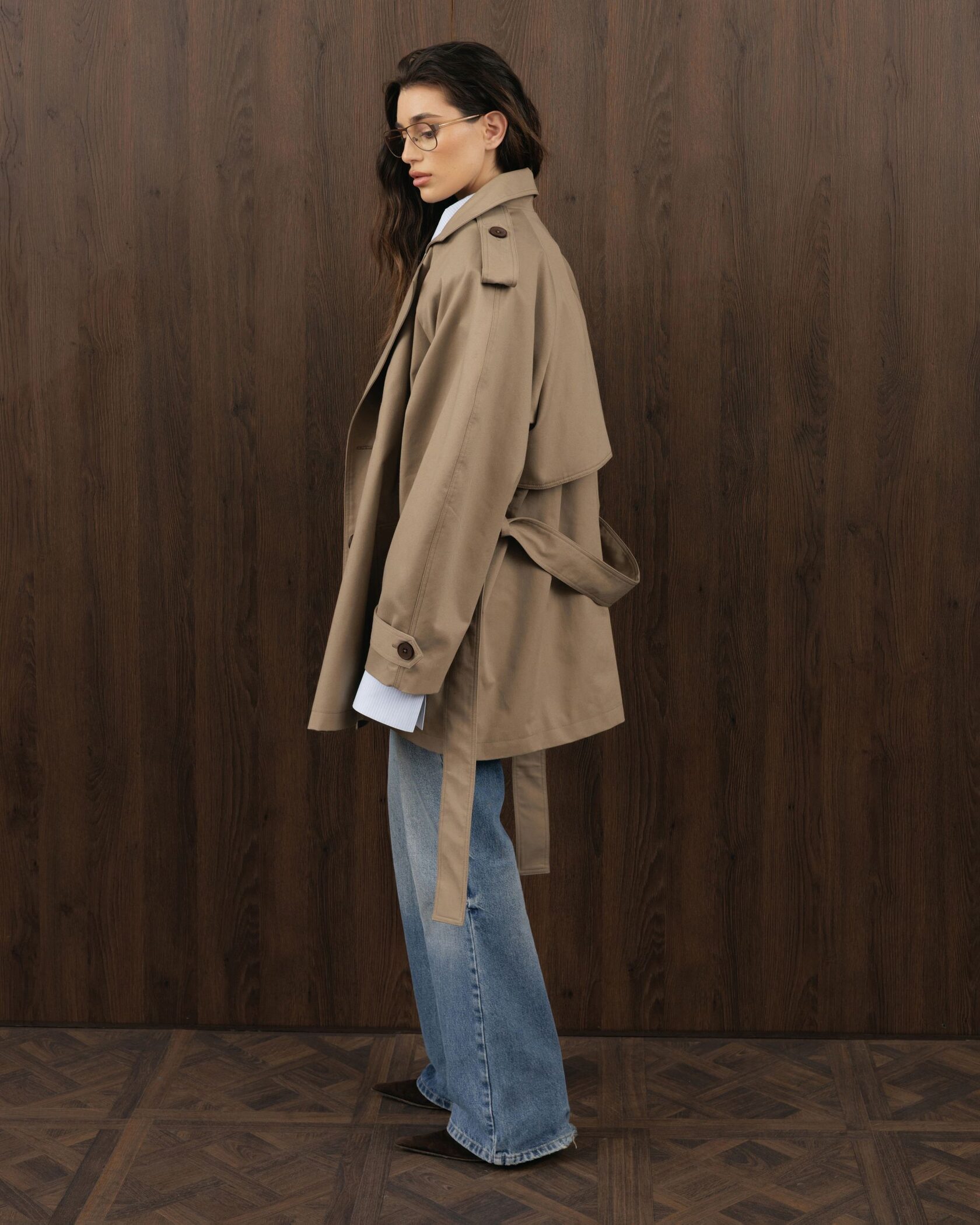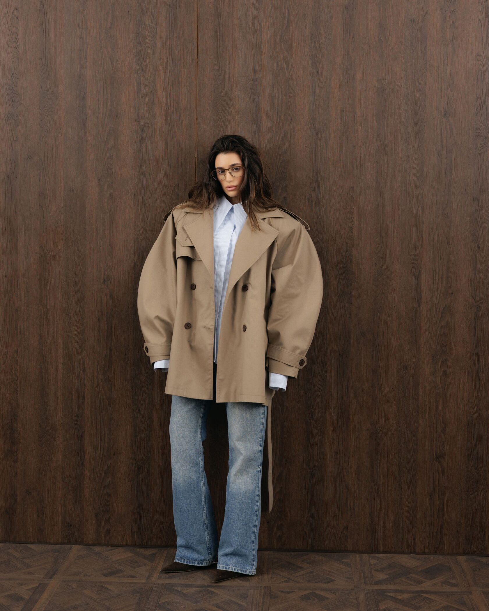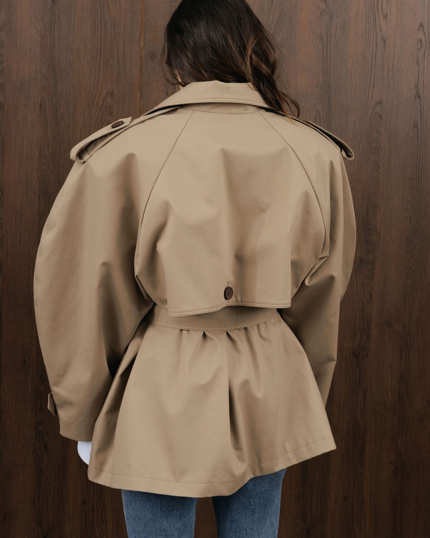 Тренч в бежево-сером оттенке — современная интерпретация классики. Объёмный силуэт с акцентными рукавами и поясом подчёркивает талию и создаёт выразительный образ. Двубортная застёжка, отложной воротник и продуманные детали делают модель универсальной для повседневных и более собранных образов. Выполнен из водоотталкивающей ткани, что делает его практичным выбором для переменчивой погоды. Идеален для межсезонья и стильных городских выходов.