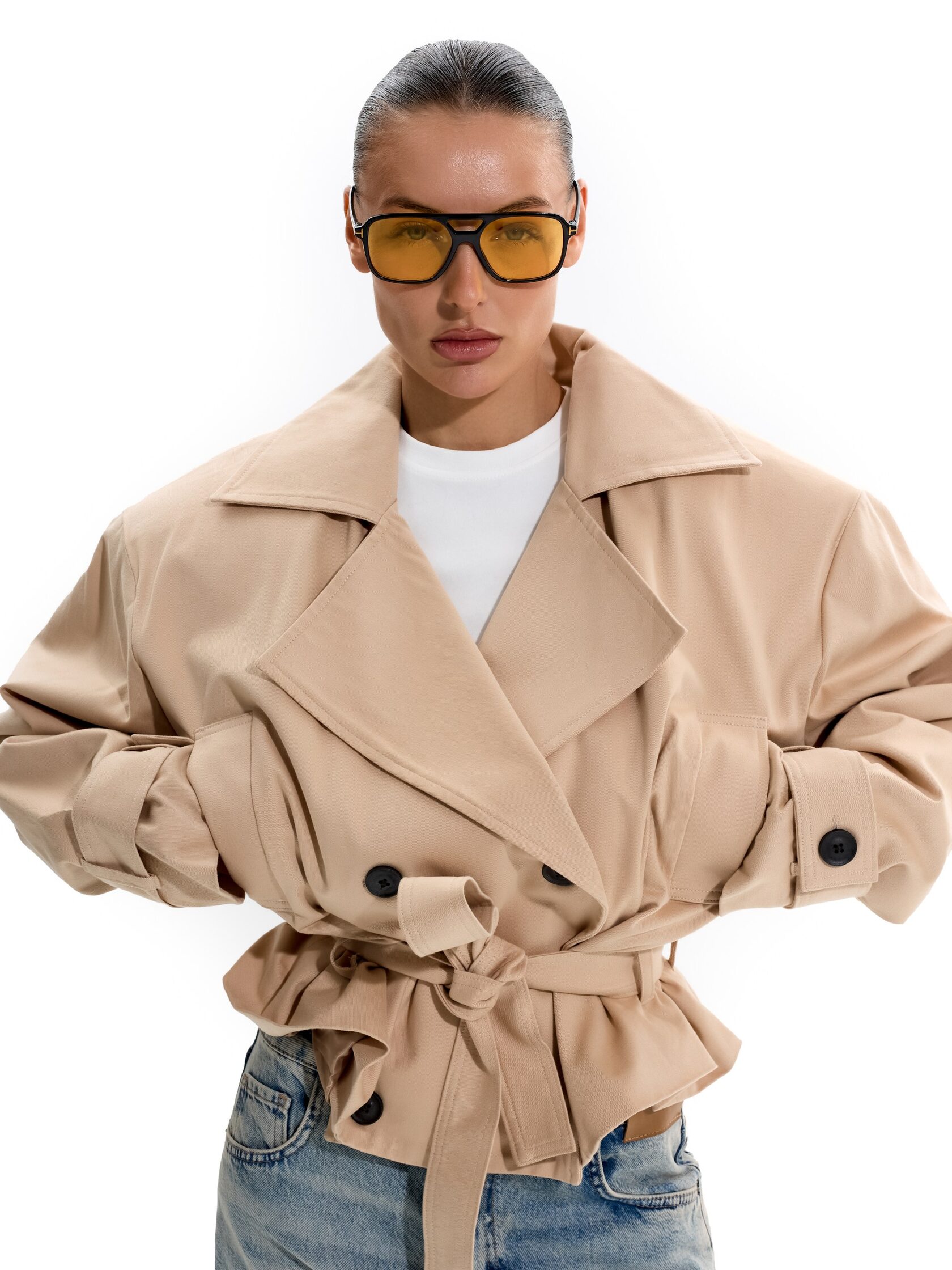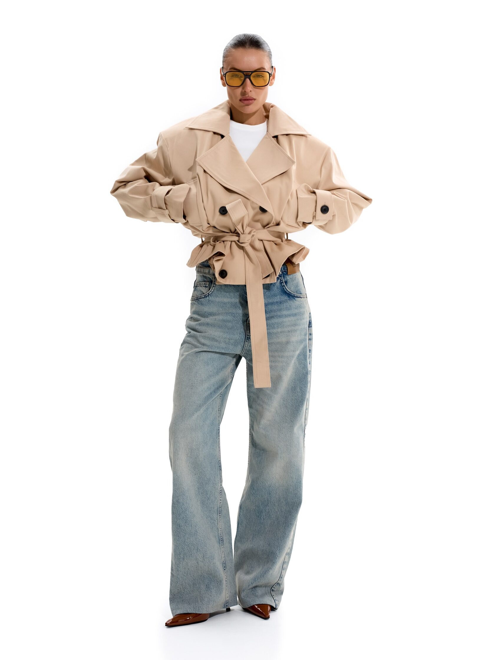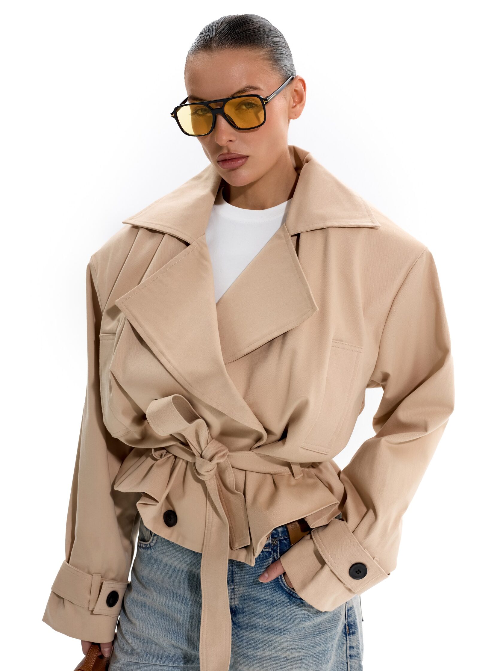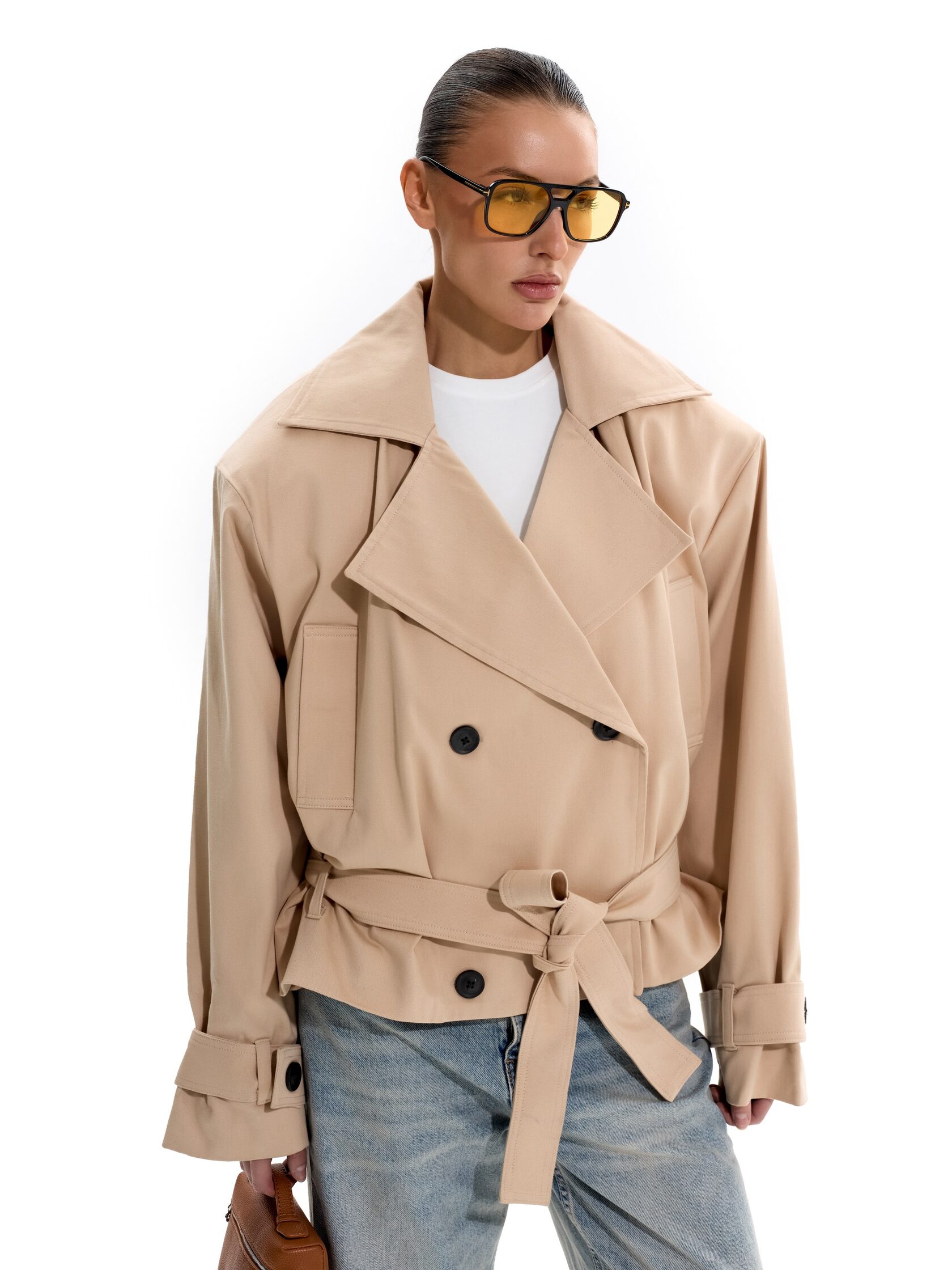 Укороченный тренч с объемными плечами